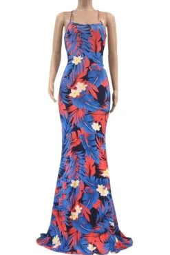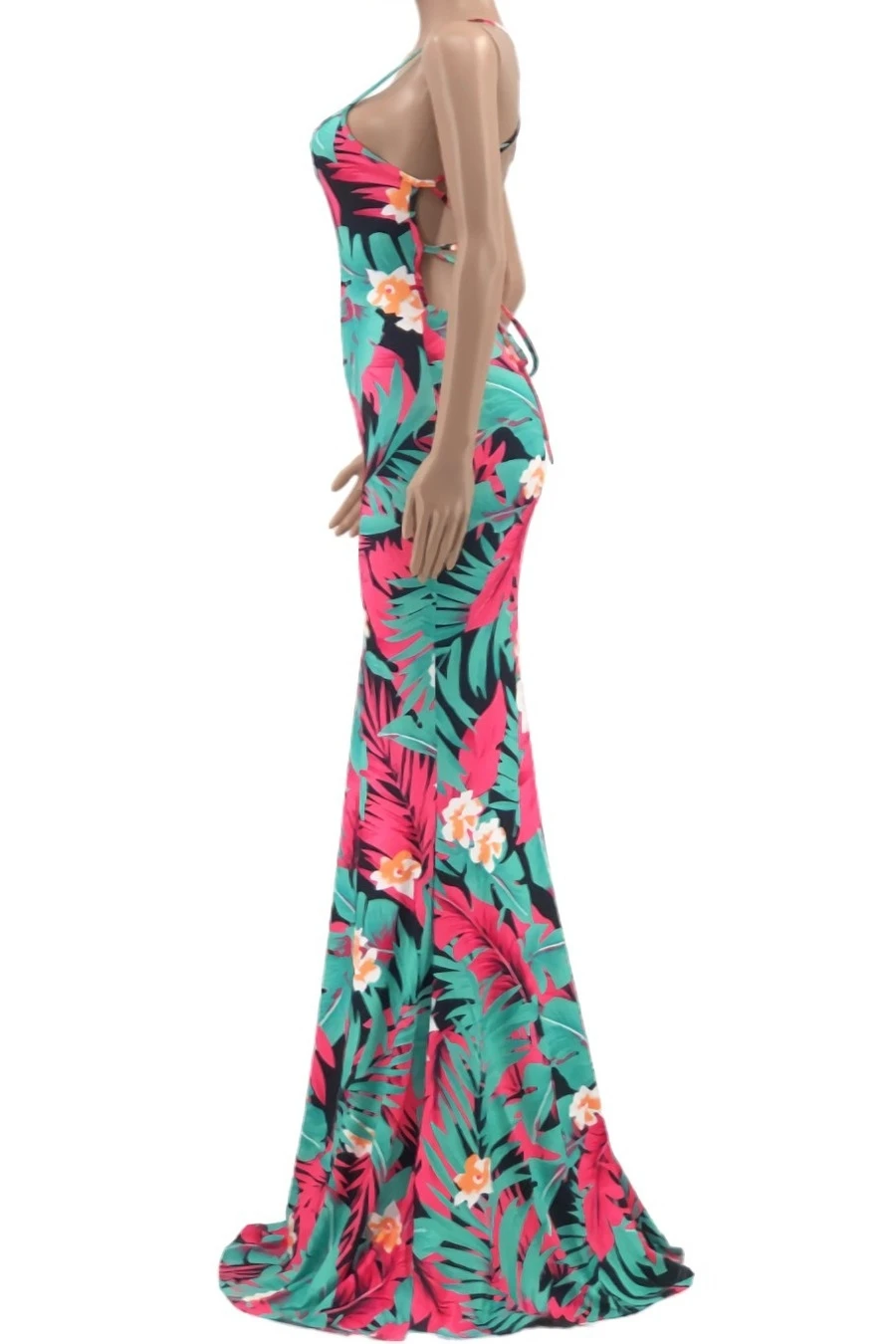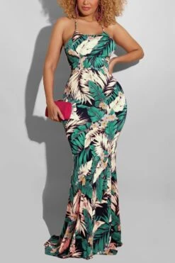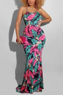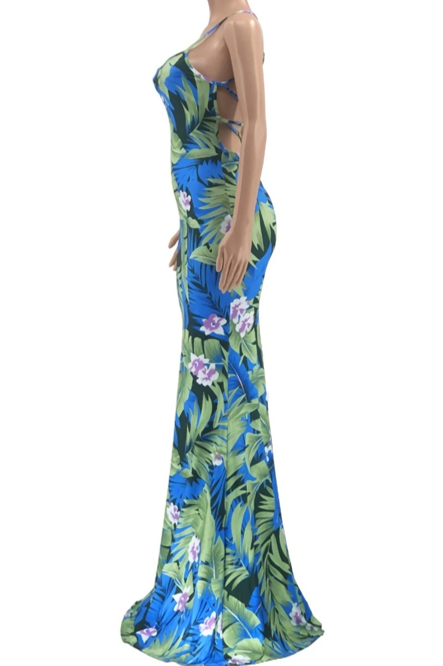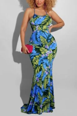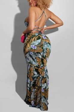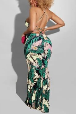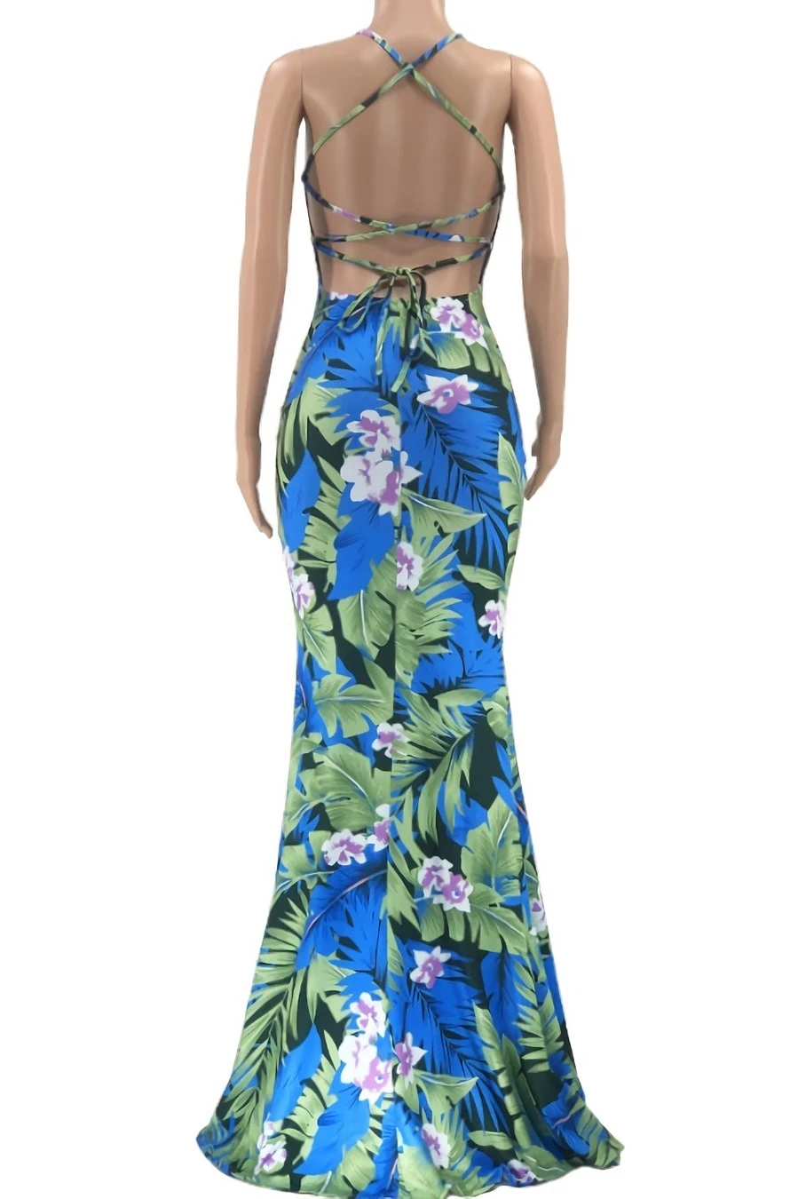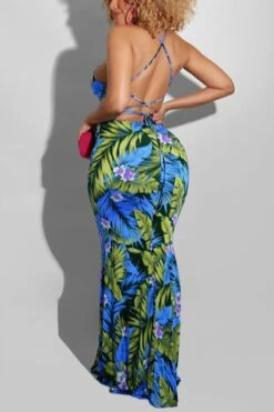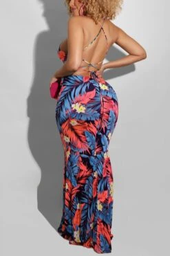 S-5XL summer new stylish five colors leaf flower printing backless lace-up stretch slim sexy maxi dress
