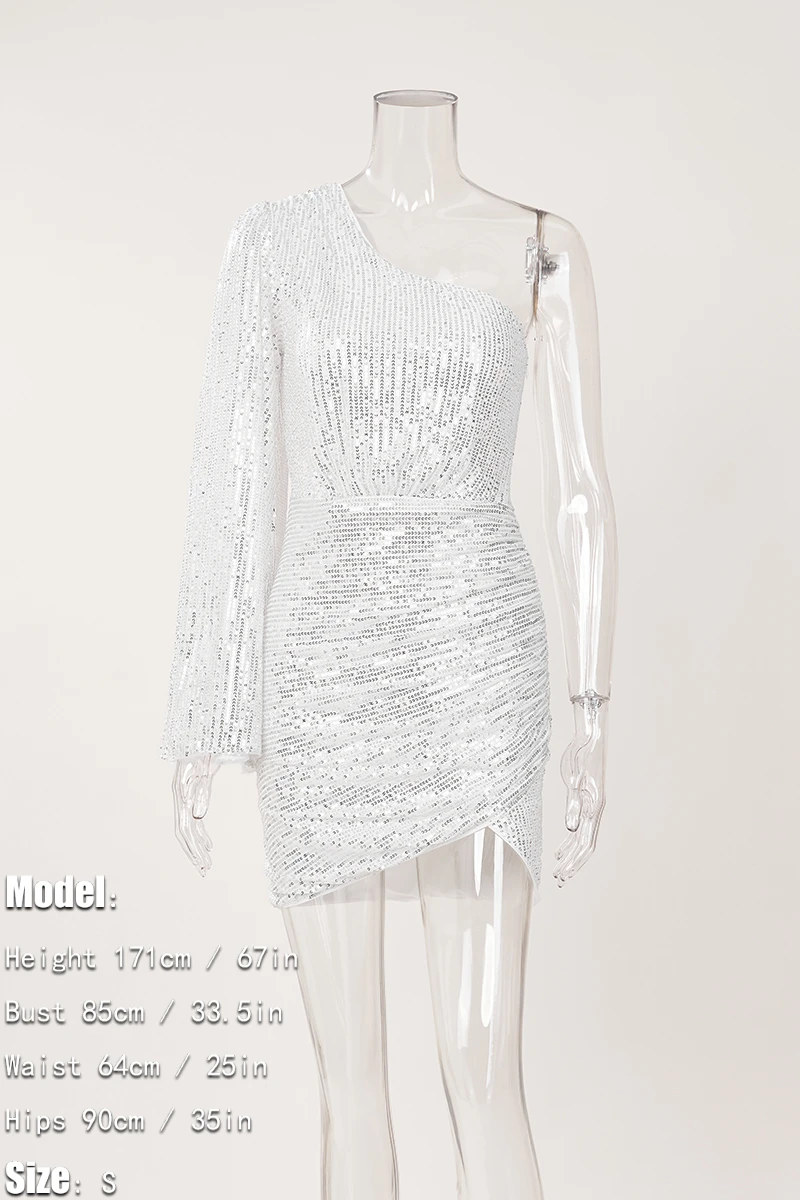 Sexy extra small inelastic sequin flared sleeves one shoulder mini dress