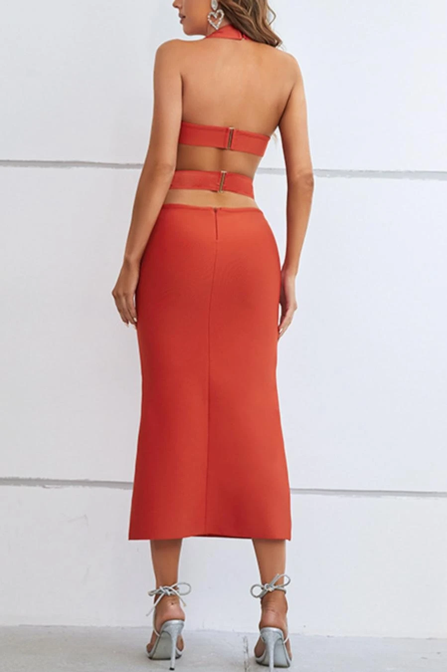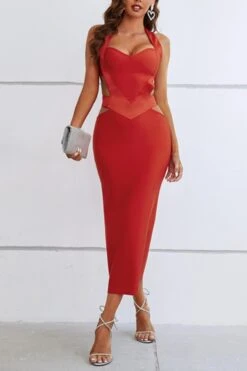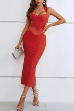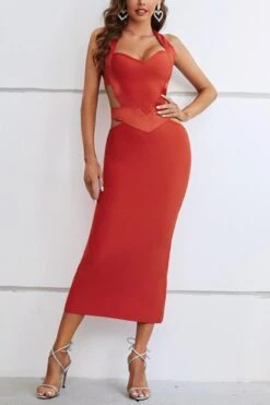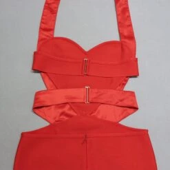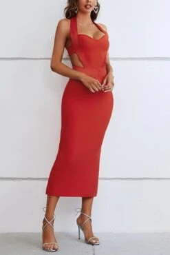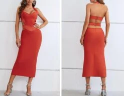 Sexy high stretch halter hollow metallic buckle backless slim midi dress