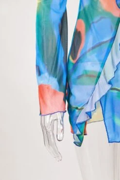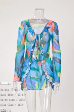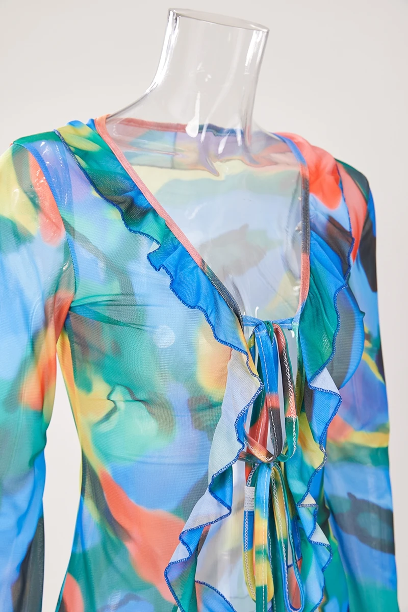 Sexy high stretch mesh tie-dye printing ruffle lace-up slim mini dress #1