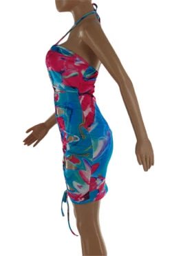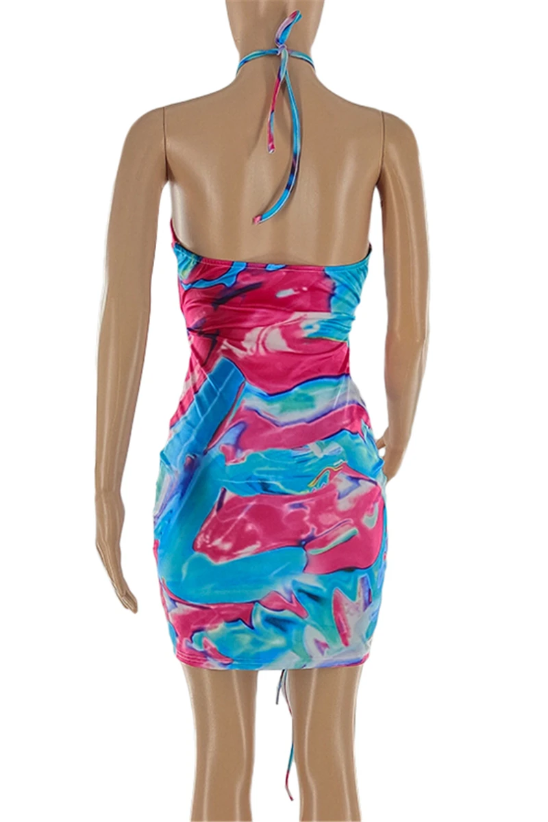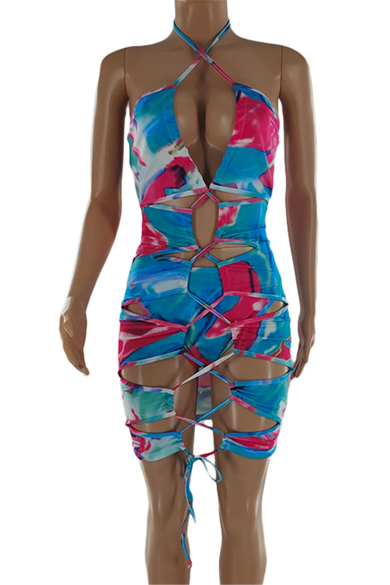 Sexy night club style batch printing halter-neck hollow bandage slim mini dress(with panty)#3#