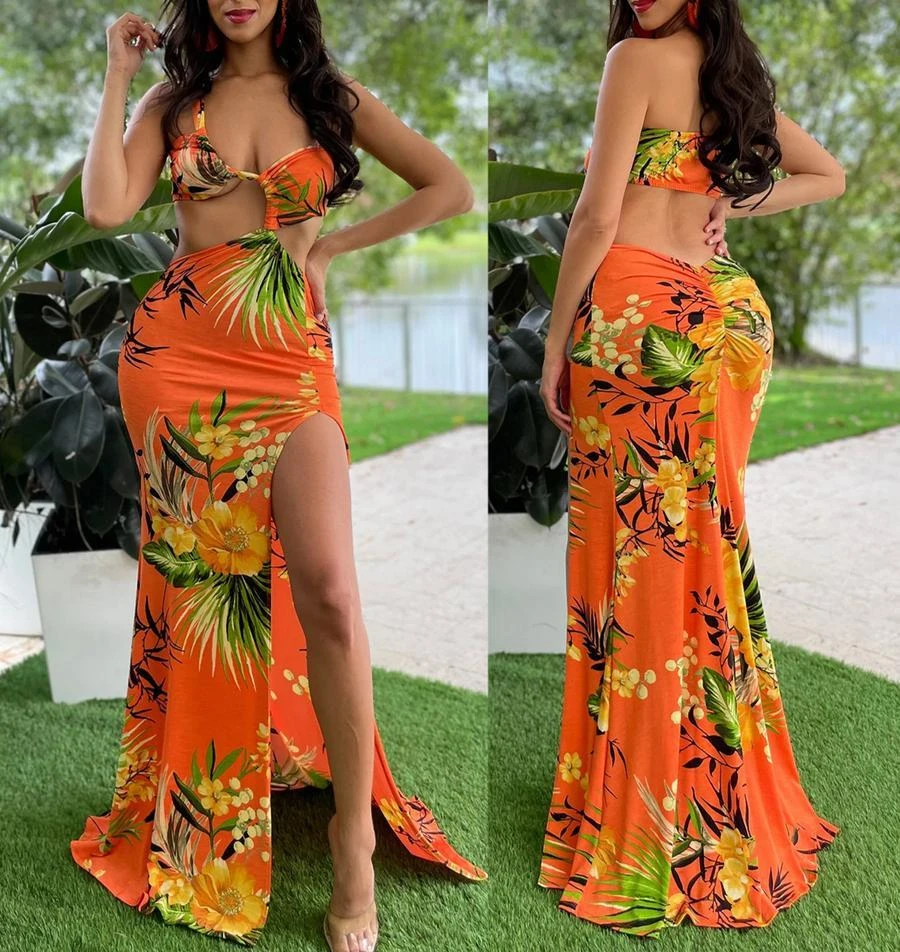 Sexy plus size non-stretch batch printing high slit shirring maxi dress#1