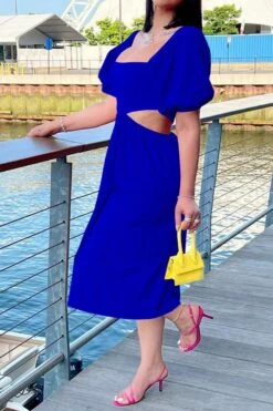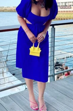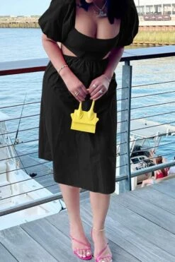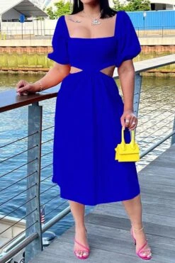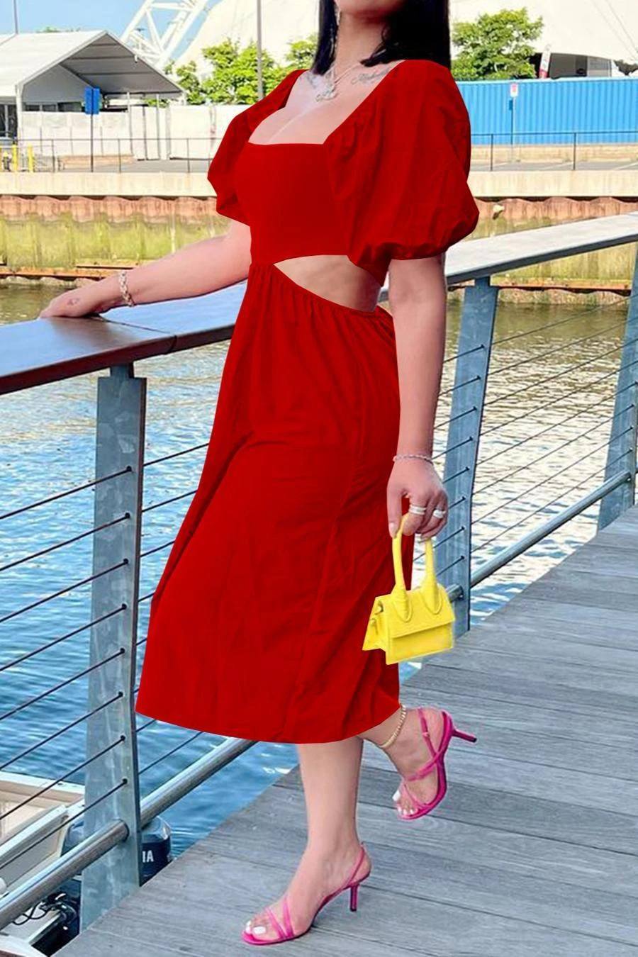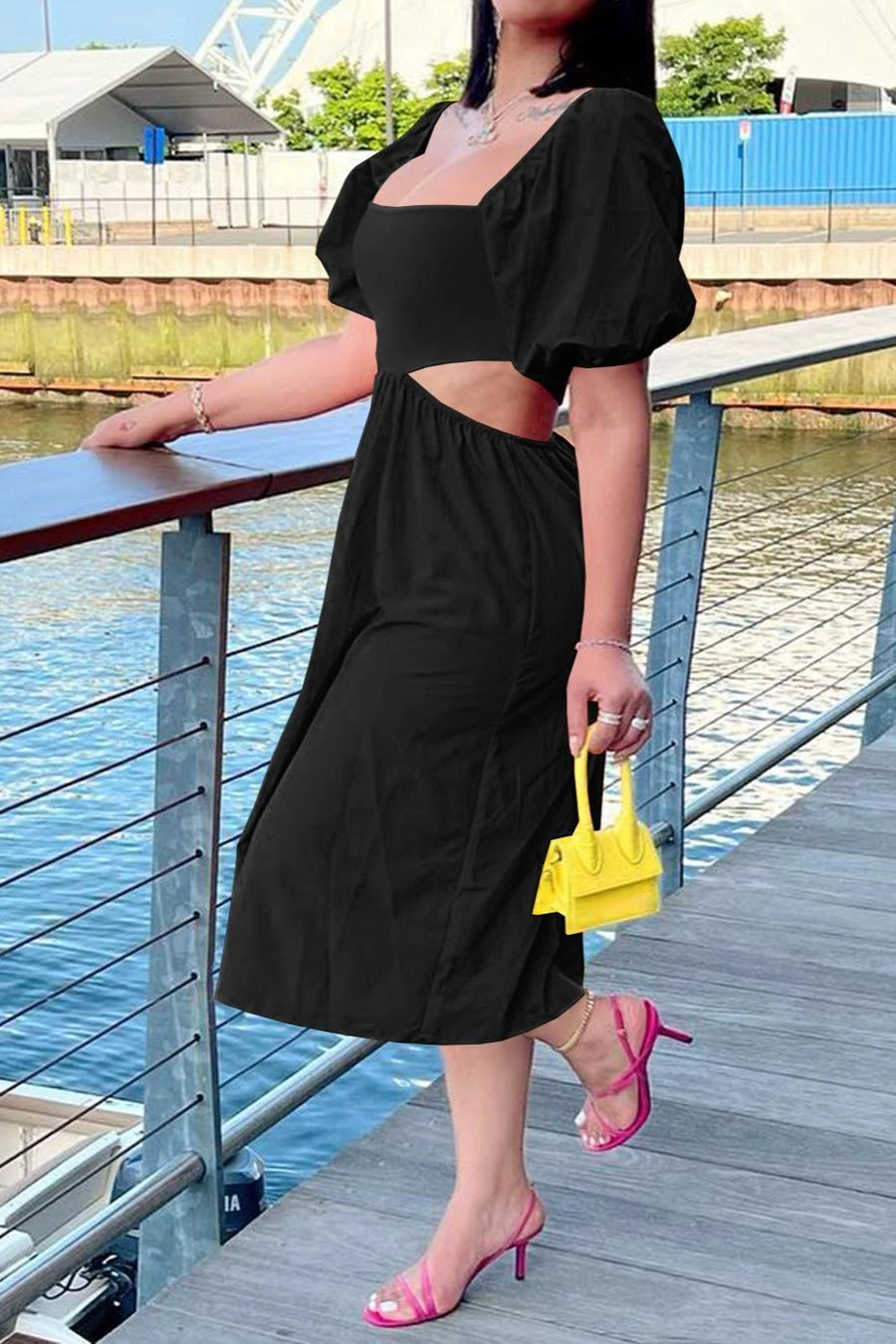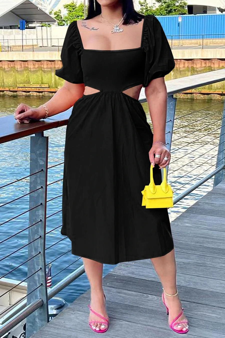 Sexy plus-size slight stretch 3-color u-neck balloon sleeve hollow midi dress