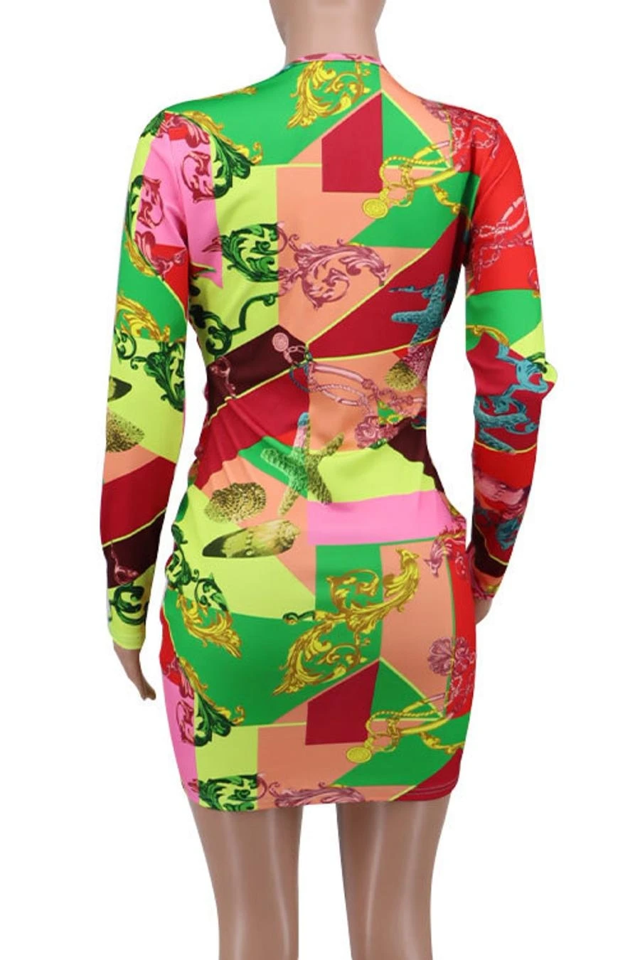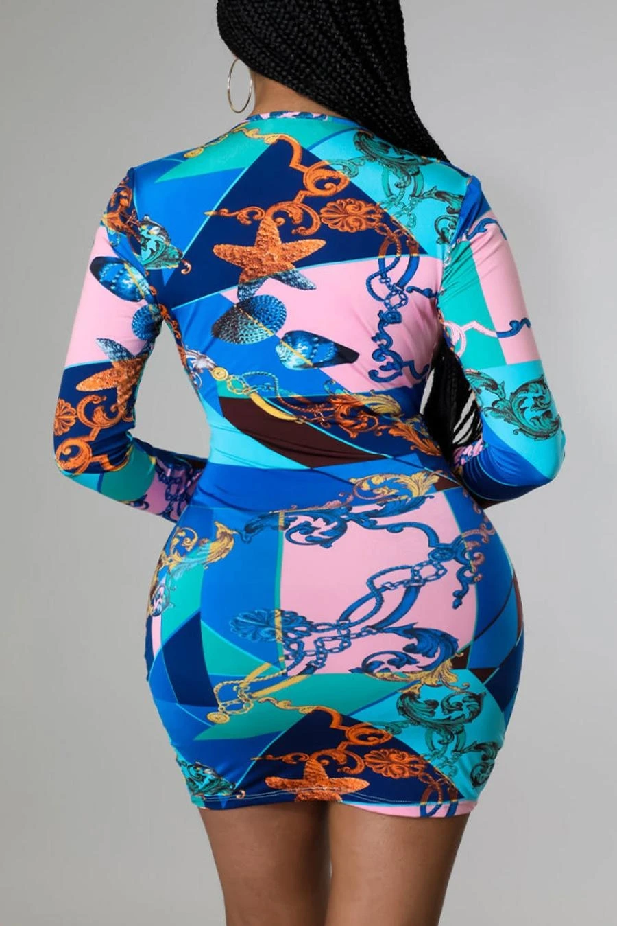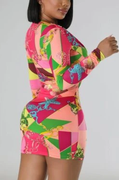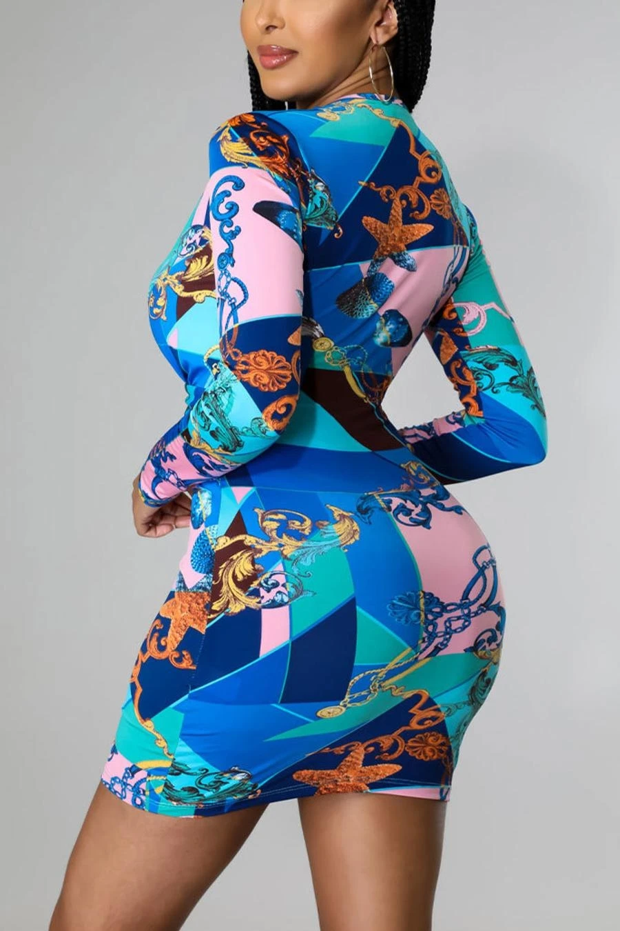 Sexy plus size slight stretch batch printing slim deep v mini dress
