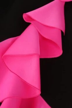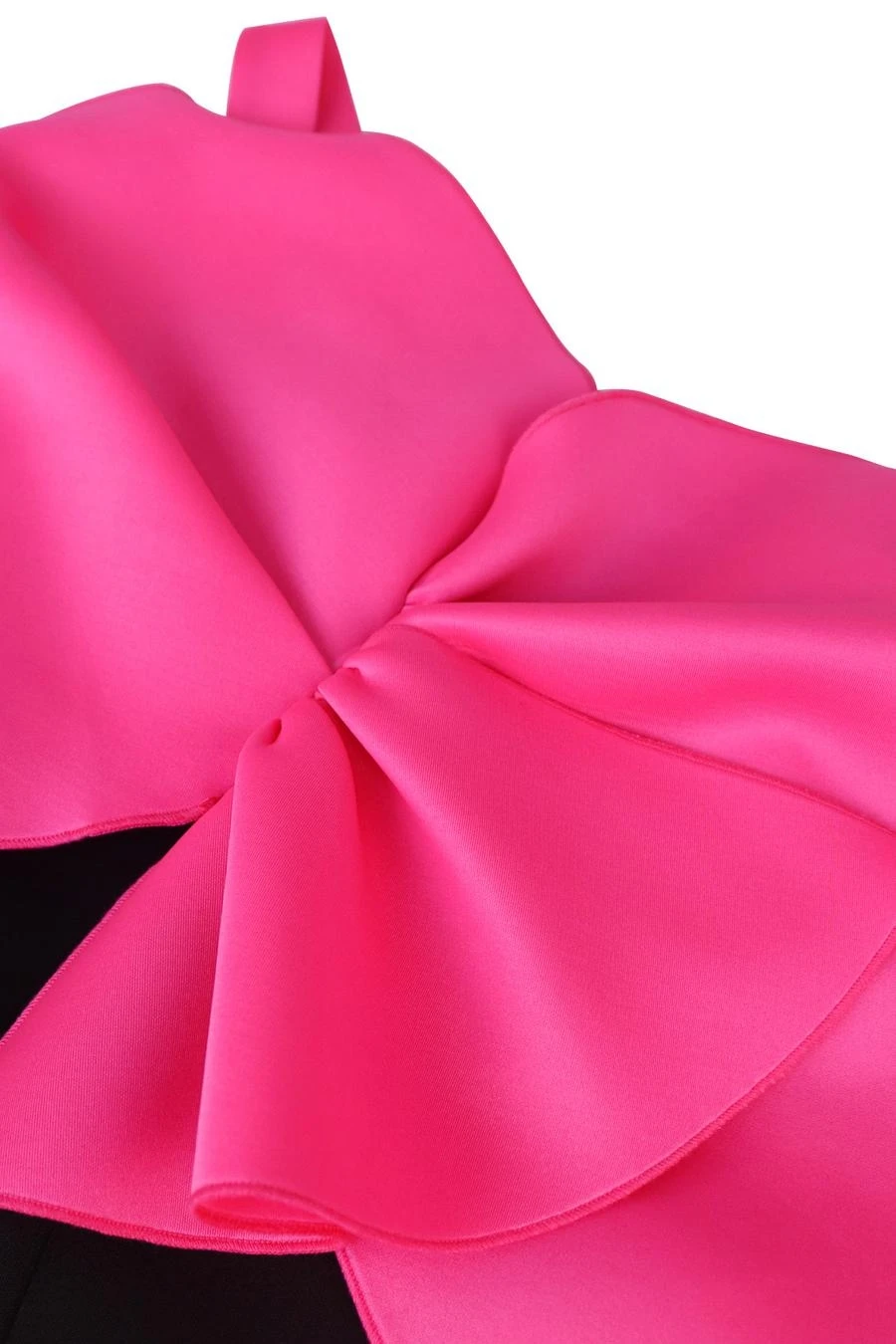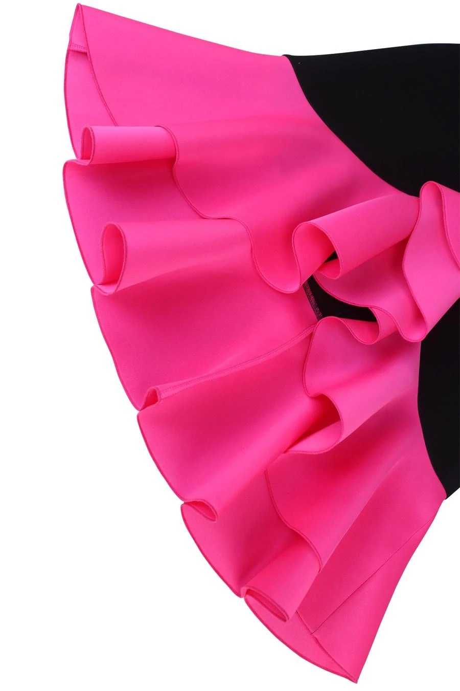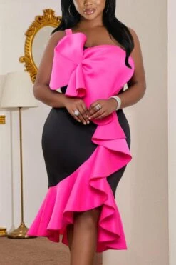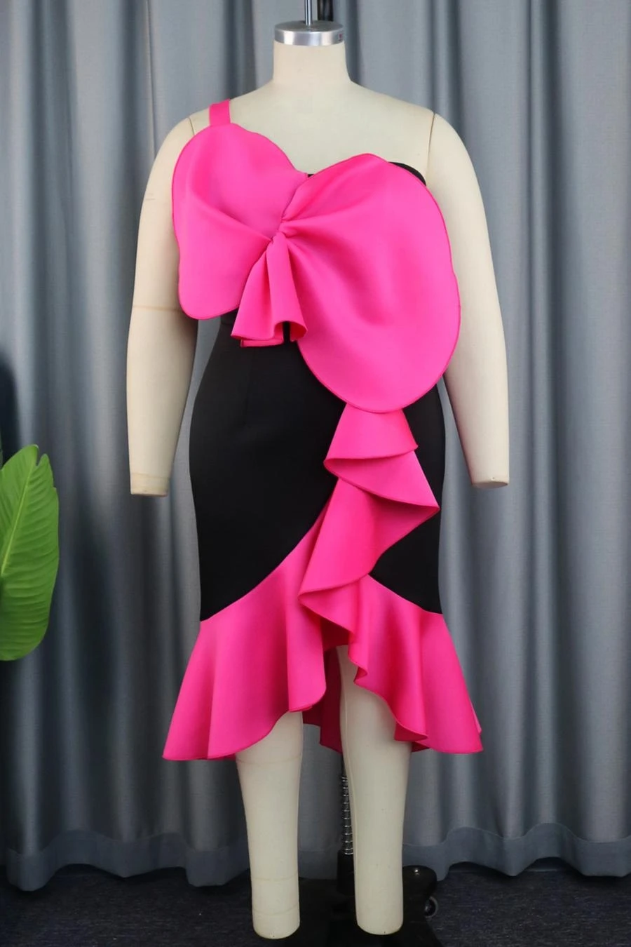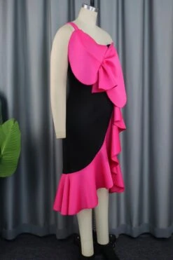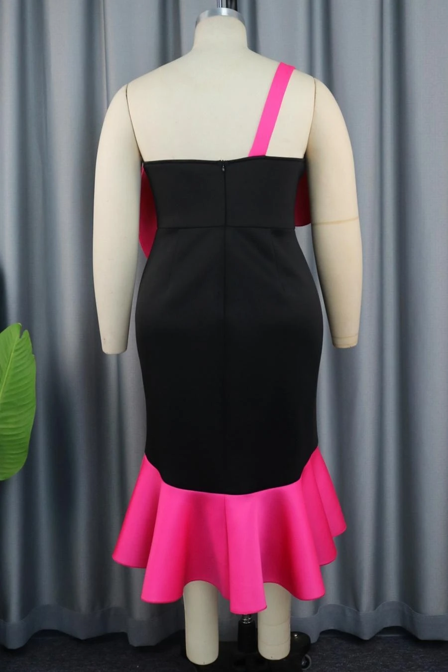 Sexy plus size slight stretch contrast color one shoulder ruffle midi dress