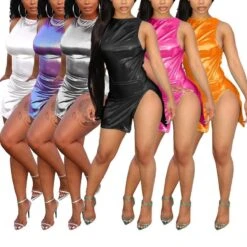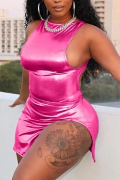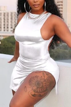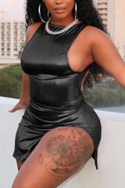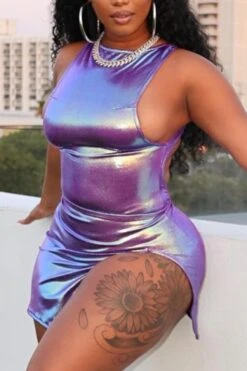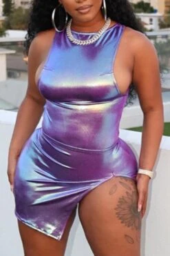 Sexy plus-size slight stretch holographic slit backless mini dress
