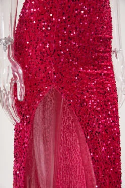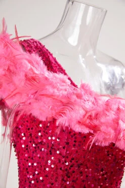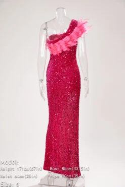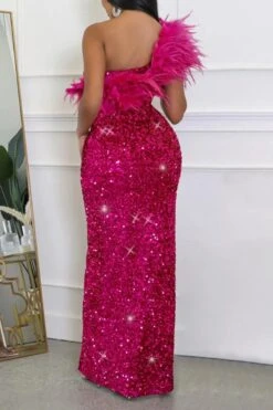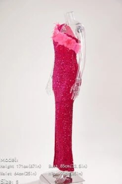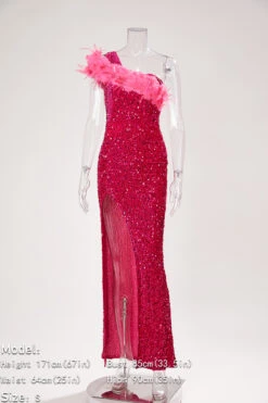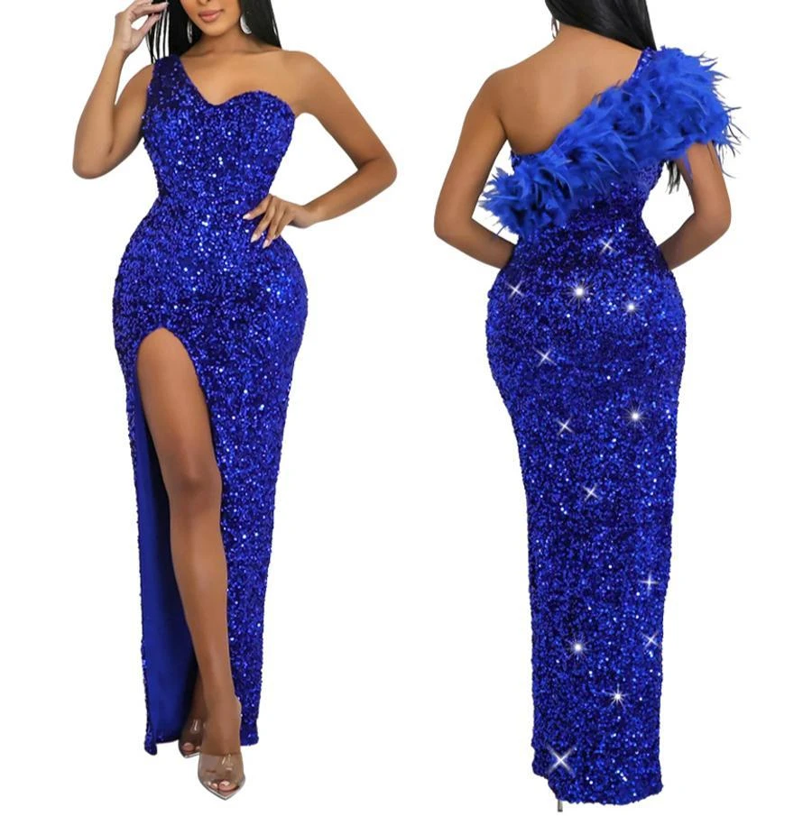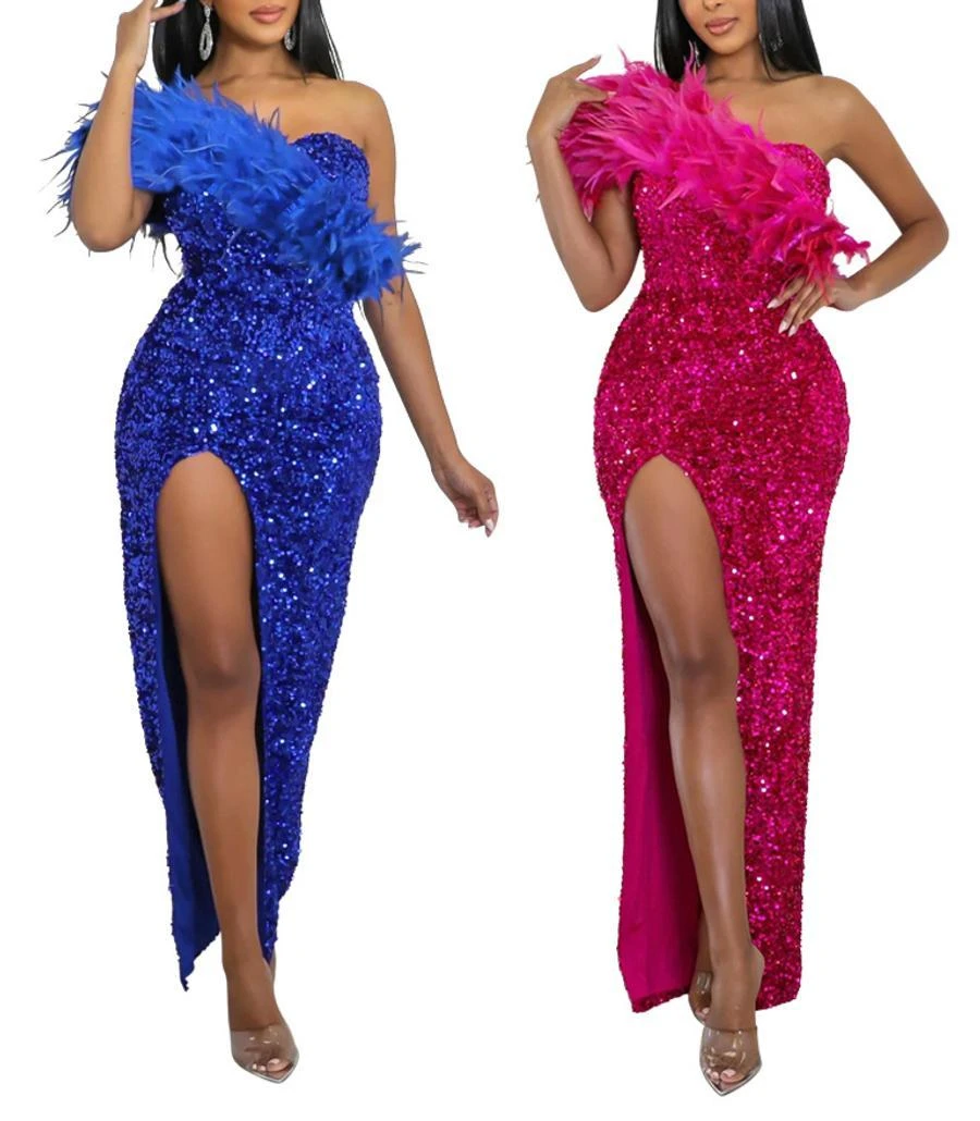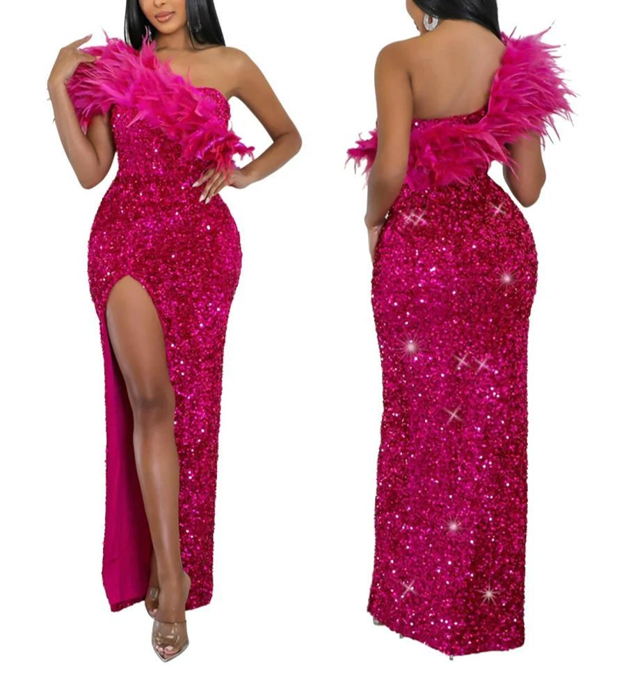Sexy plus size slight stretch one shoulder feather sequins high slit maxi dress