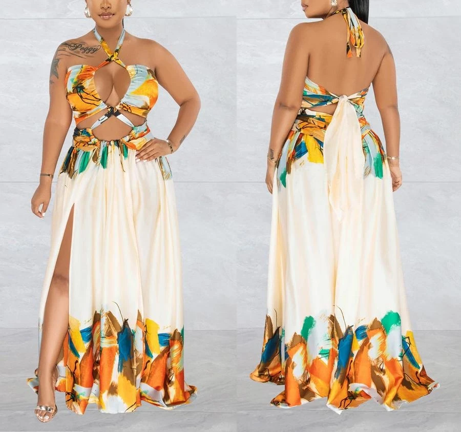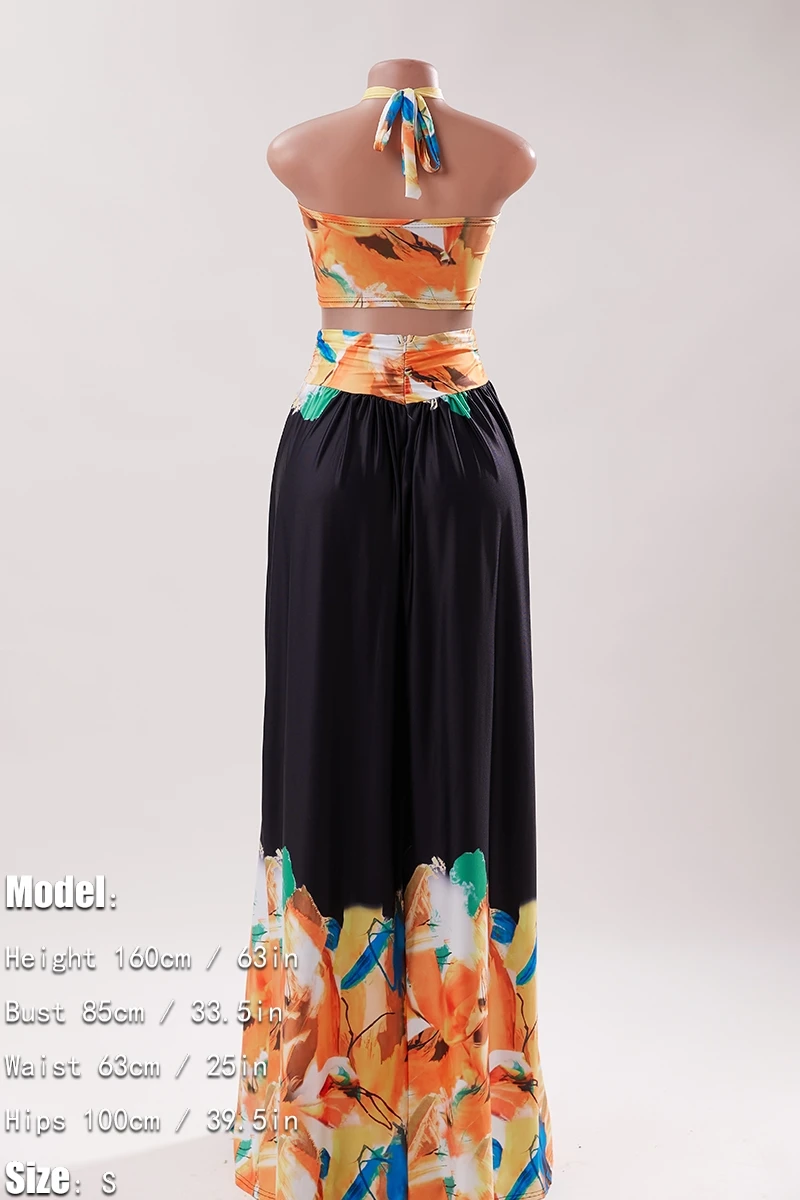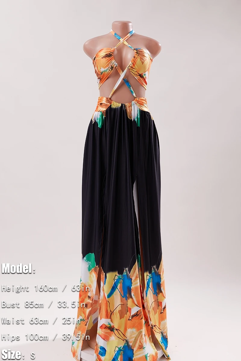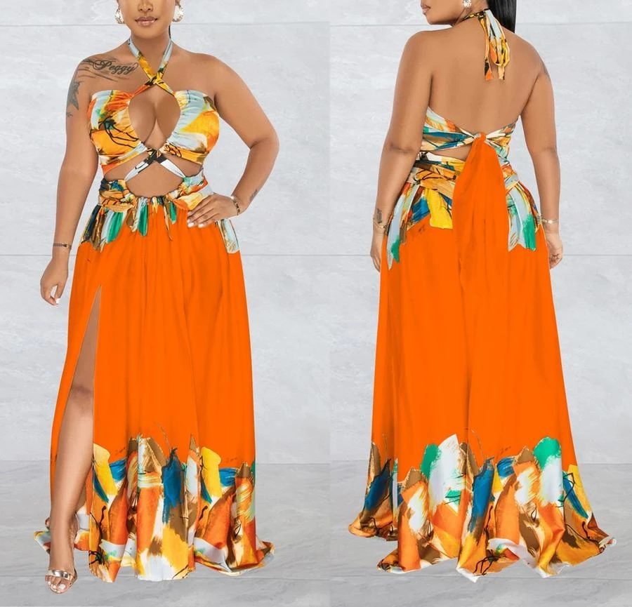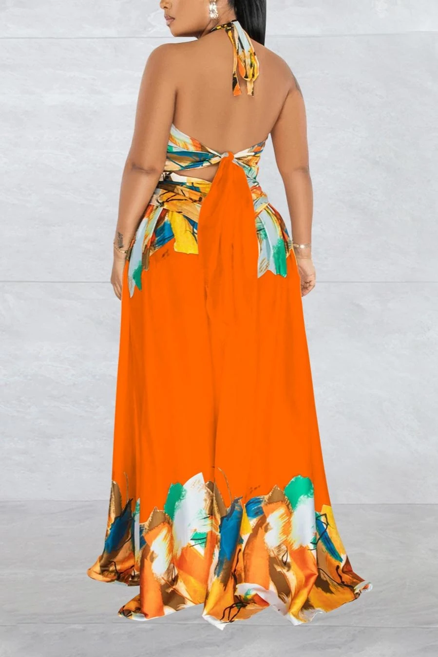 Sexy plus size slight stretch orange halter printing backless slit maxi dress(with bring)