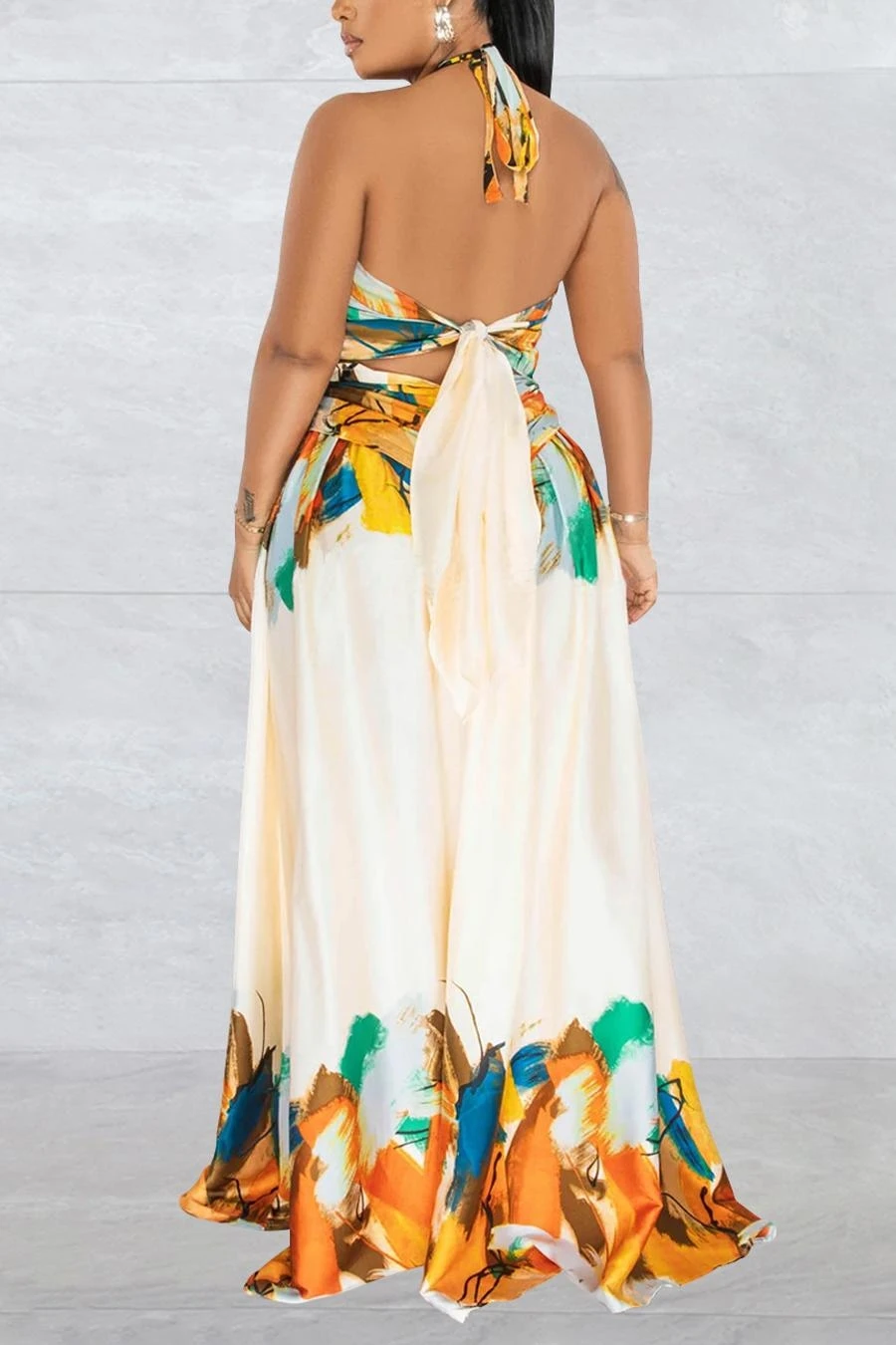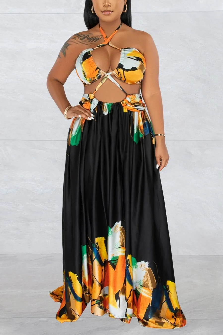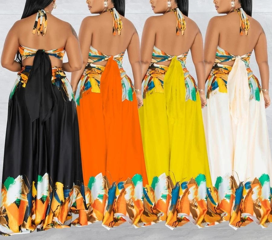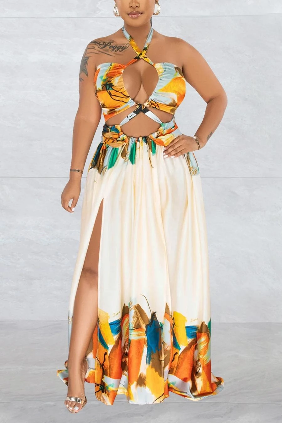 Sexy plus size slight stretch orange halter printing backless slit maxi dress(with bring)