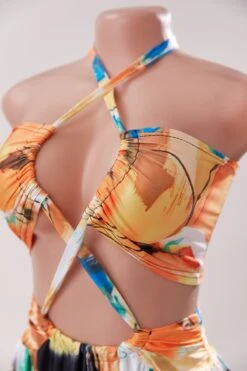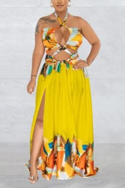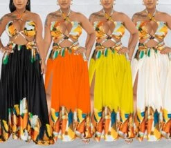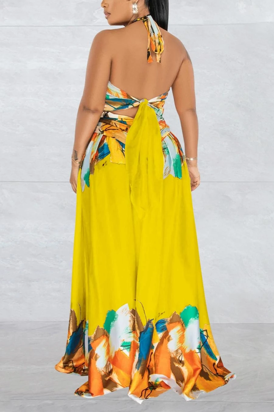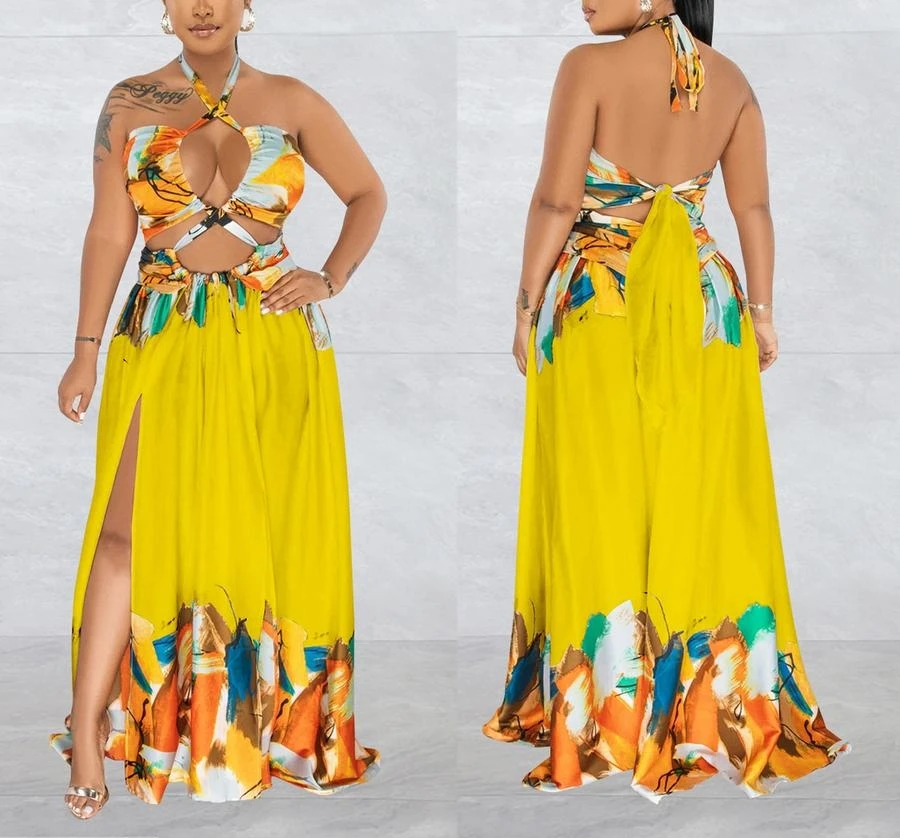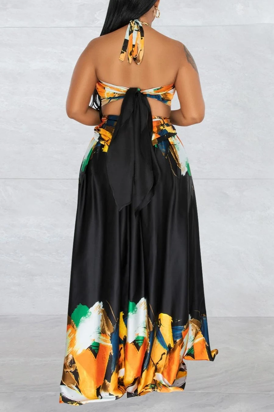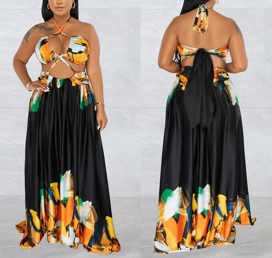 Sexy plus size slight stretch orange halter printing backless slit maxi dress(with bring)
