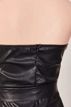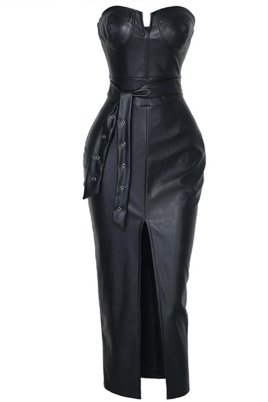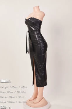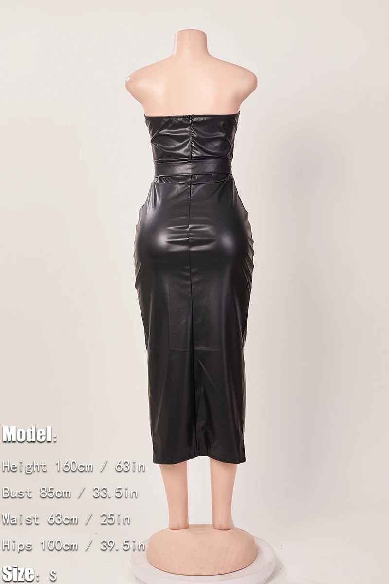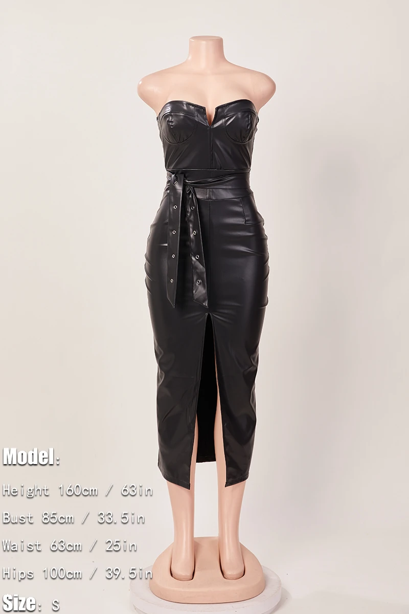 Sexy plus size slight stretch pu leather tube design slit midi dress with belt