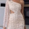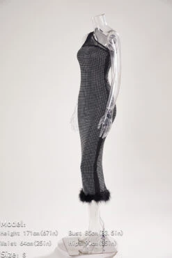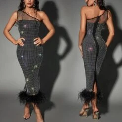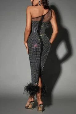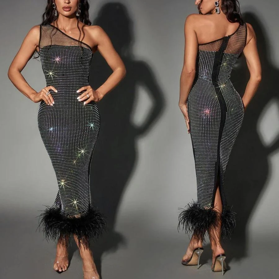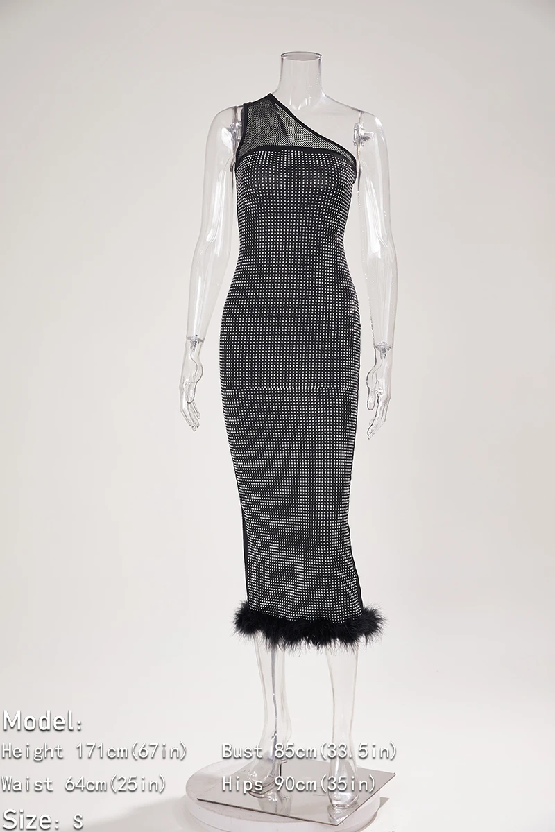 Sexy plus-size slight stretch rhinestone mesh one shoulder fuzzy slit midi dress