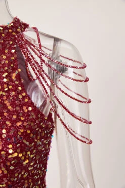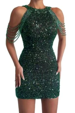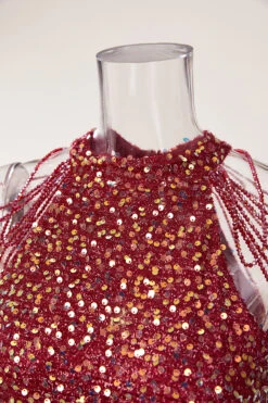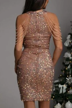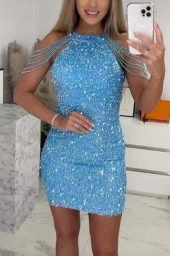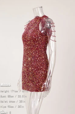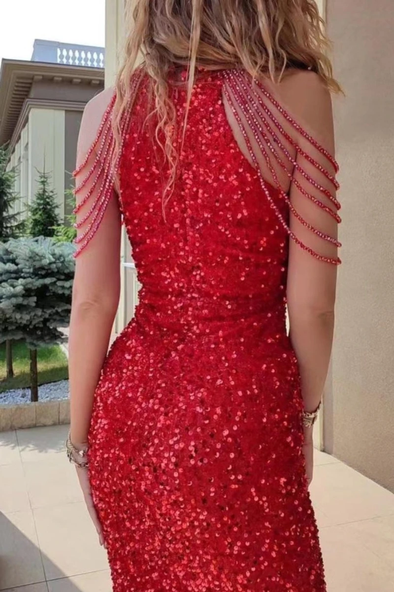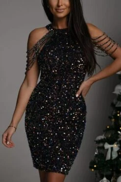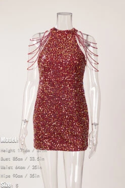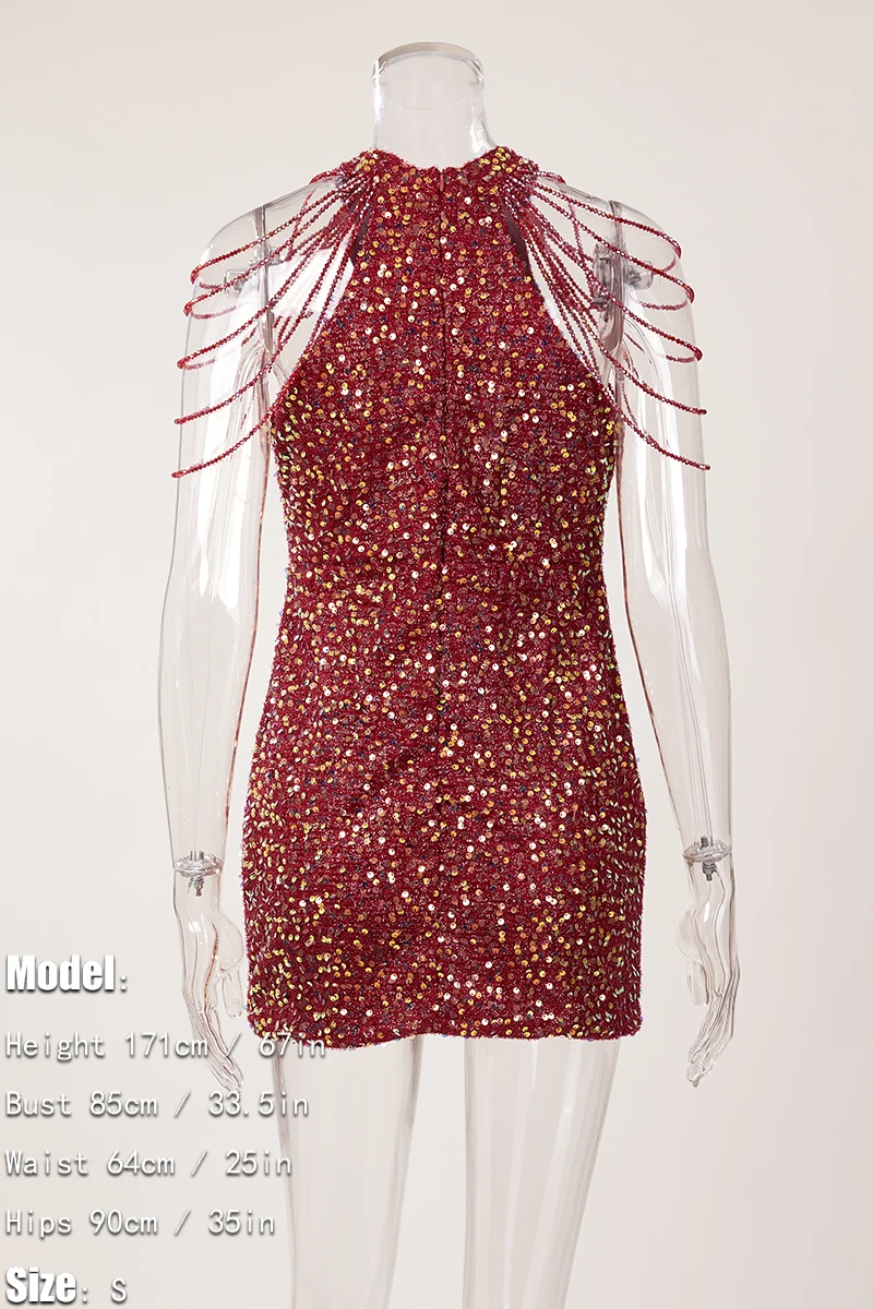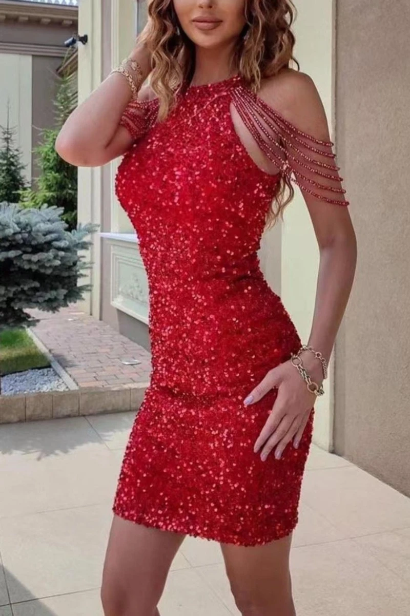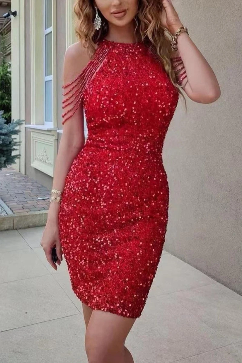 Sexy plus size slight stretch sequin crew neck beaded chain mini dress