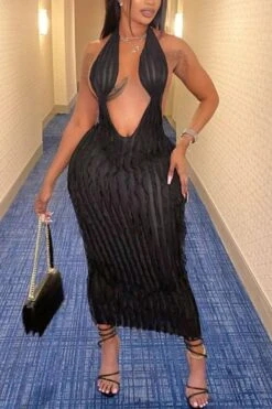 Sexy plus size slight stretch solid color halter-neck slim midi dress