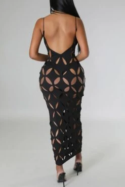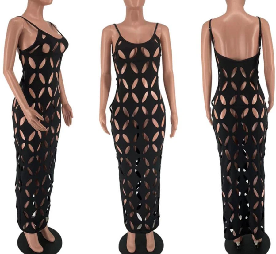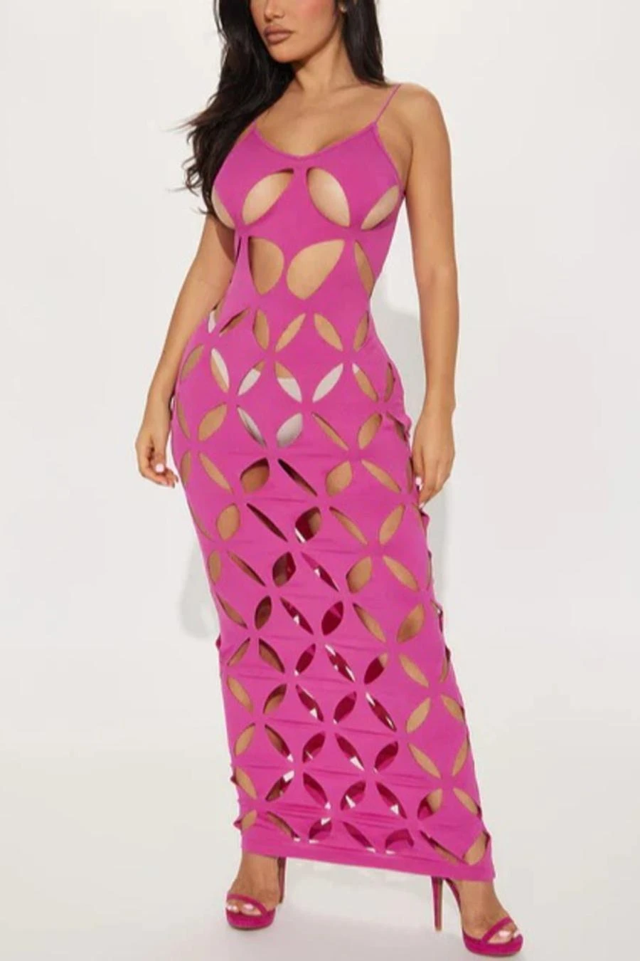 Sexy plus size slight stretch solid color hollow sling maxi dress