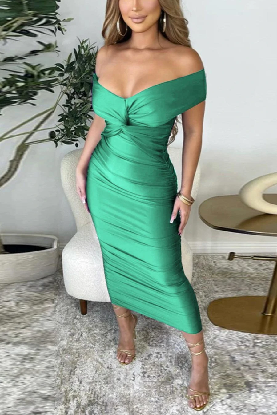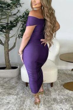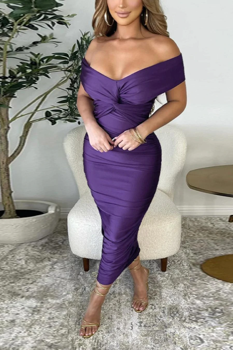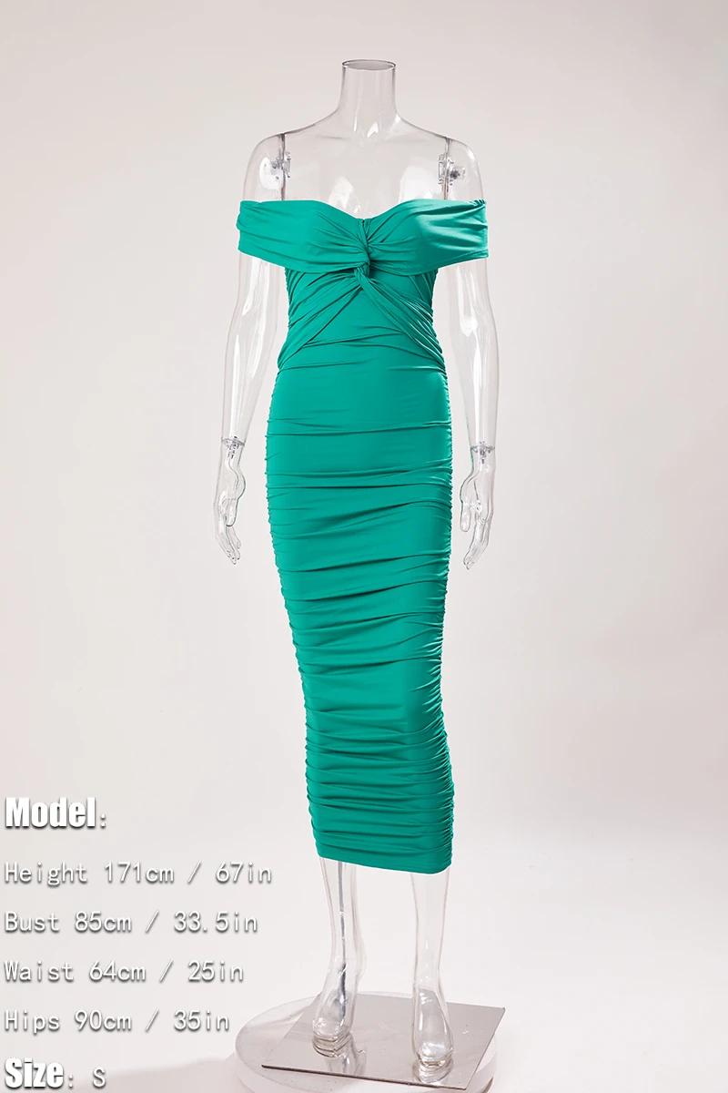 Sexy plus size slight stretch solid color kink zip-up off shoulder midi dress