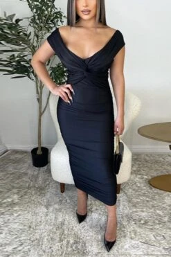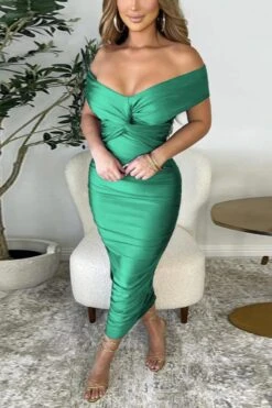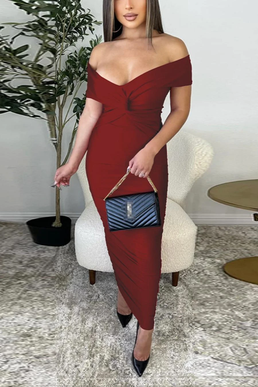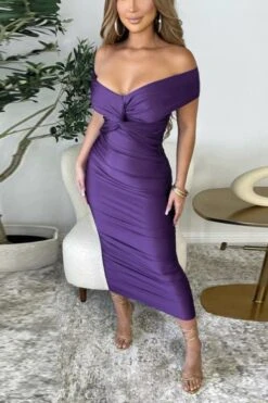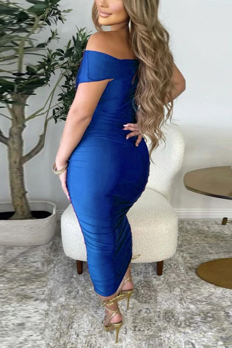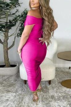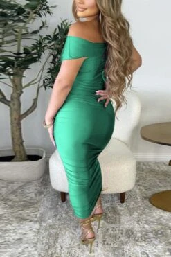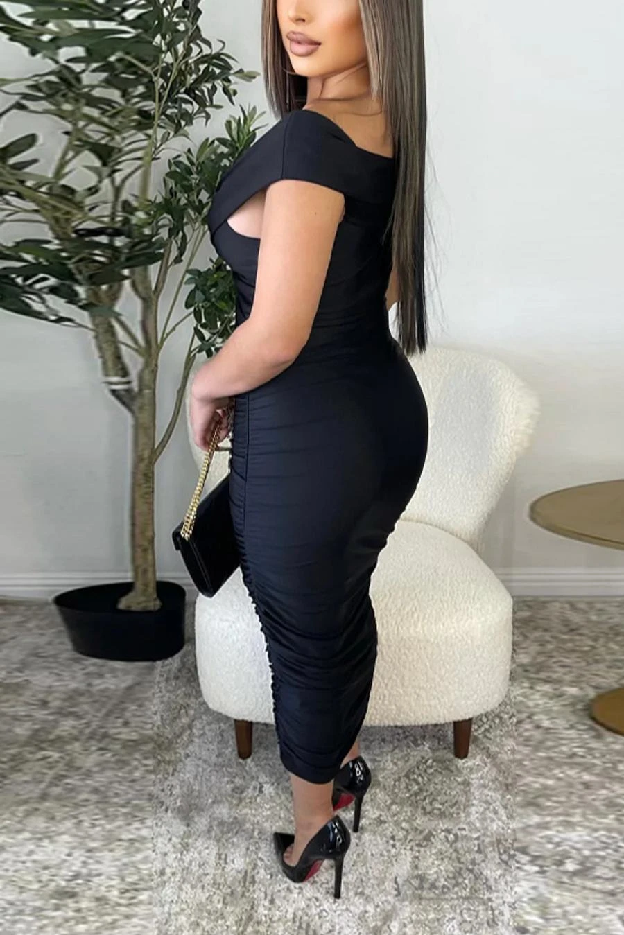 Sexy plus size slight stretch solid color kink zip-up off shoulder midi dress