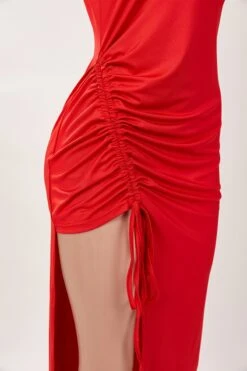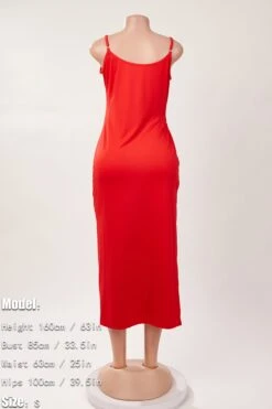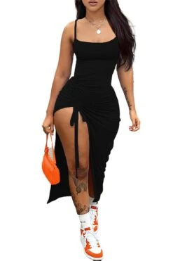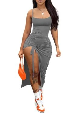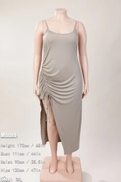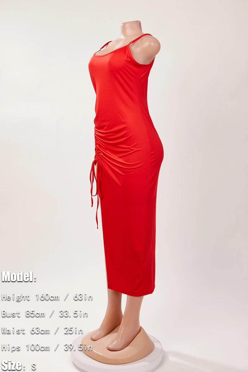 Sexy plus size slight stretch solid color sling slit drawstring midi dress