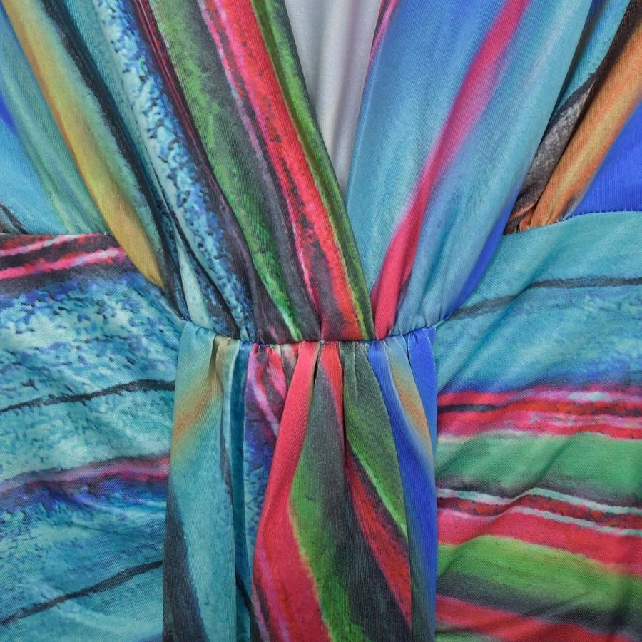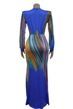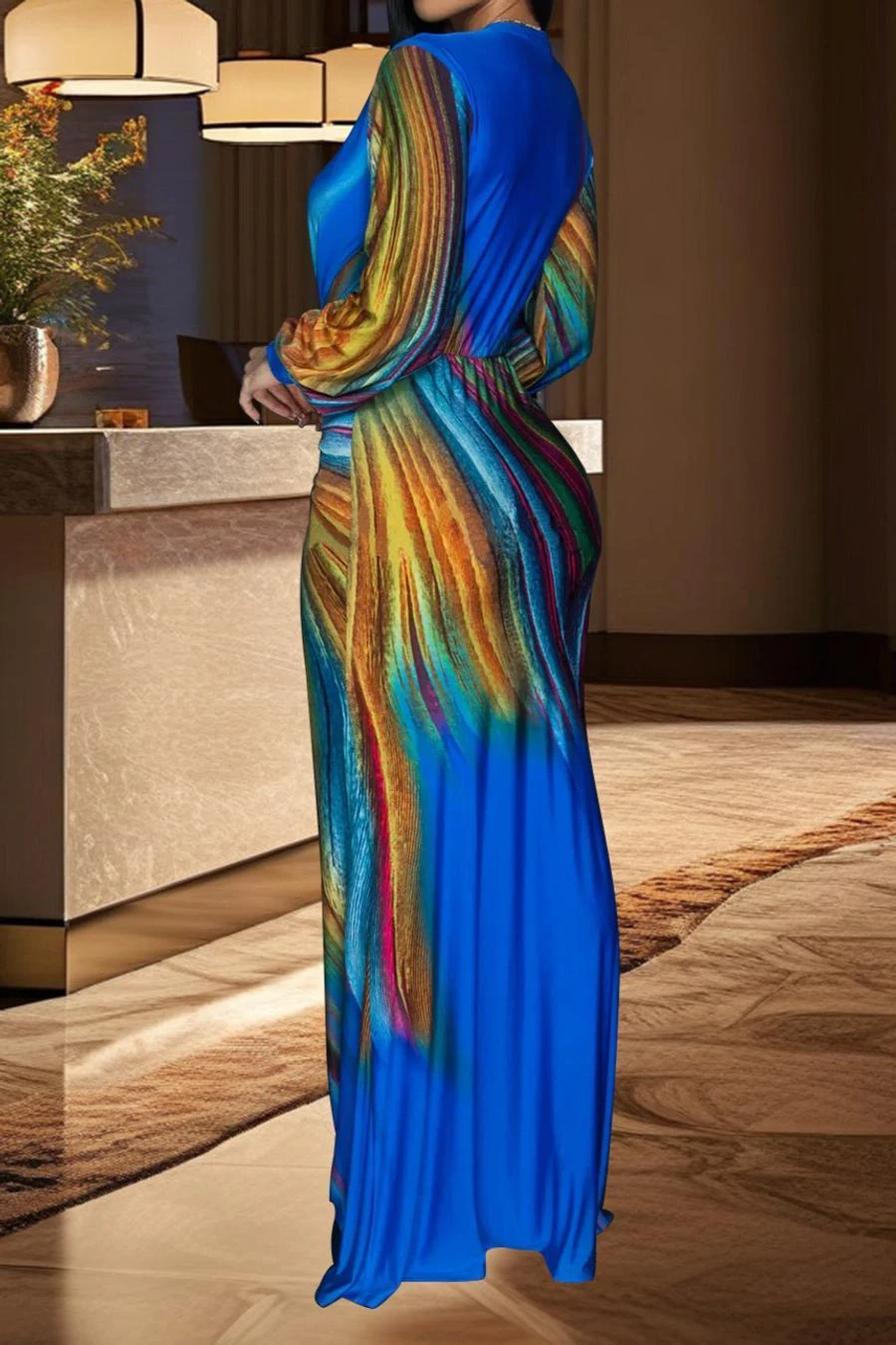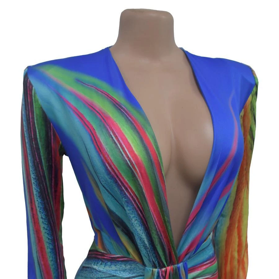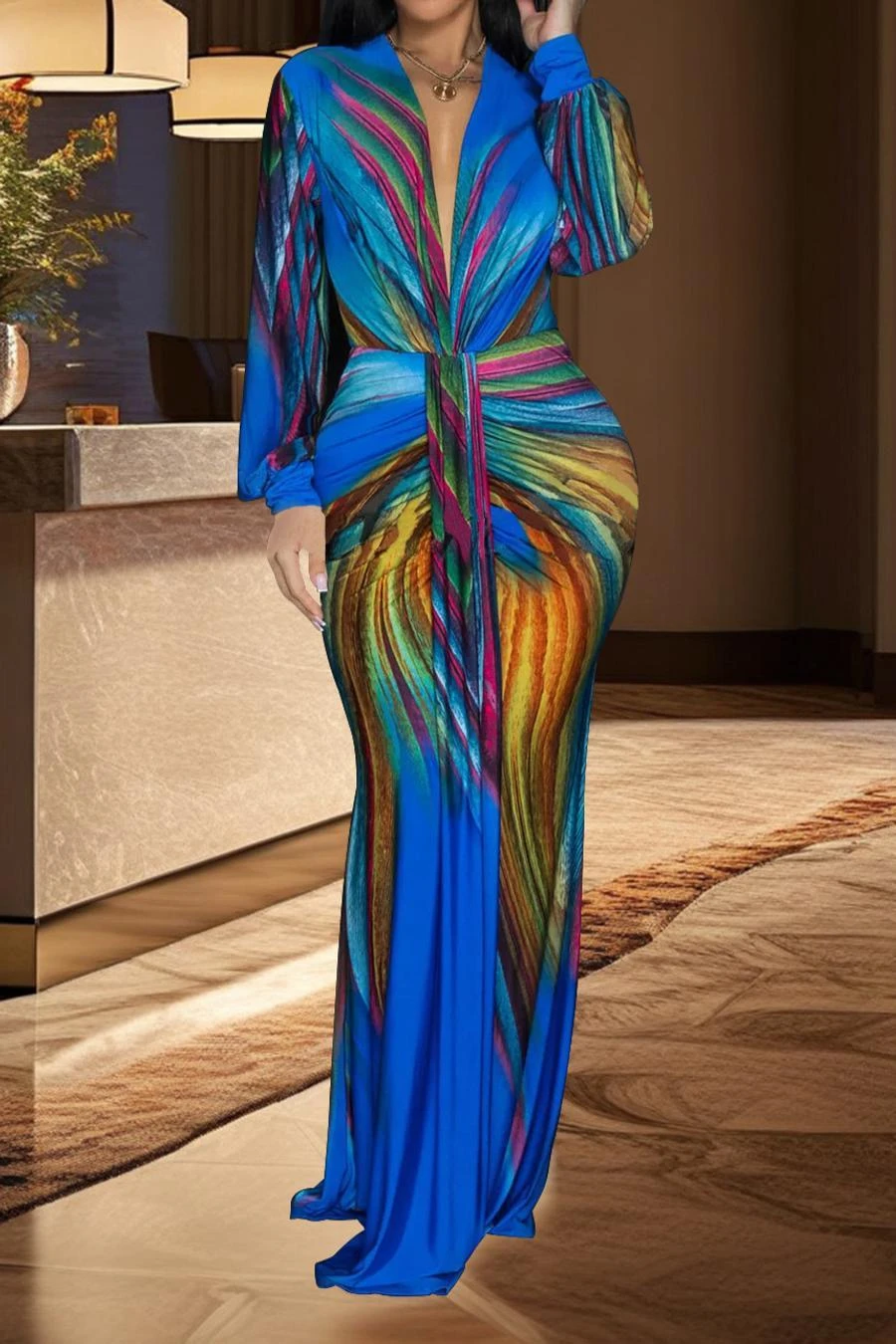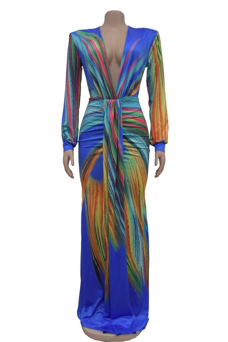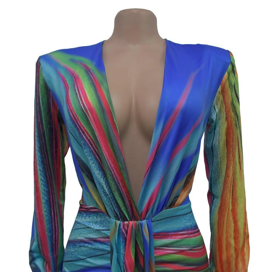 Sexy plus size stretch batch printing deep v pleated shoulder pad maxi dress