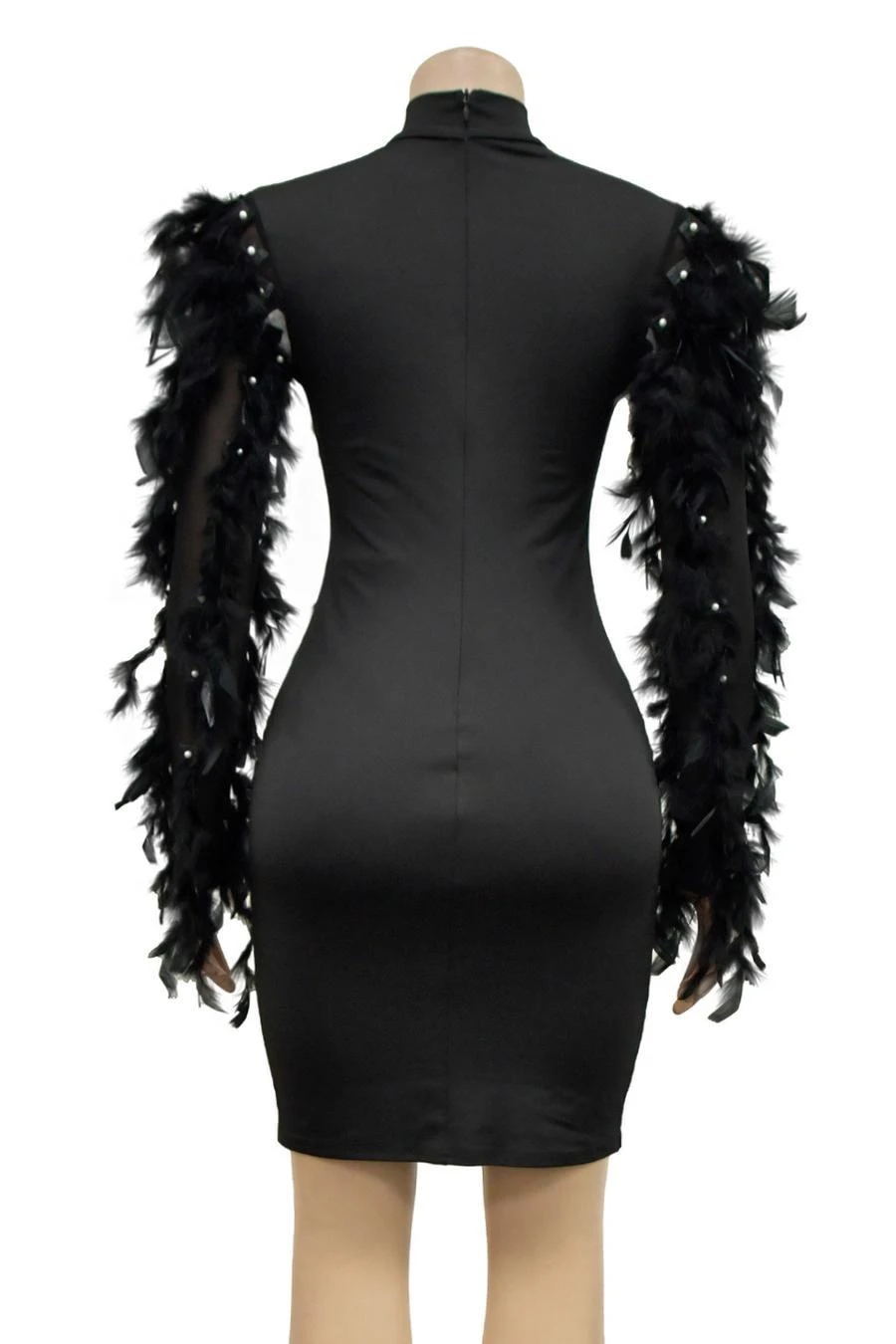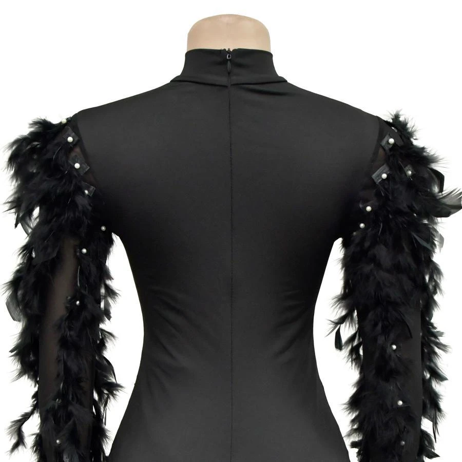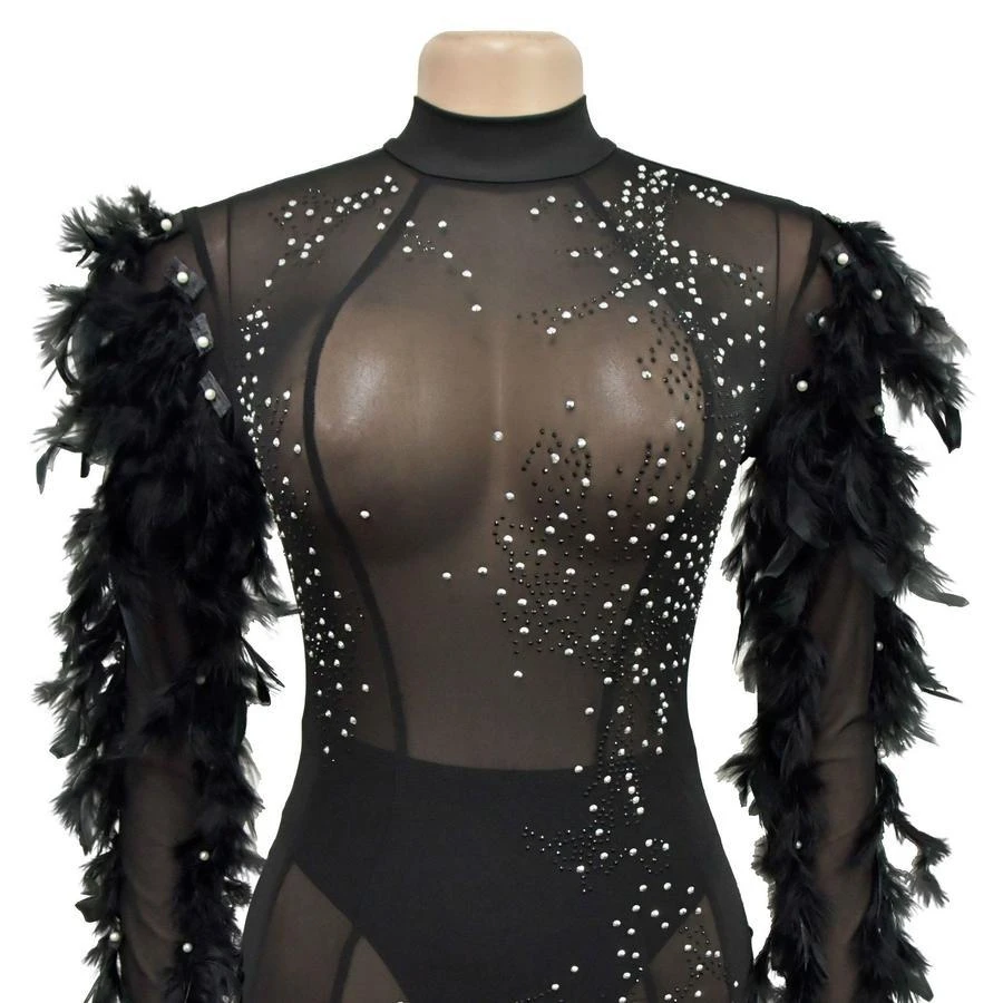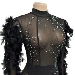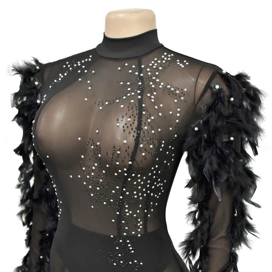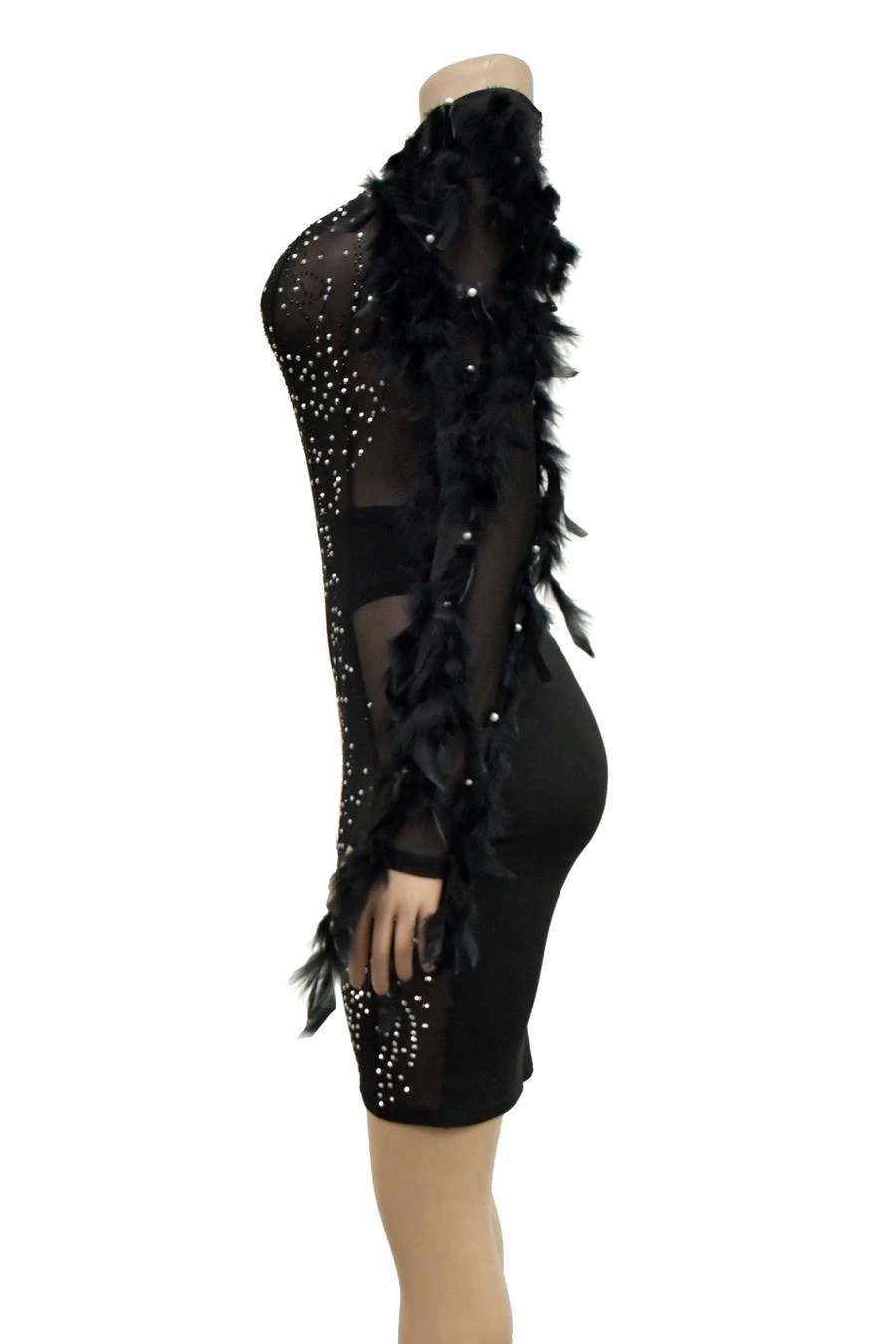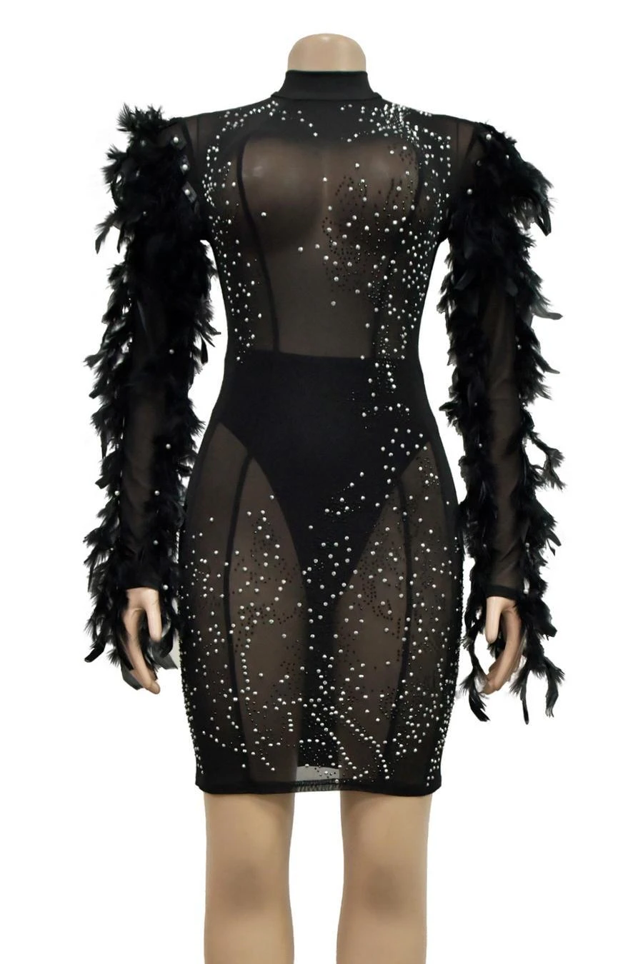 Sexy plus size stretch mesh see-through rhinestone feather tight mini dress