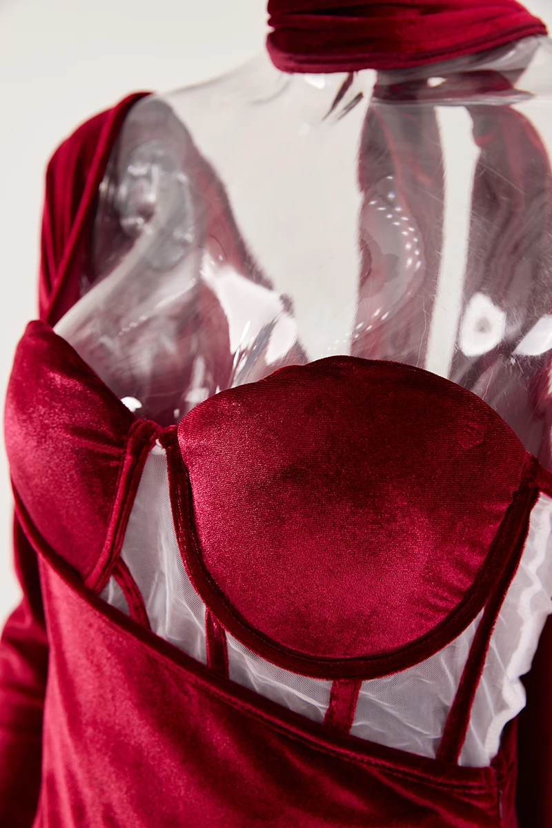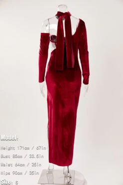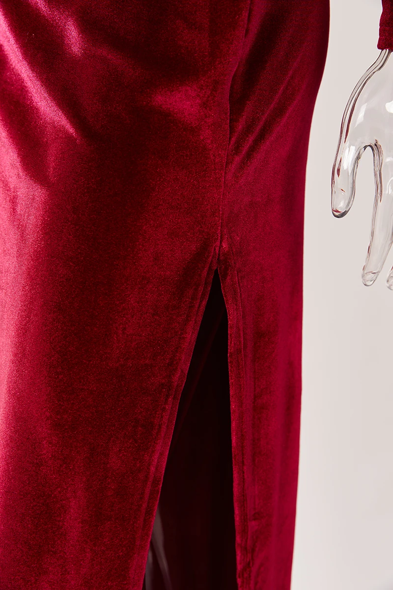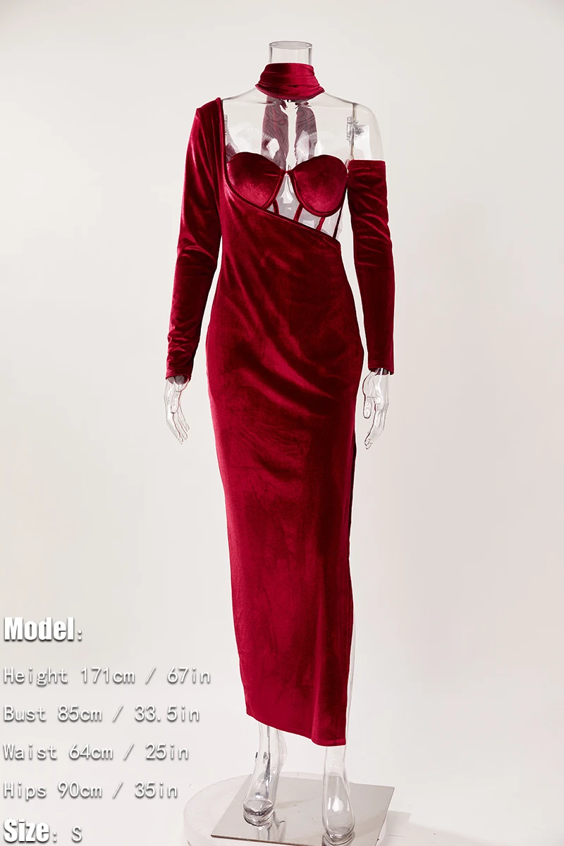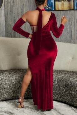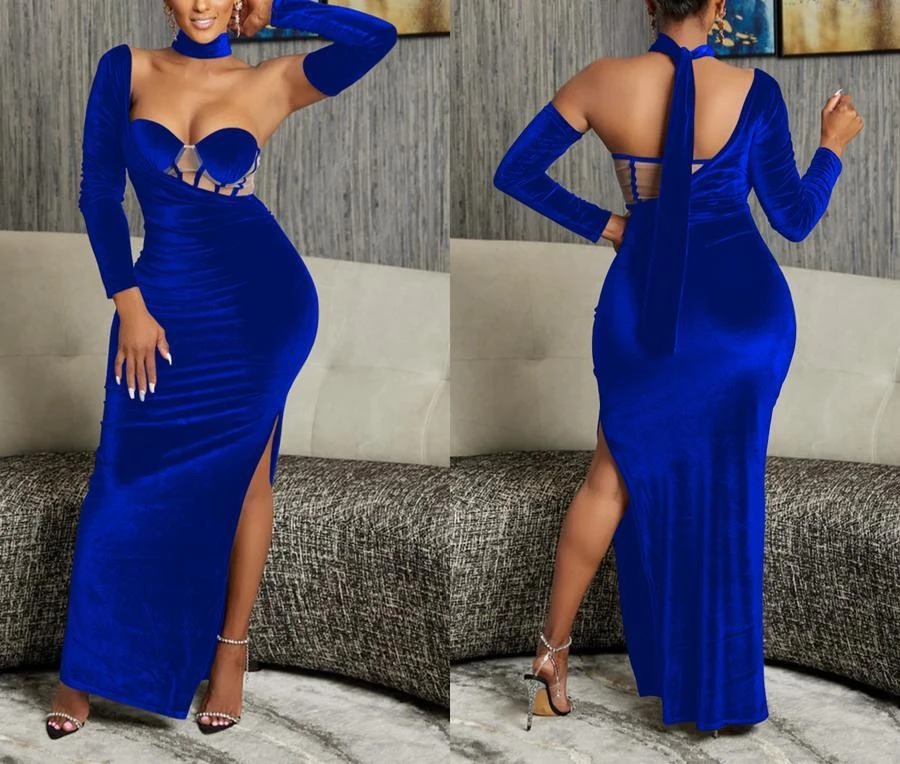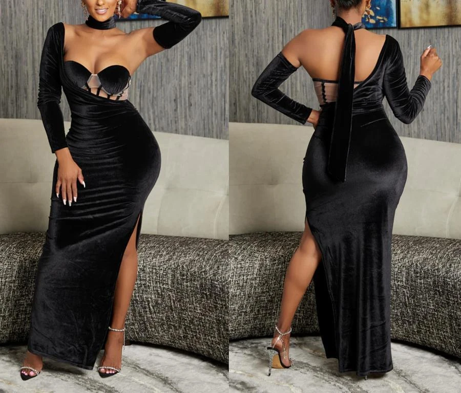 Sexy plus-size velvet mesh one shoulder with neck ring high slit maxi dress