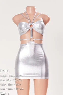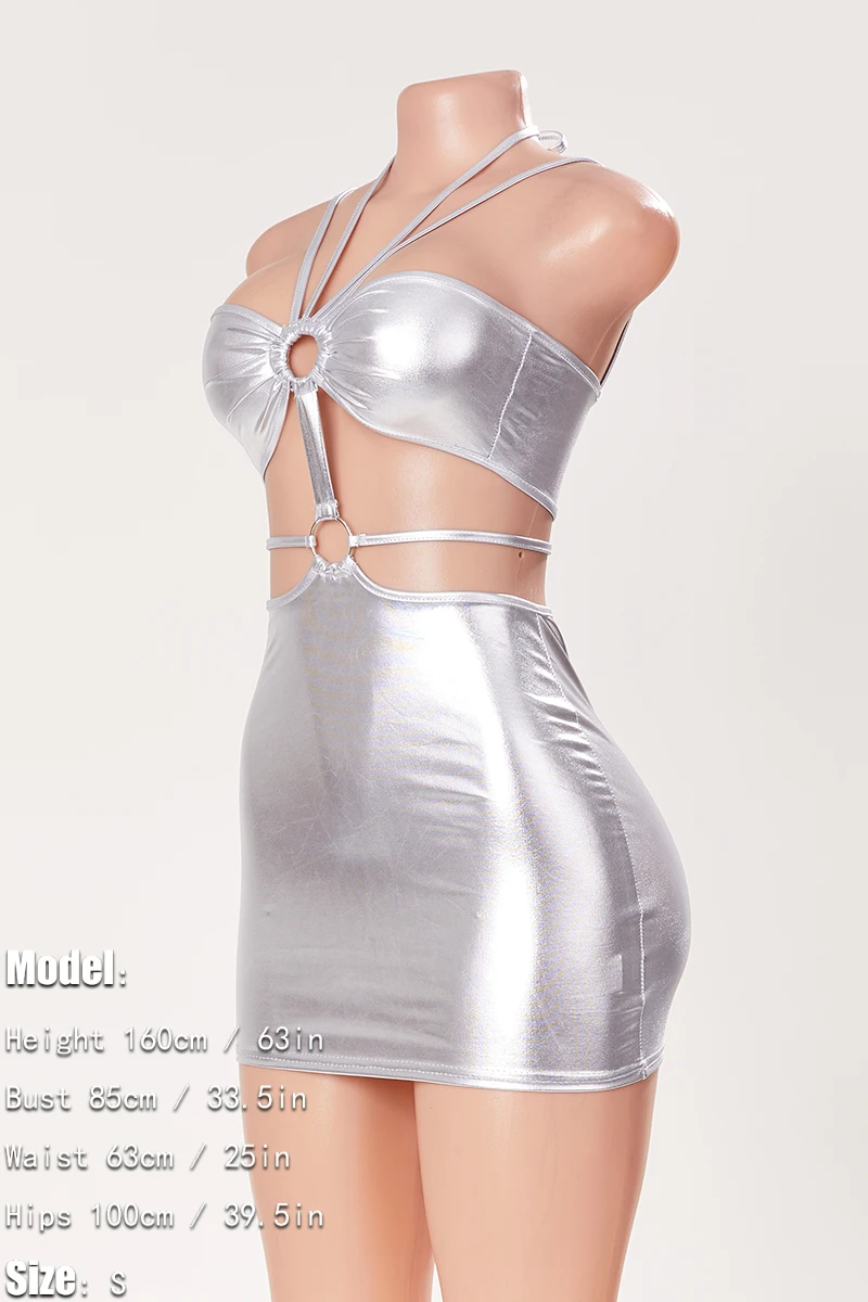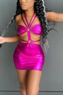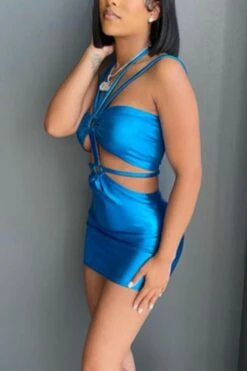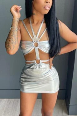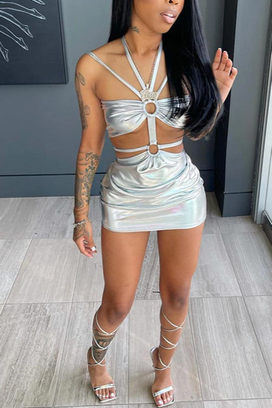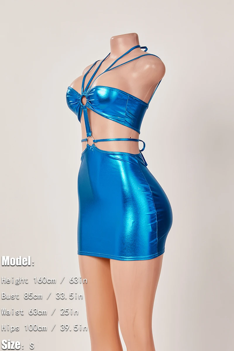 Sexy slight stretch 3 colors hollow halter-neck ring linked bodycon mini dress