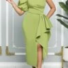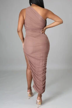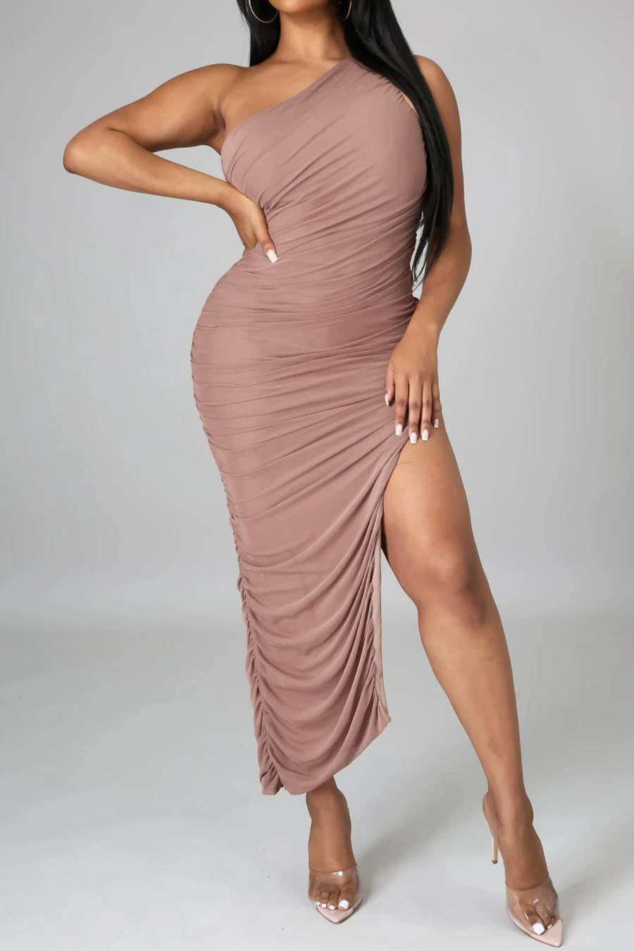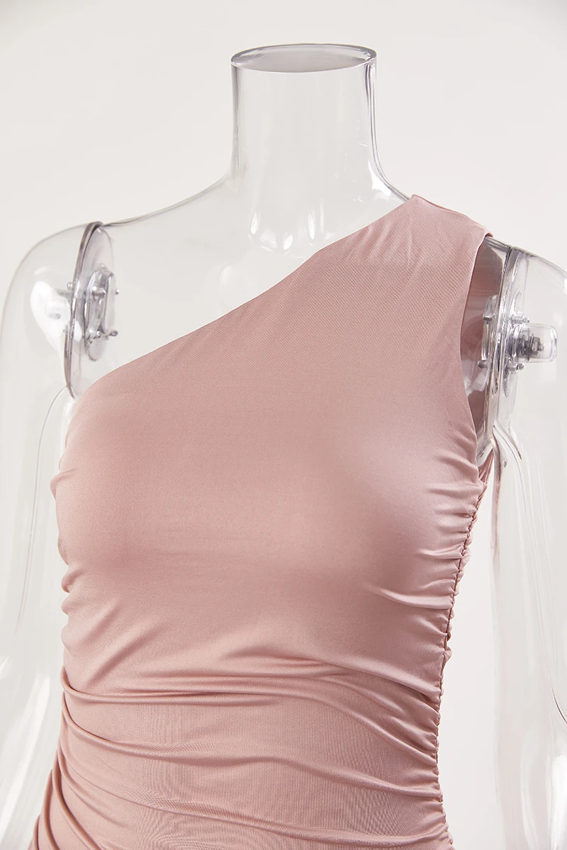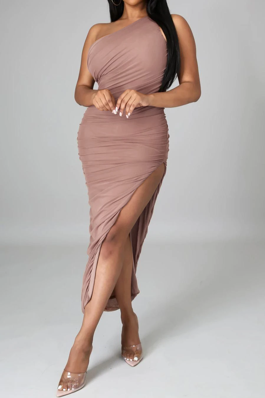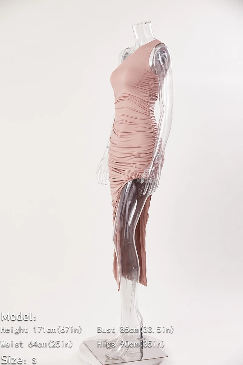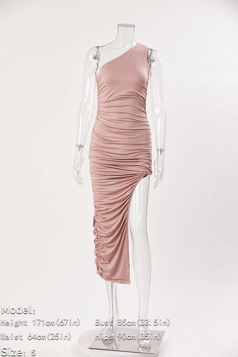 Sexy slight stretch 3 colors solid color one shoulder slit shirring midi dress