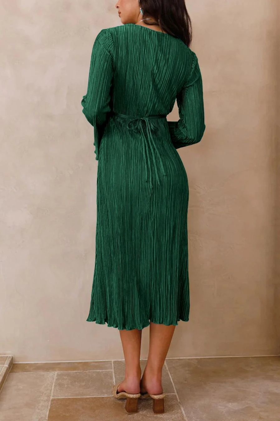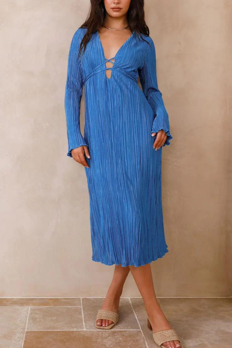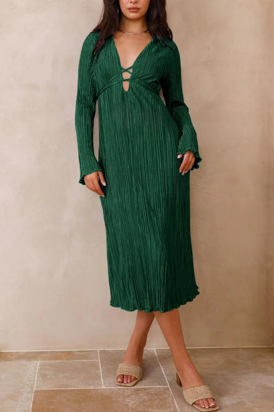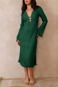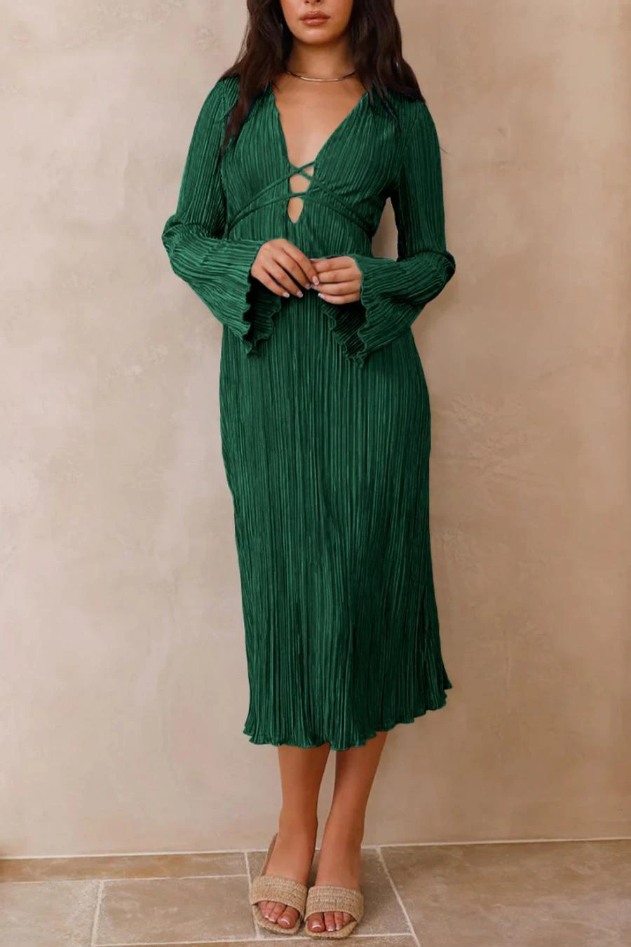 Sexy slight stretch 6 colors solid color deep v pleated midi dress