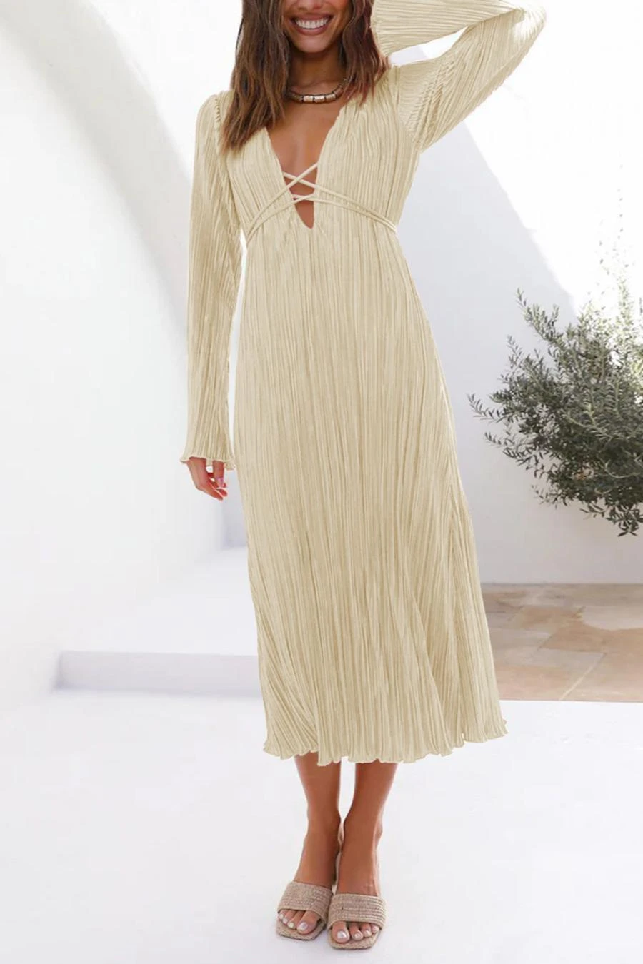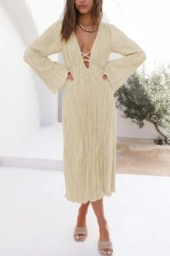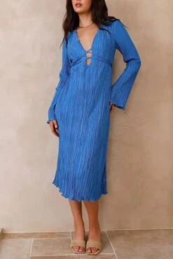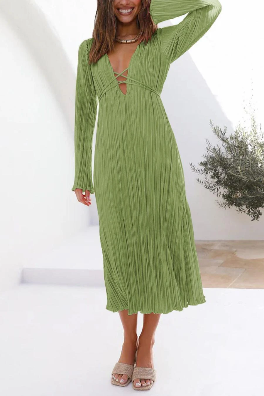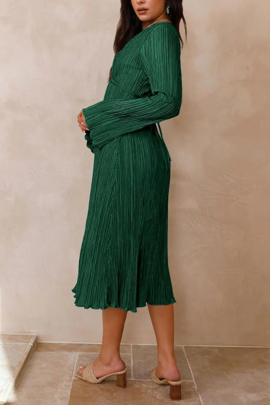 Sexy slight stretch 6 colors solid color deep v pleated midi dress