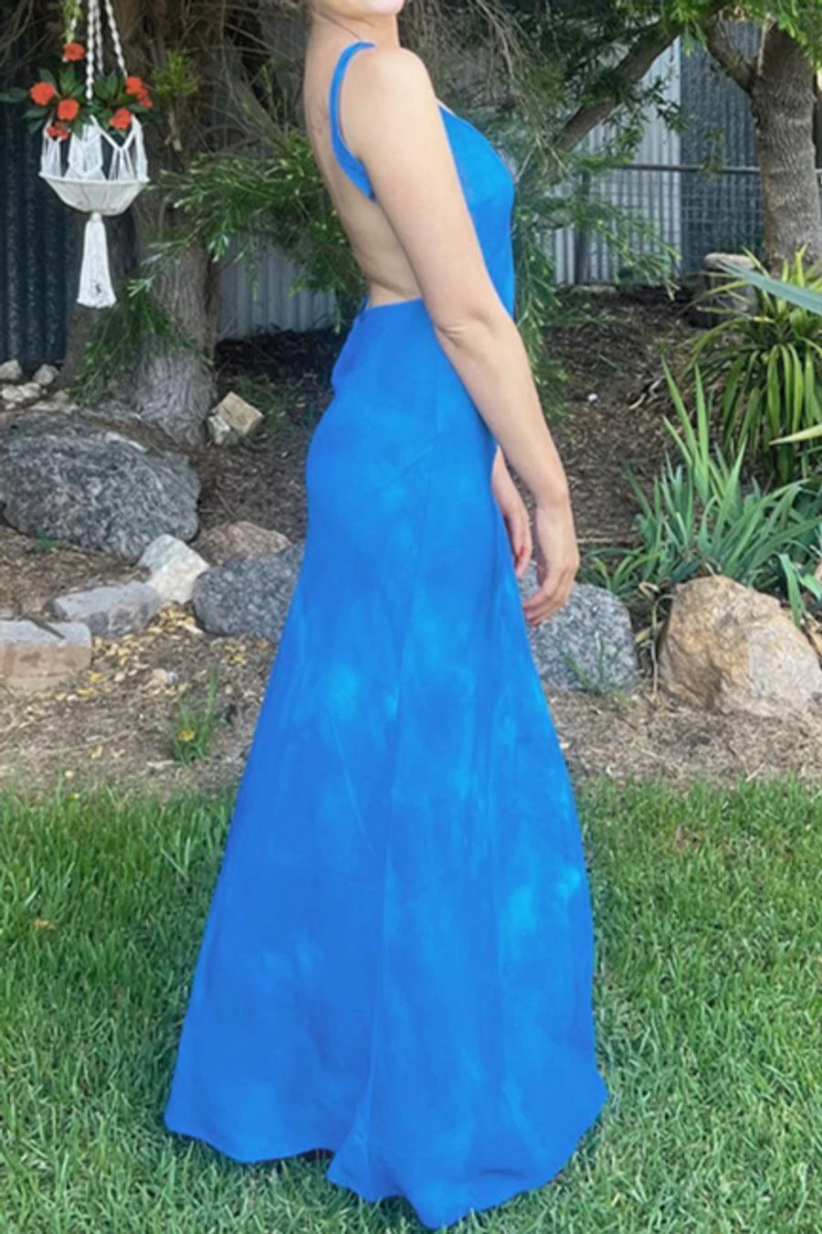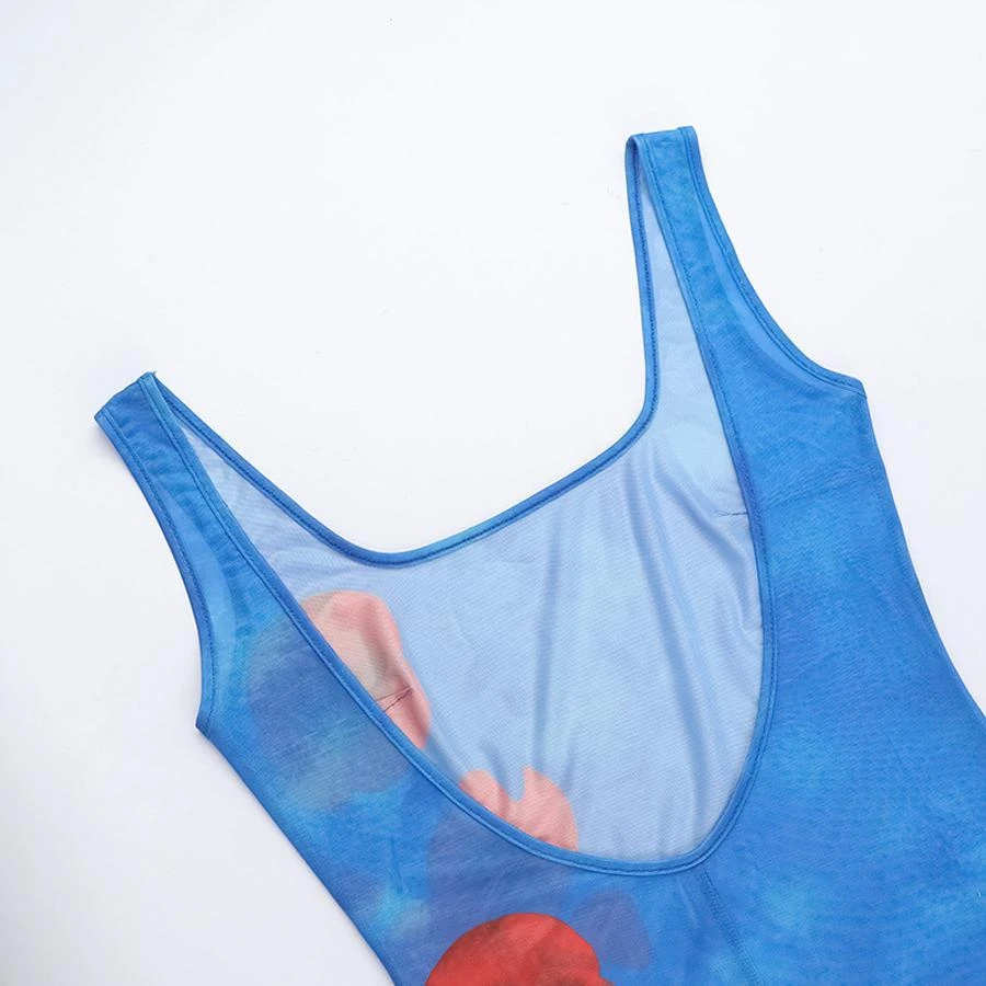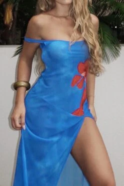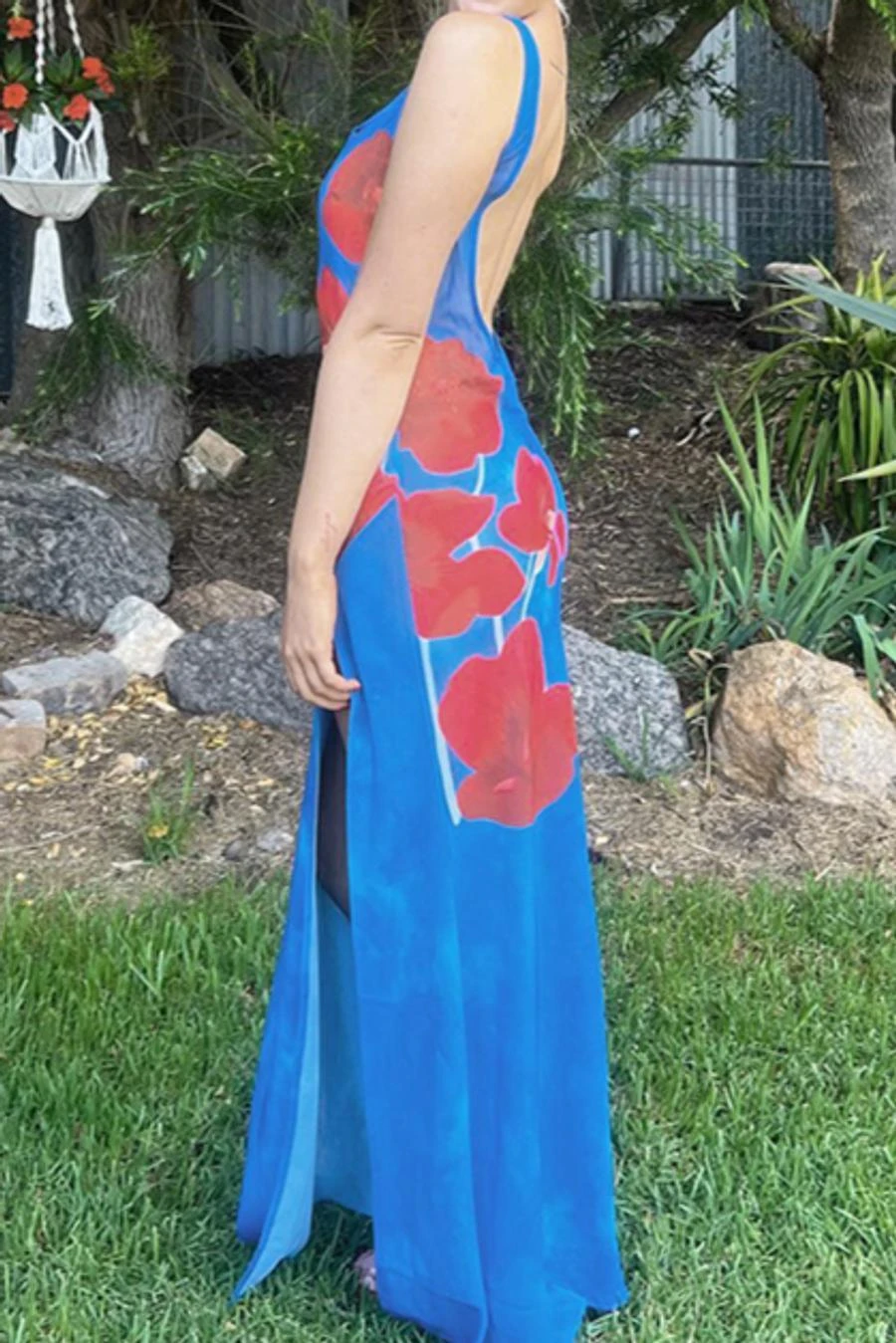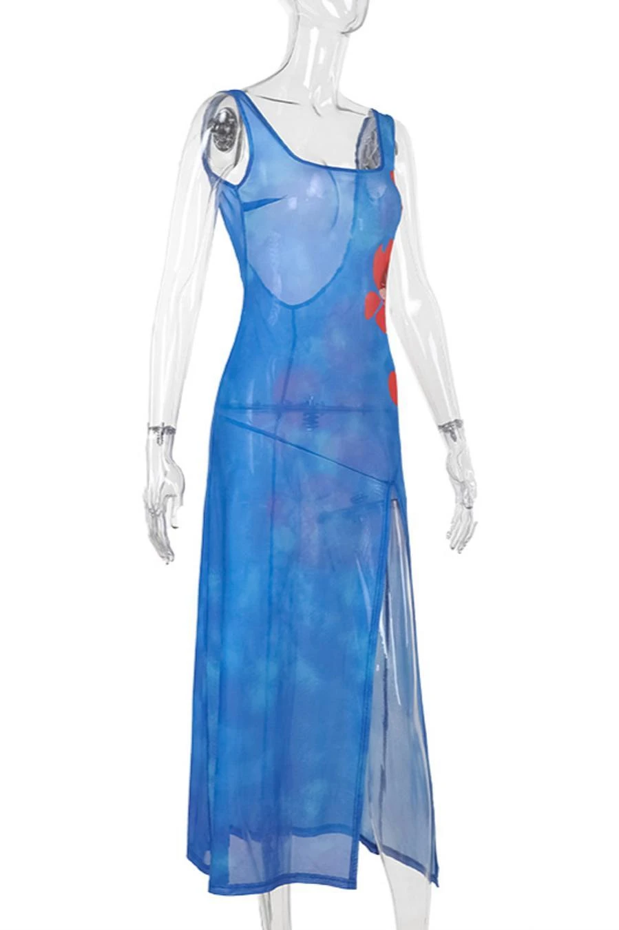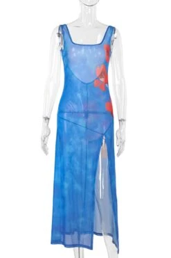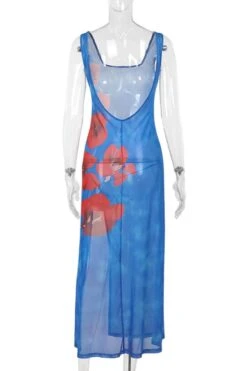 Sexy slight stretch backless flower printed see-through slit maxi dress