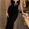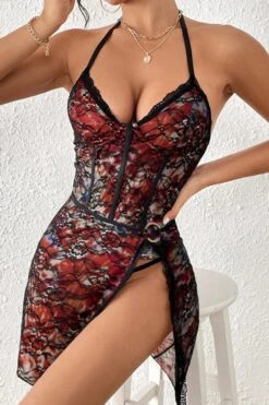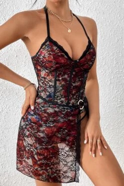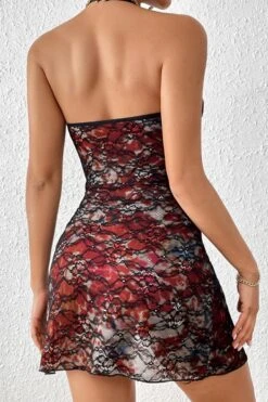 Sexy slight stretch batch printing lace halter-neck high slit mini dress