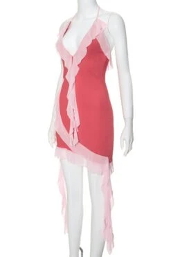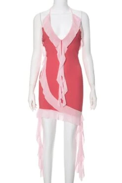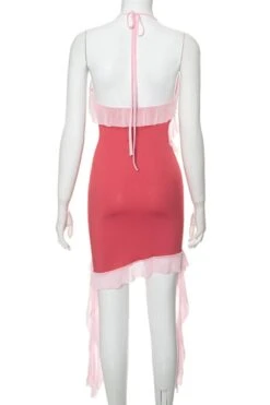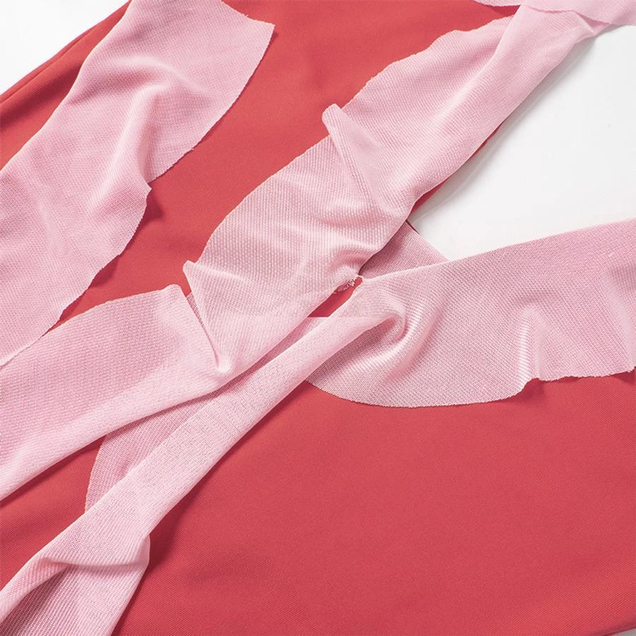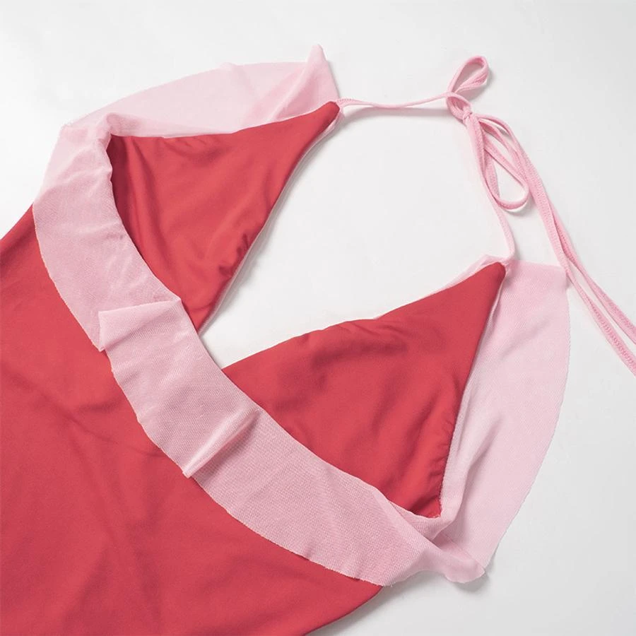 Sexy slight stretch contrast color halter-neck midi dress