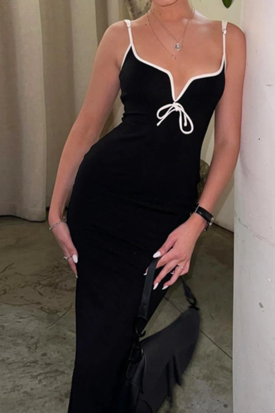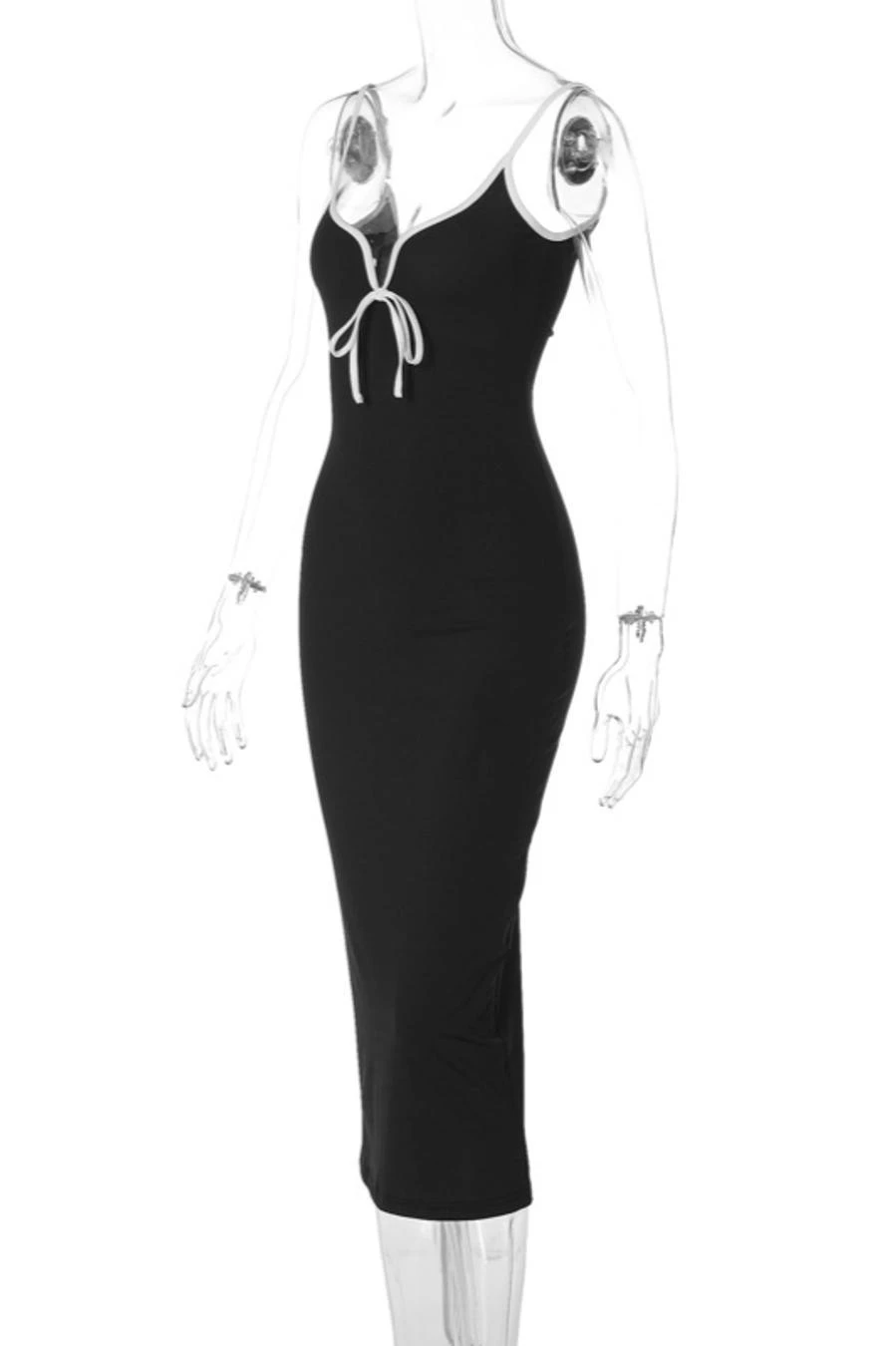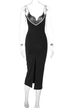 Sexy slight stretch contrast color sling high slit midi dress