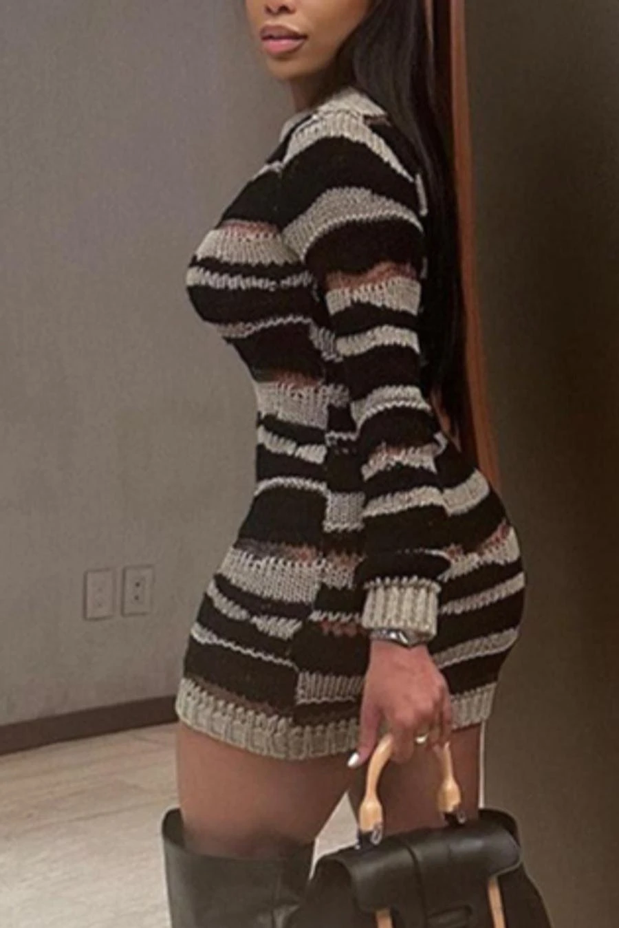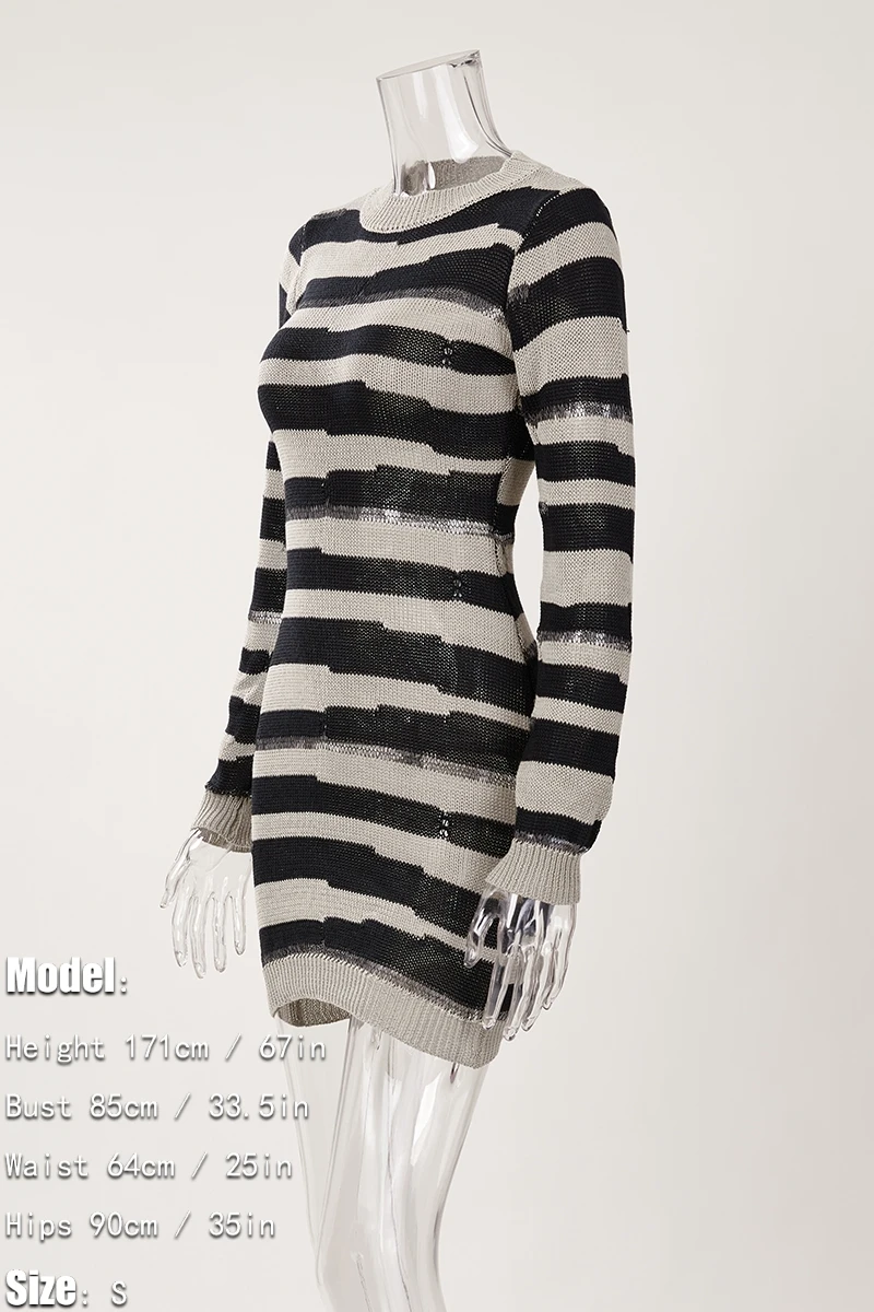 Sexy slight stretch cut out stripe knitted long sleeve bodycon mini dress