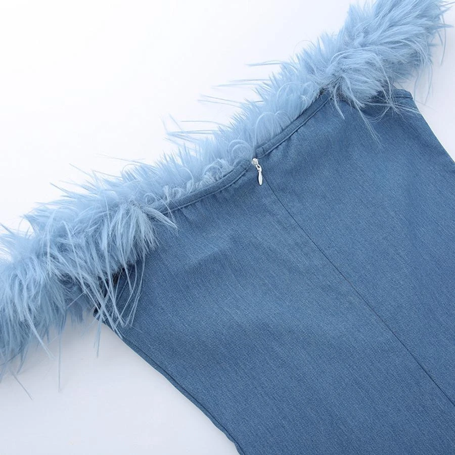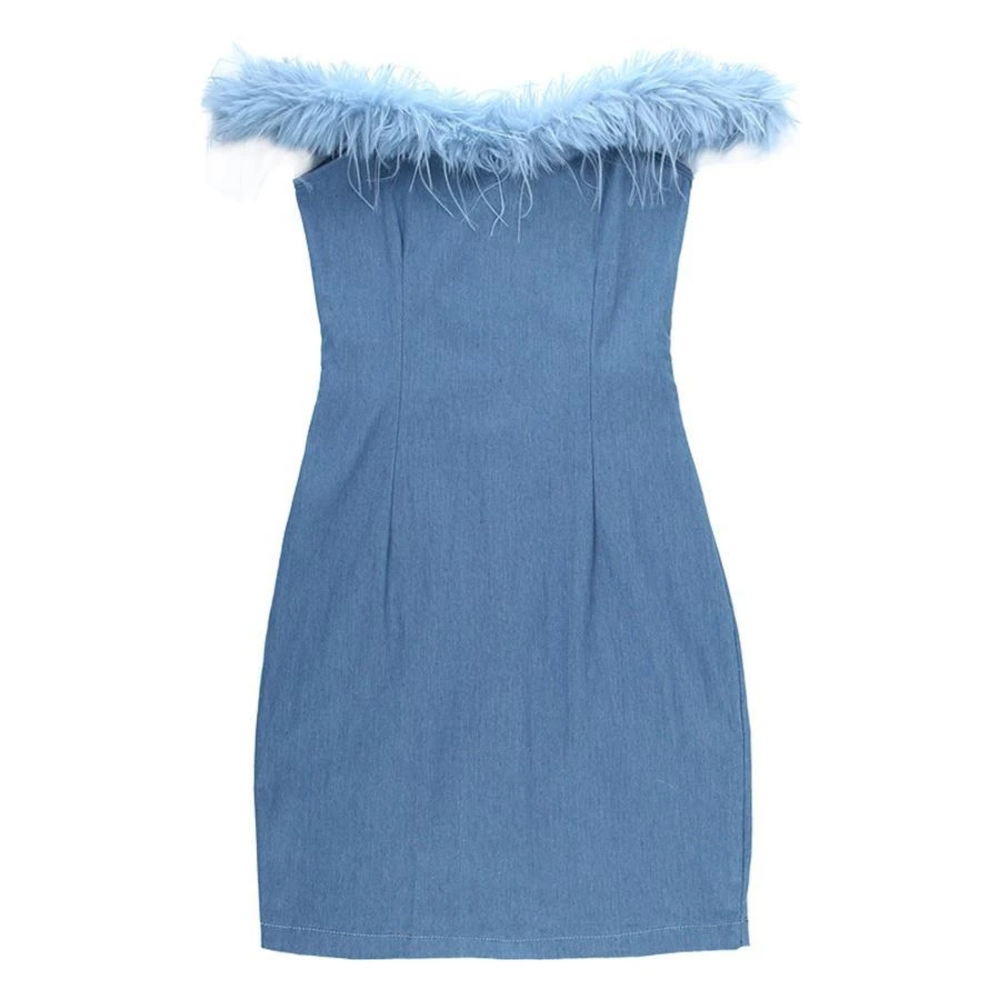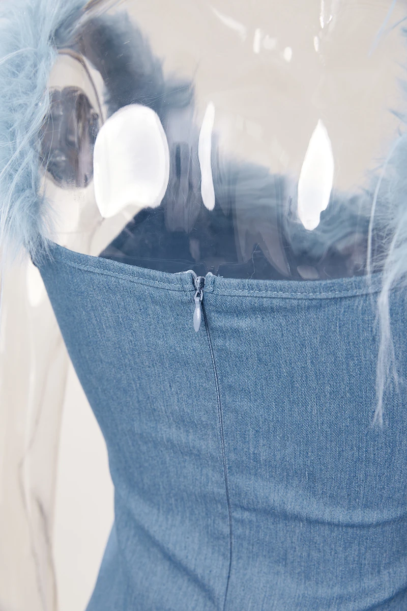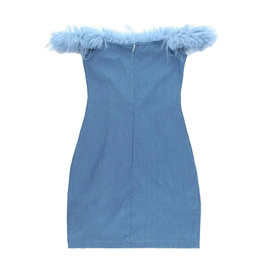Sexy slight stretch denim fuzzy zip-up mini dress