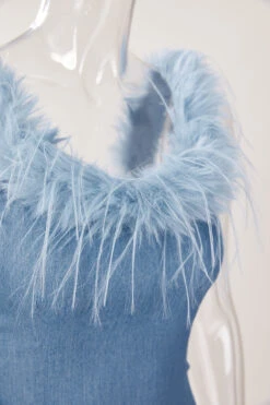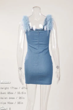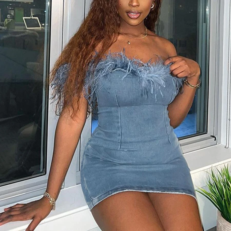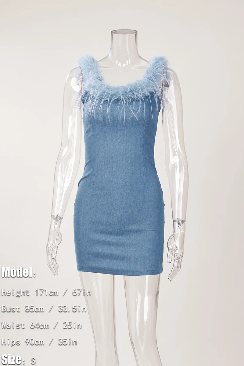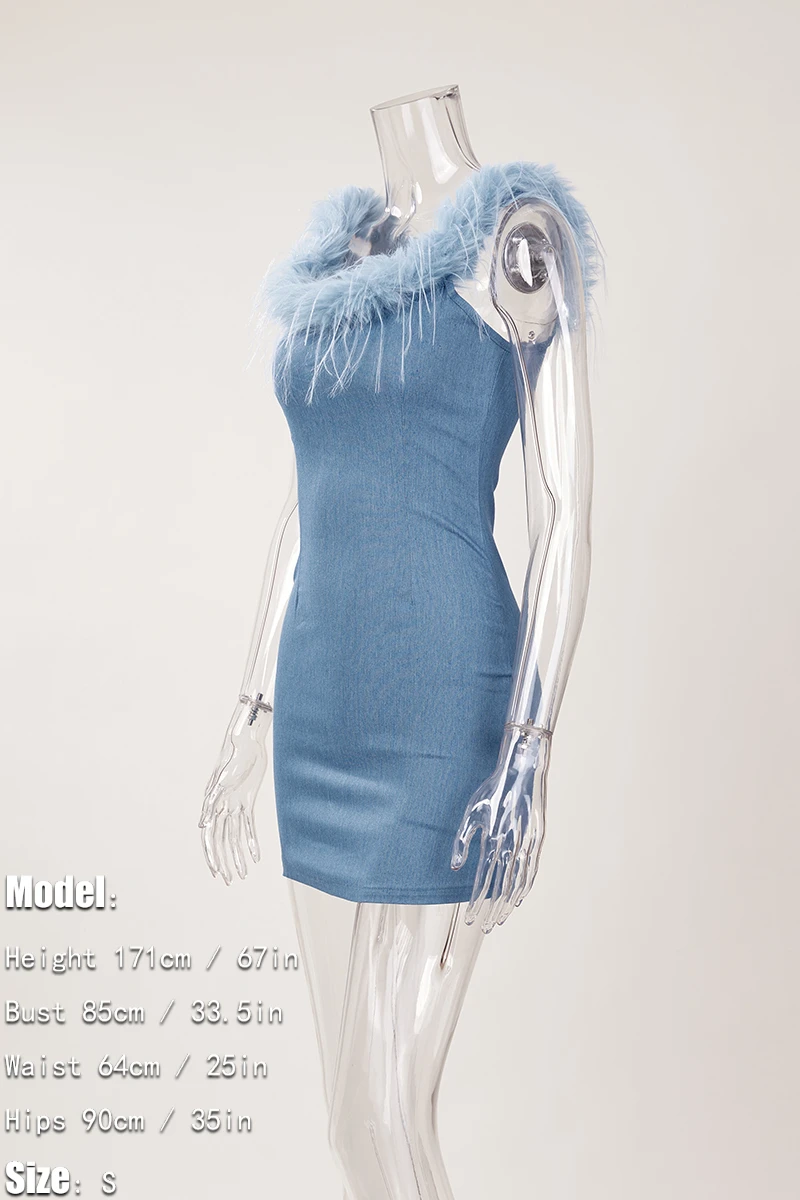 Sexy slight stretch denim fuzzy zip-up mini dress
