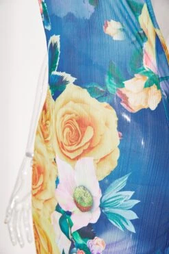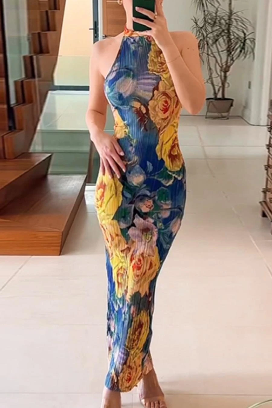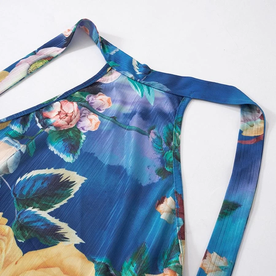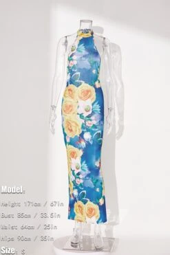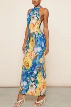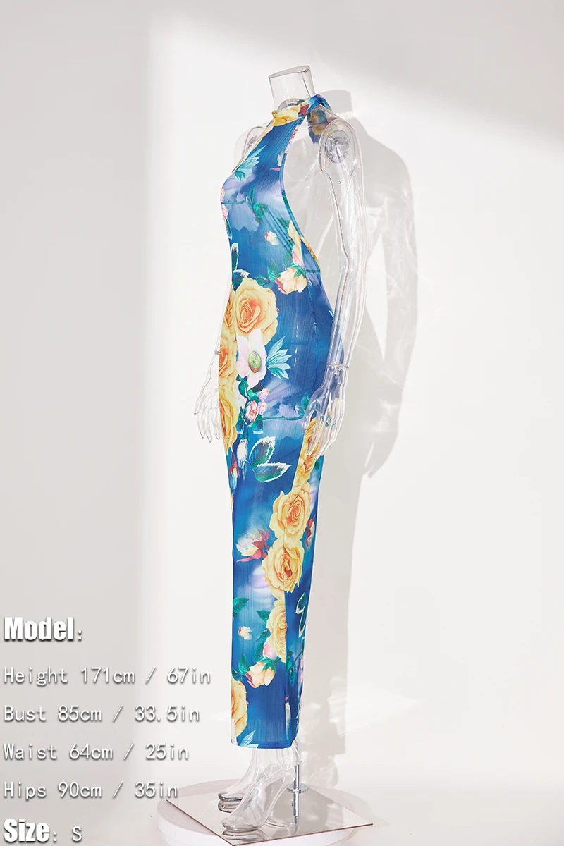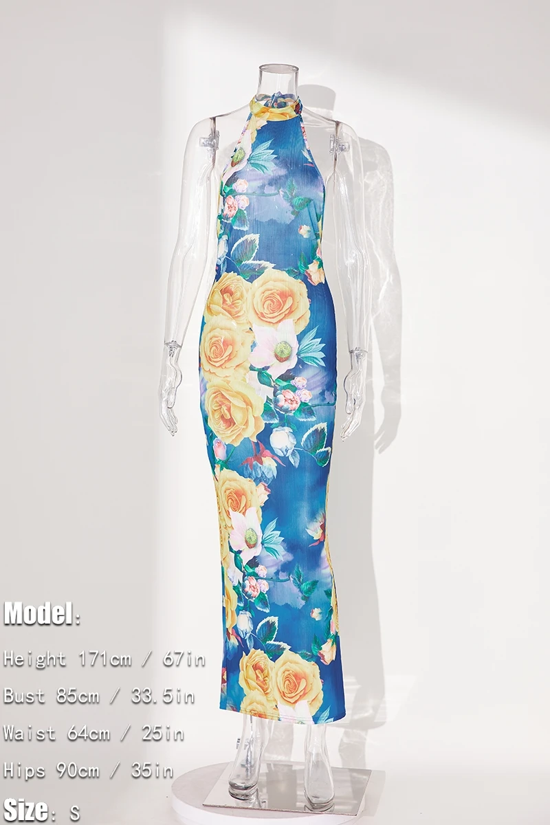 Sexy slight stretch flower batch printing halter-neck maxi dress