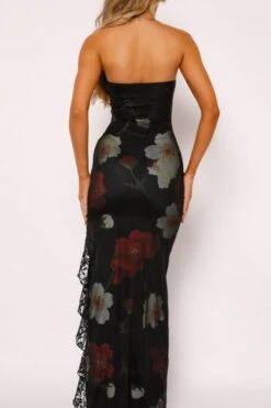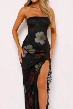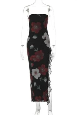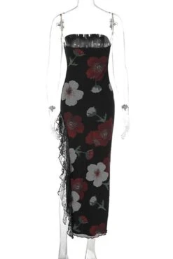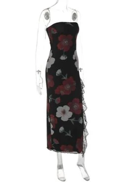 Sexy slight stretch flower print lace patchwork high slit midi dress
