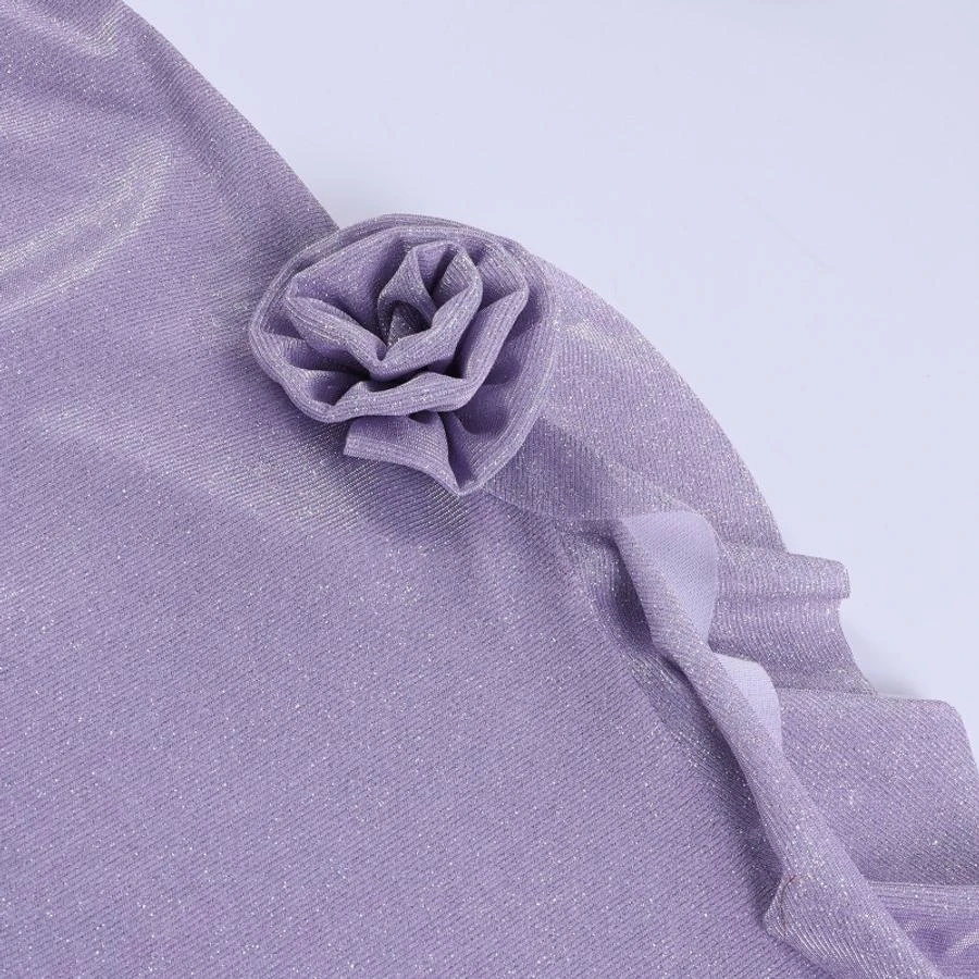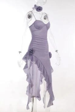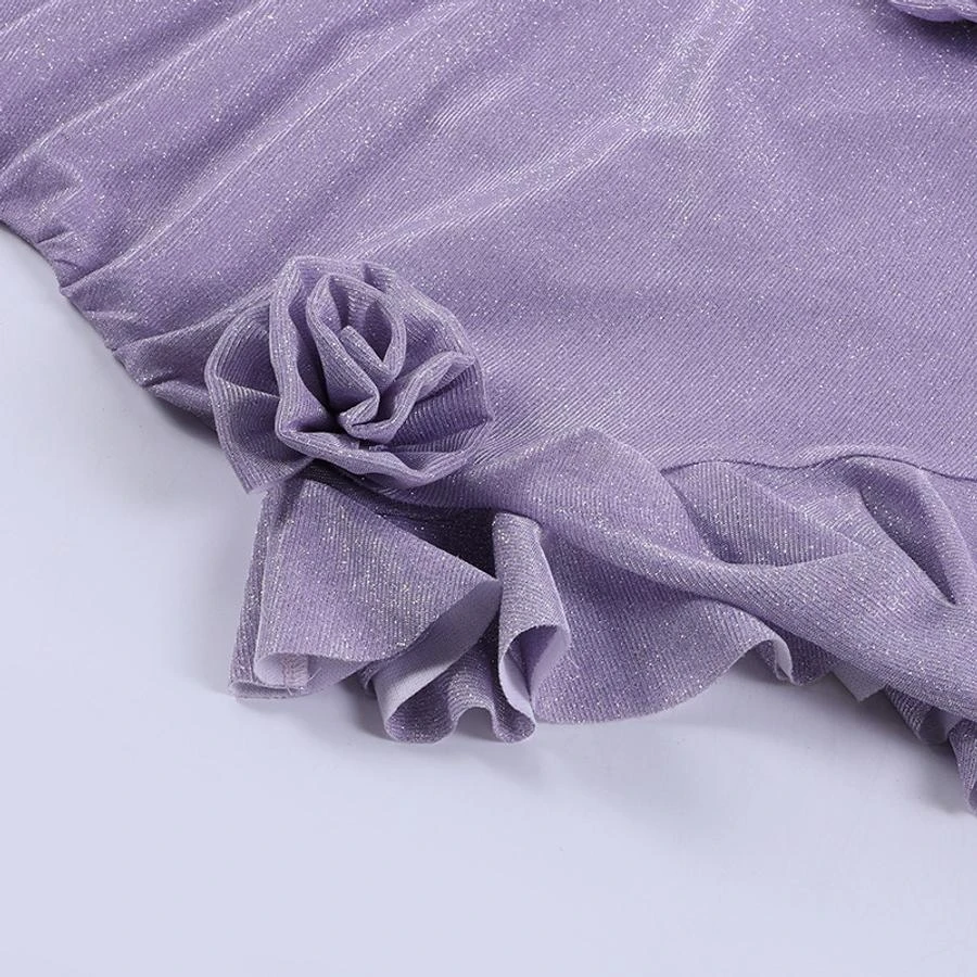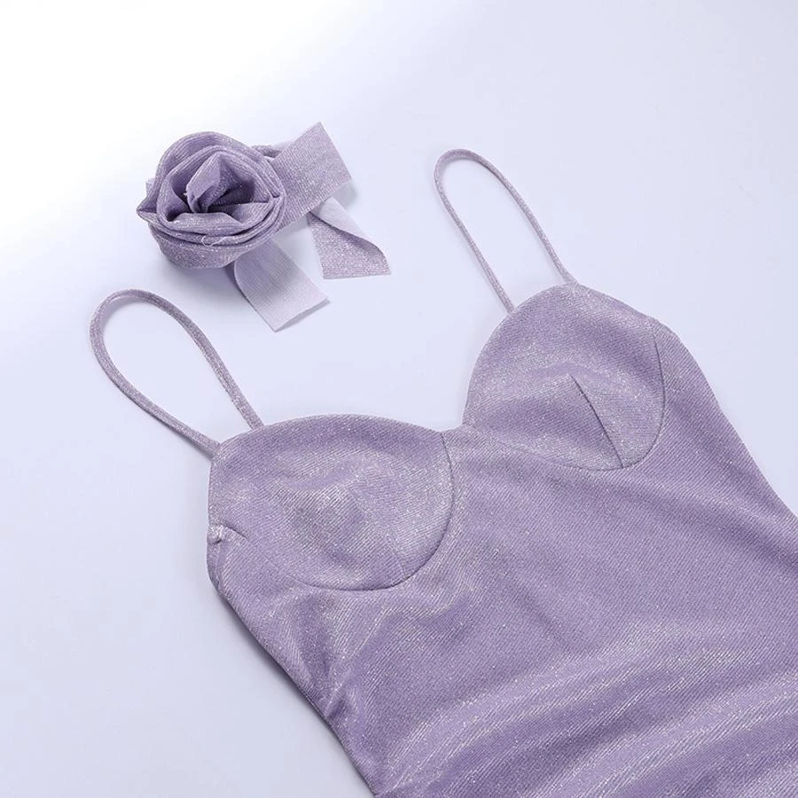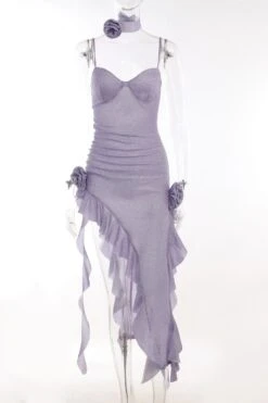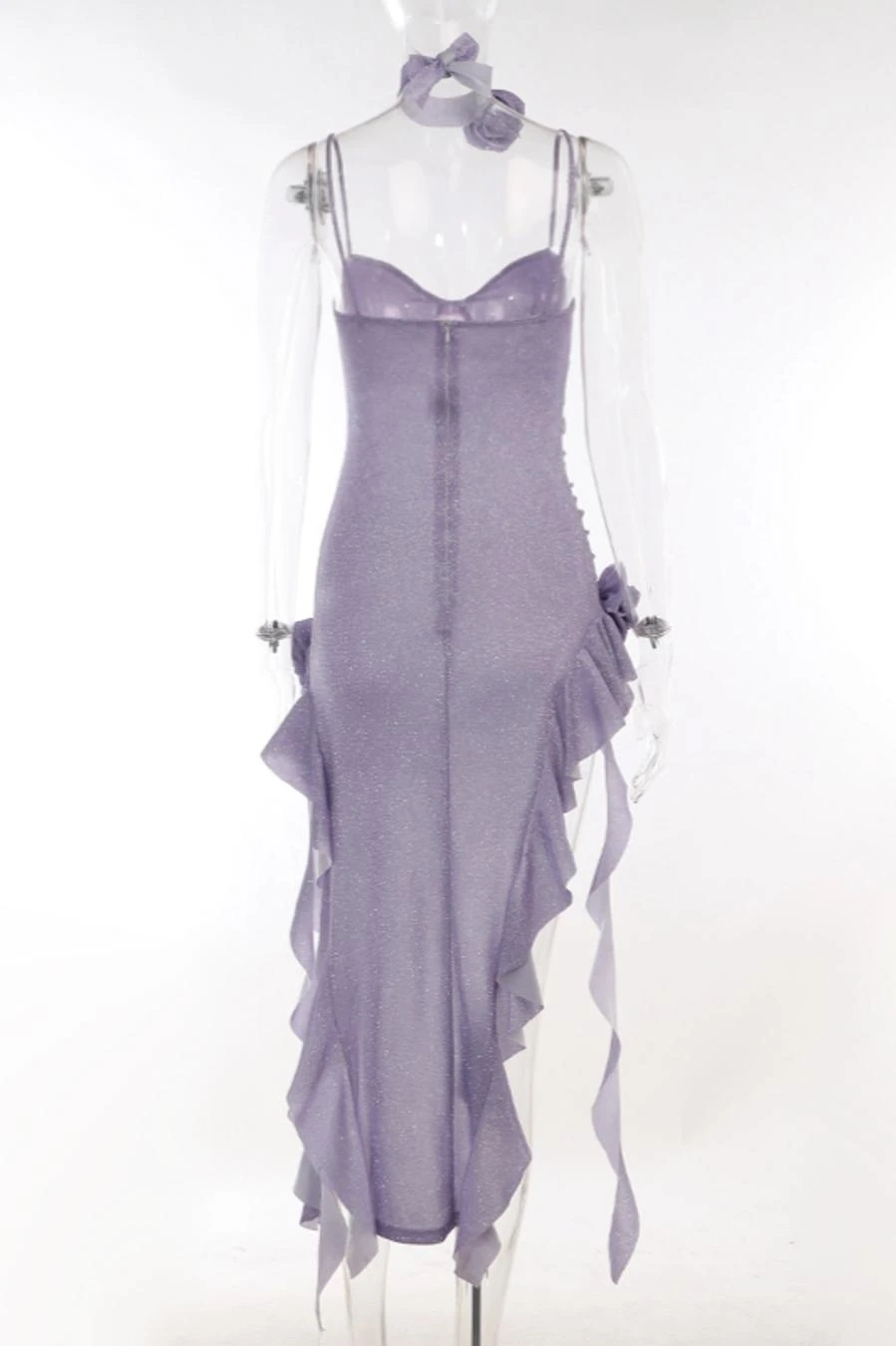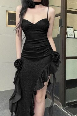 Sexy slight stretch flower sparkling irregular ruffle sling zip-up midi dress