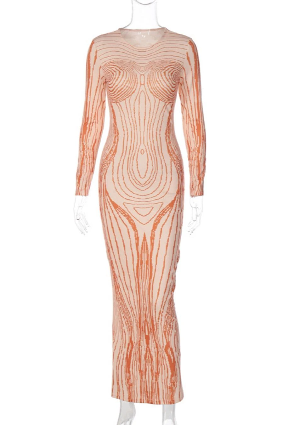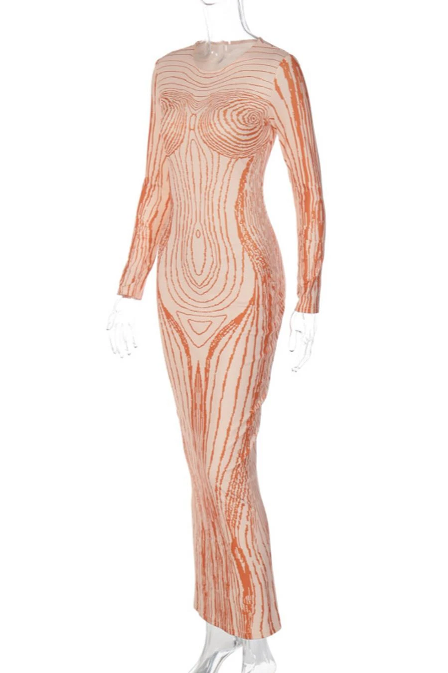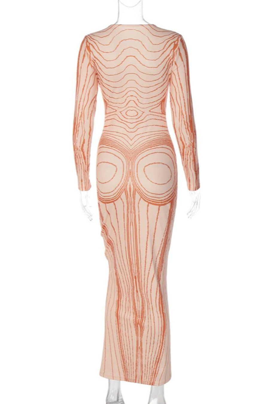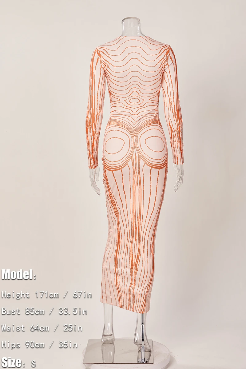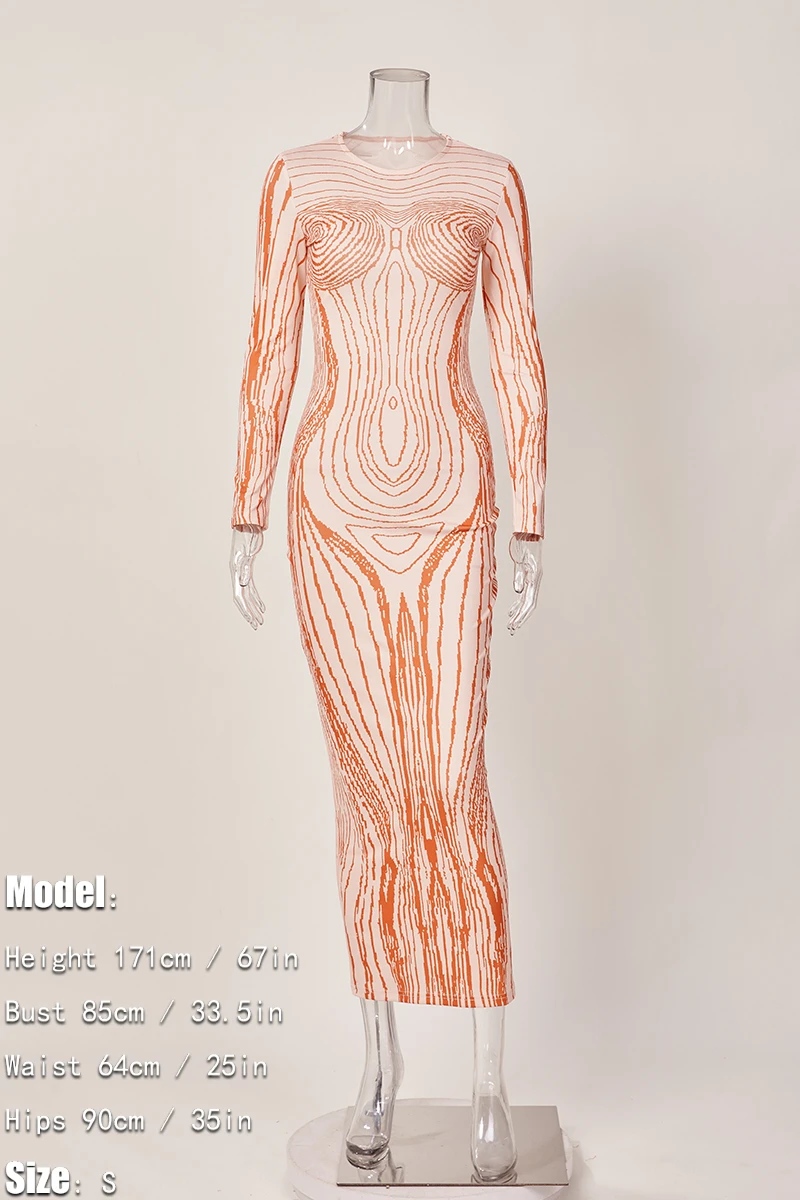 Sexy slight stretch human body printing crew neck slim maxi dress