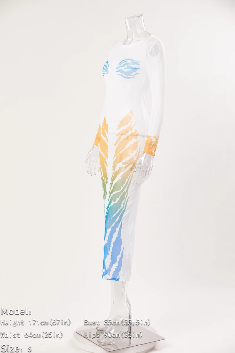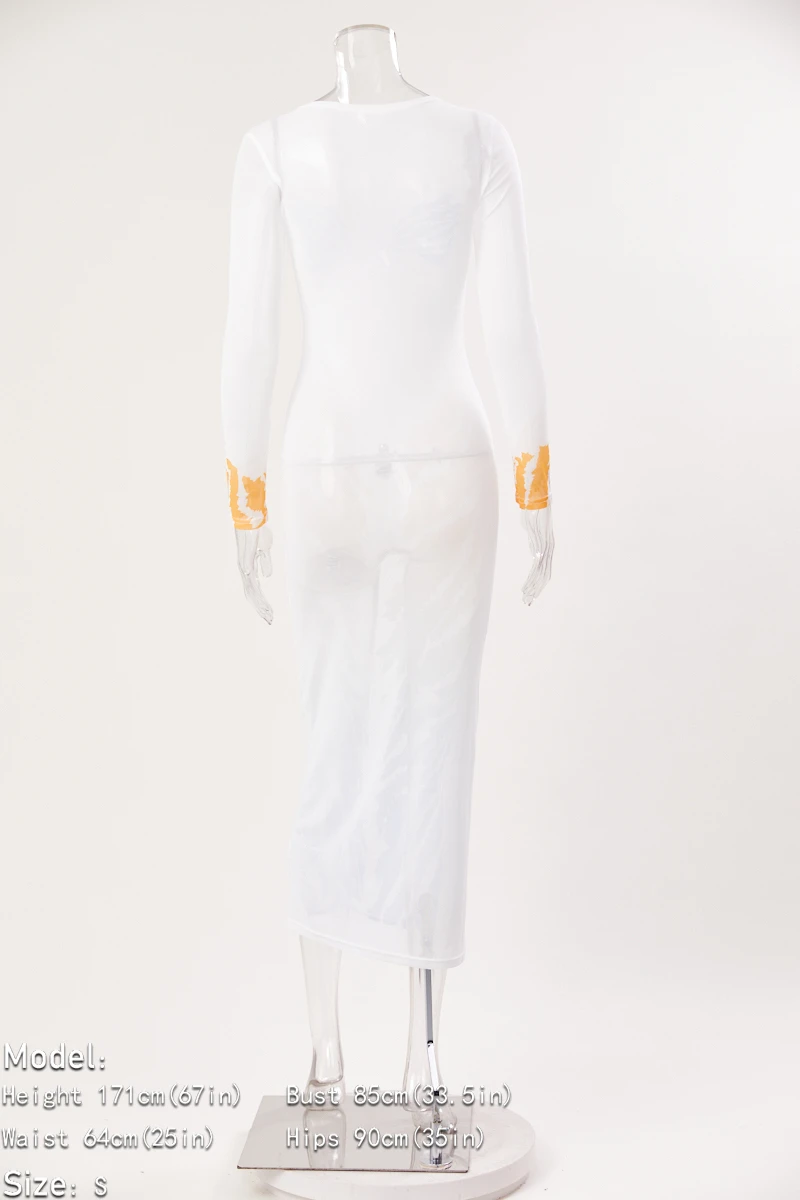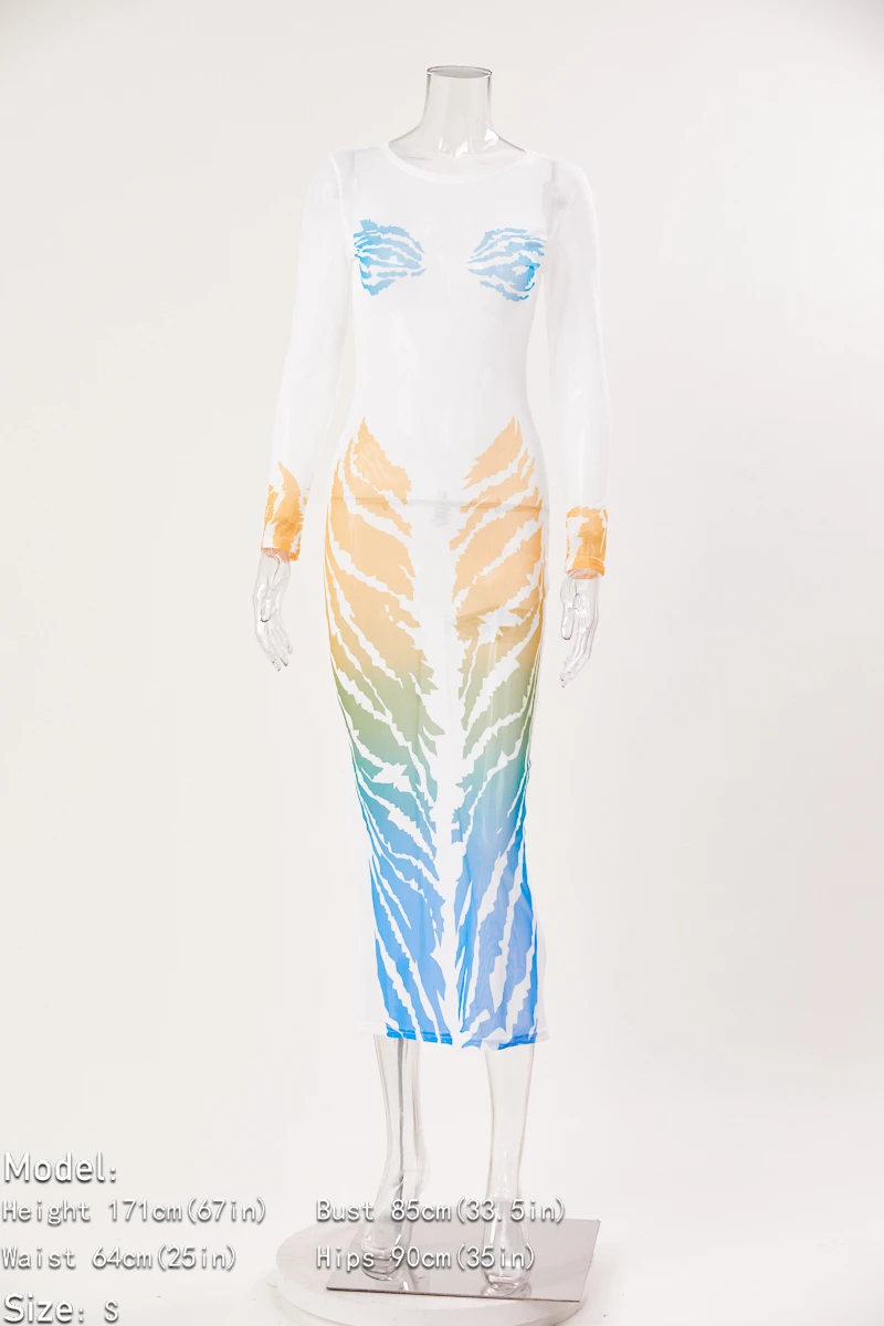 Sexy slight stretch human body printing see-through mesh maxi dress