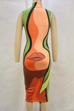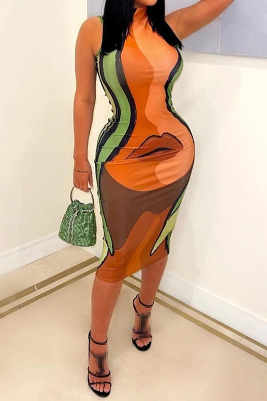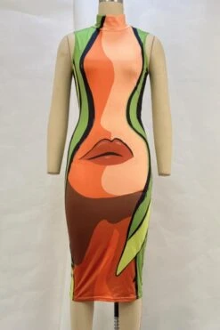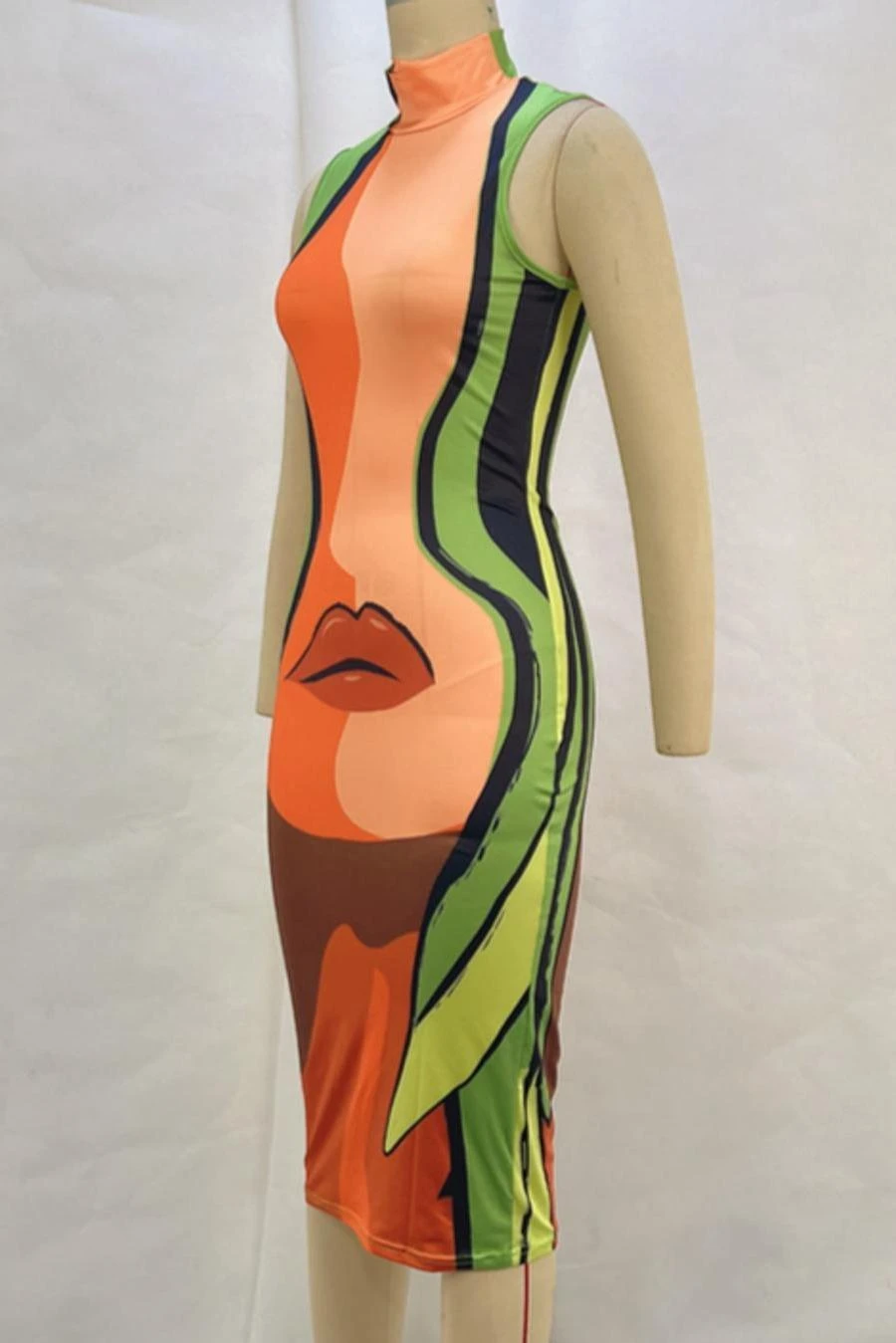 Sexy slight stretch lip fixed printing high collar slim midi dress