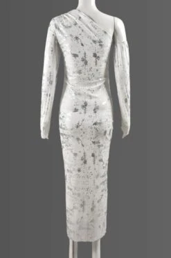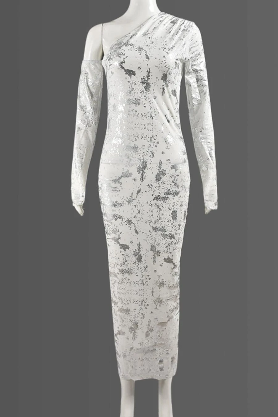 Sexy slight stretch mesh holographic one-shoulder slim midi dress