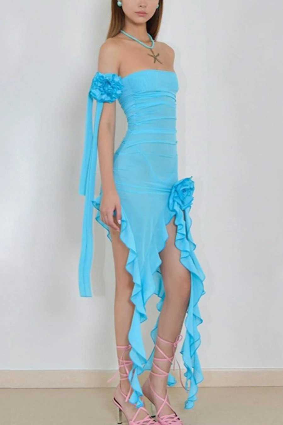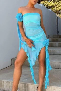 Sexy slight stretch mesh see-through irregular maxi dress(with streamer)