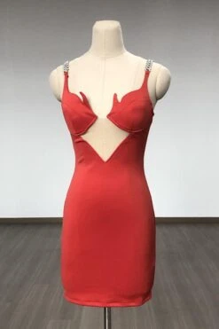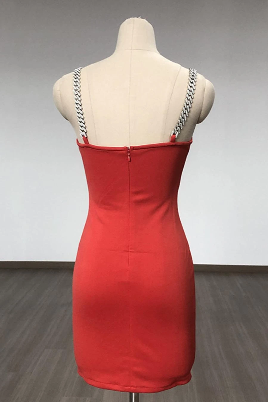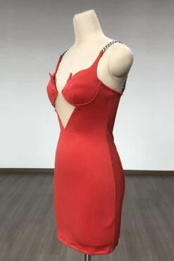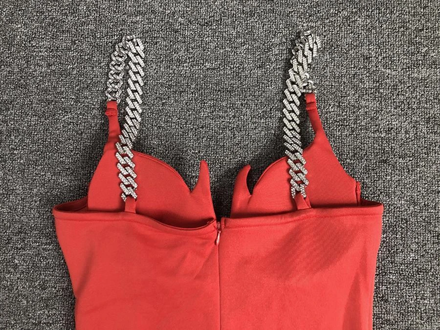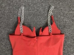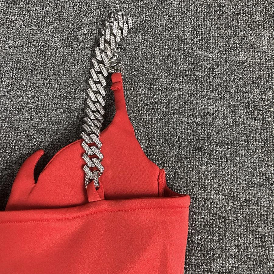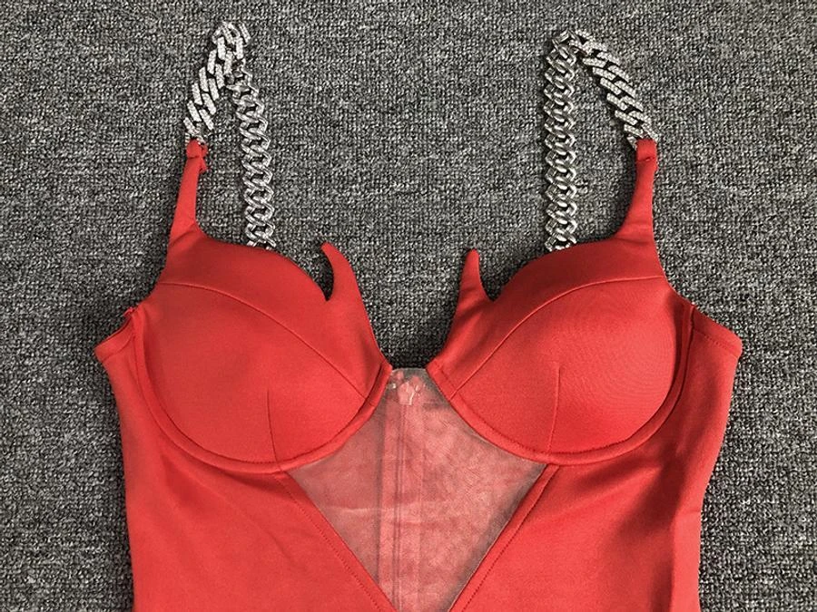 Sexy slight stretch mesh stitching padded metallic chain bodycon mini dress