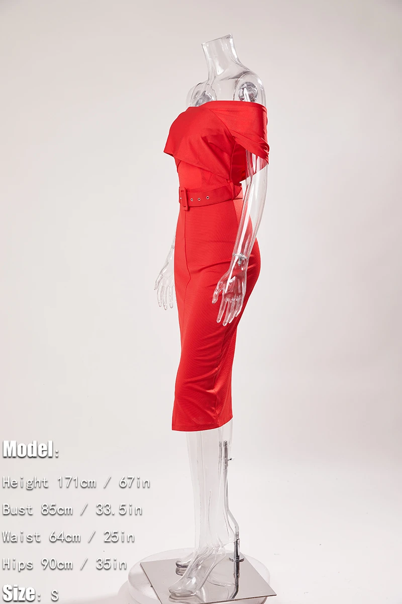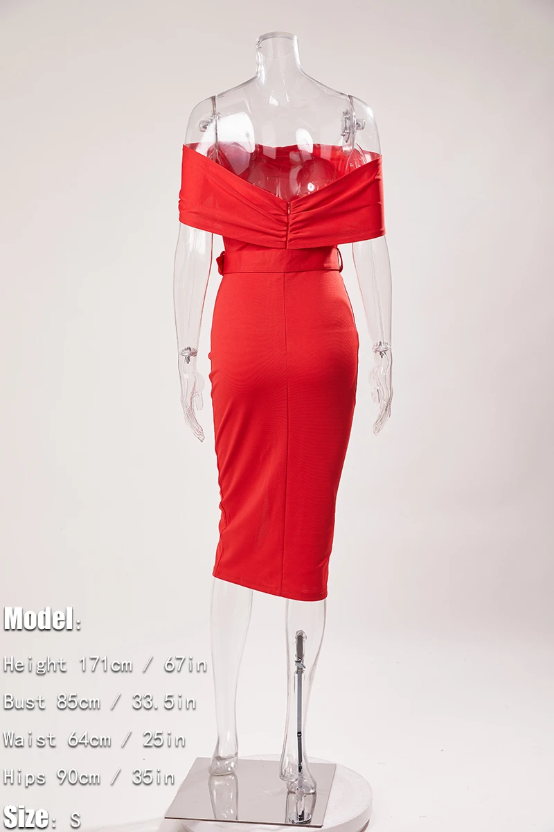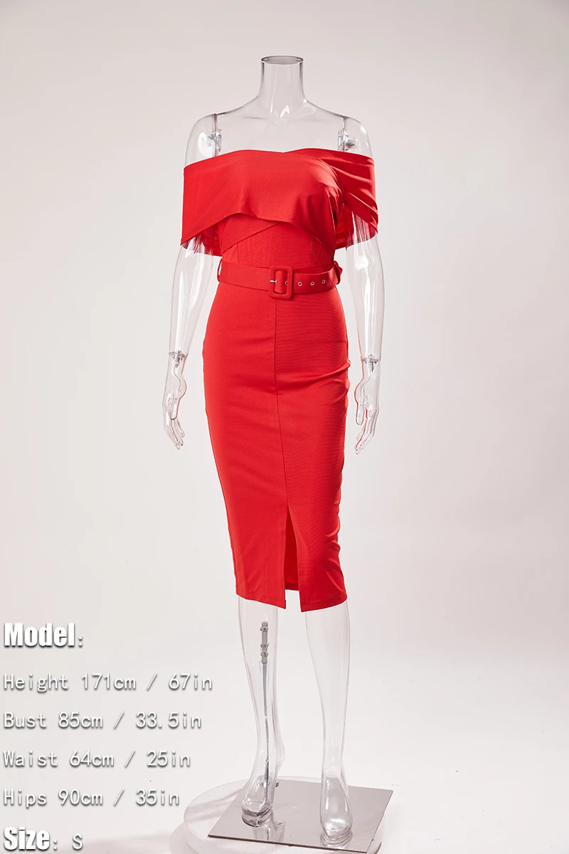 Sexy slight stretch off shoulder solid color with belt slit midi dress