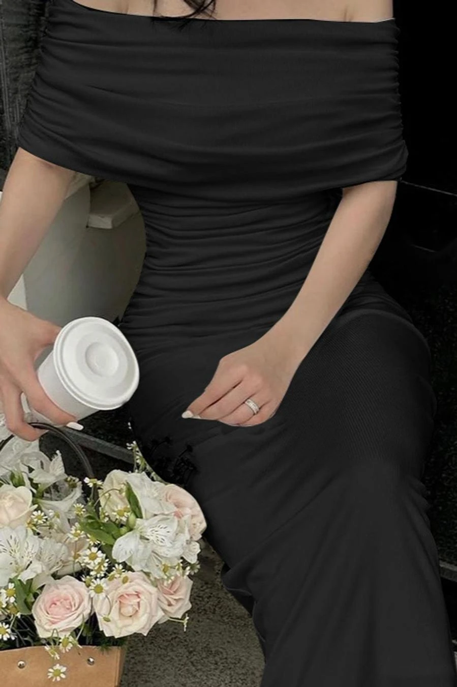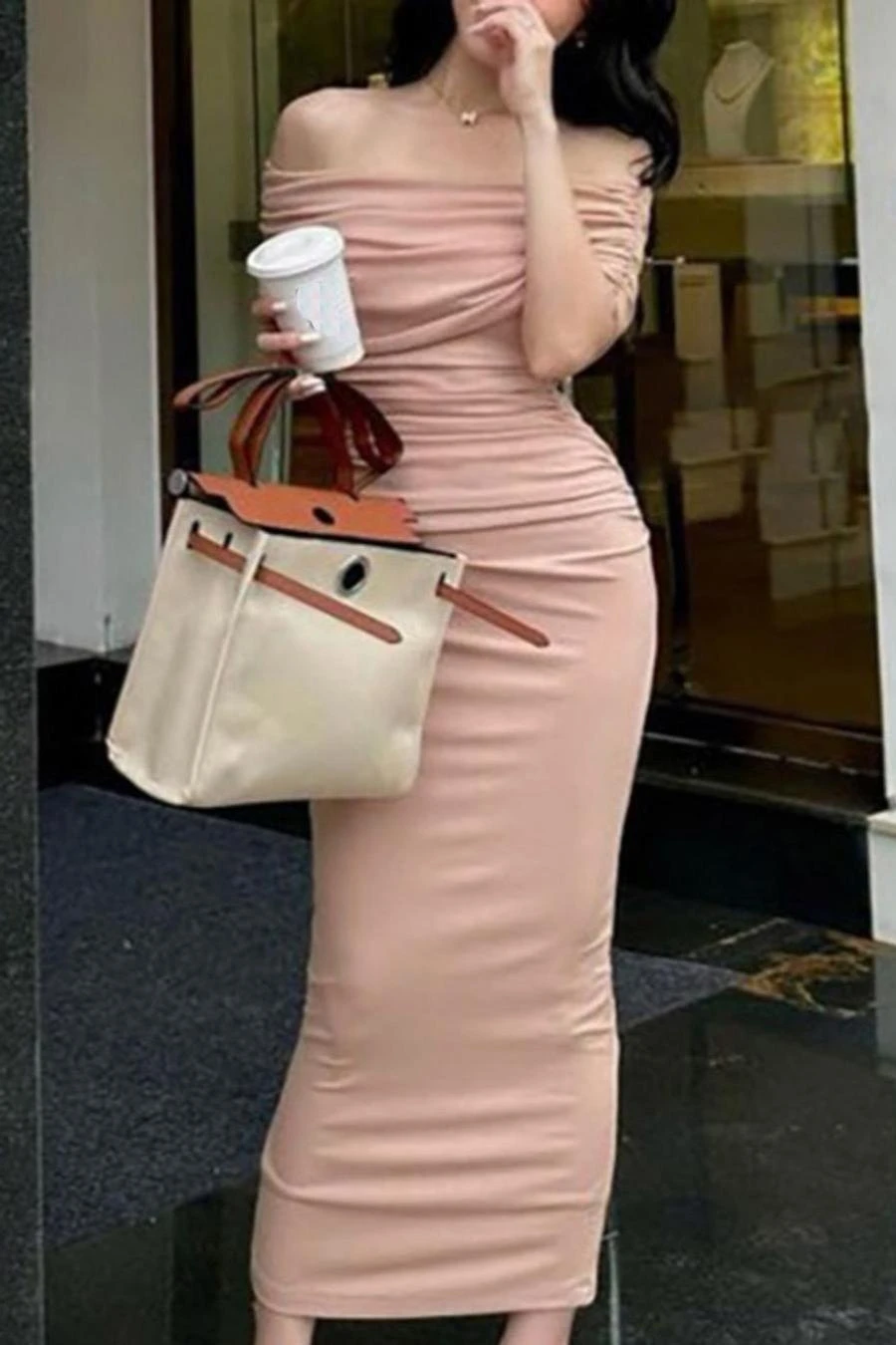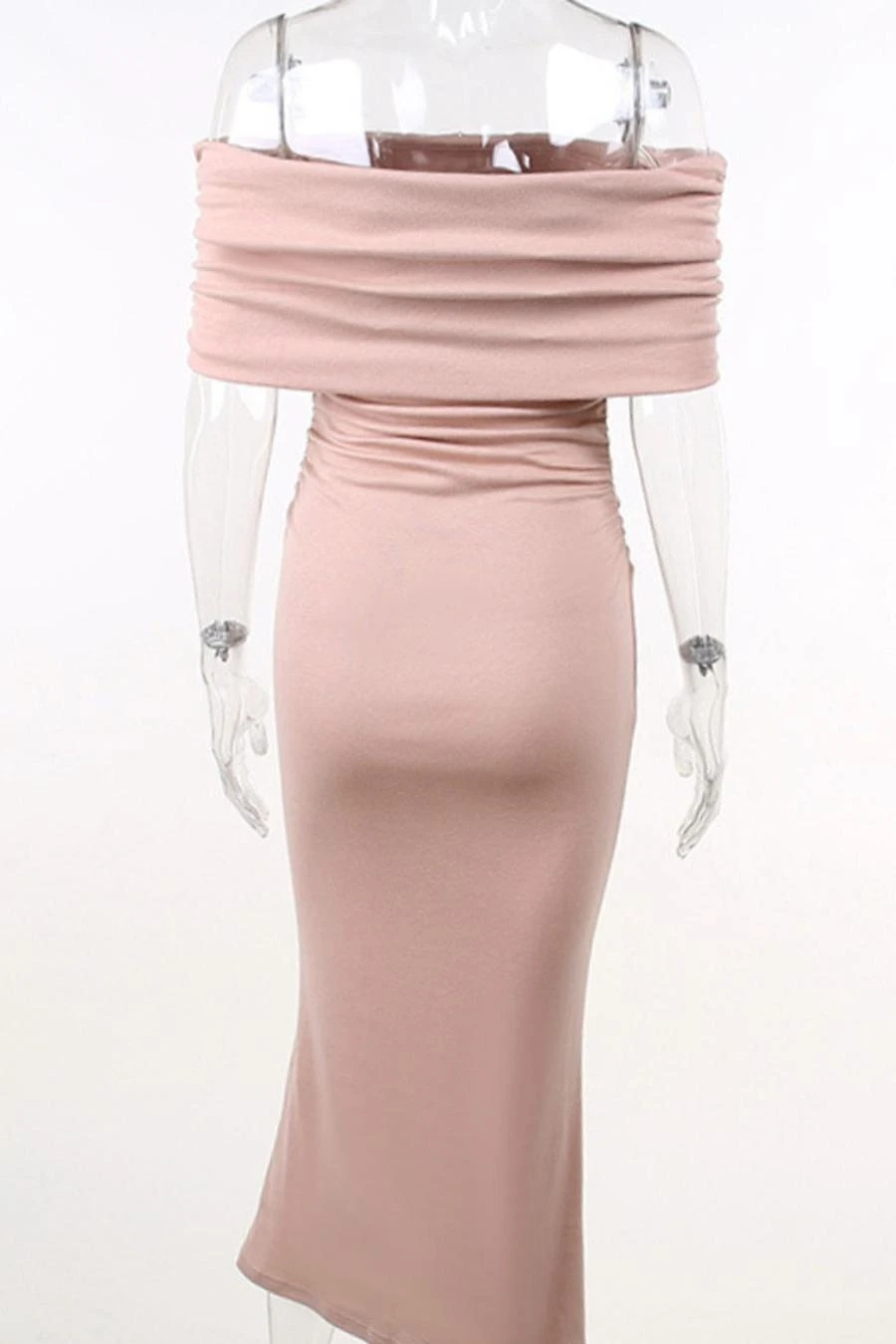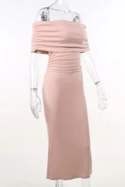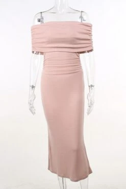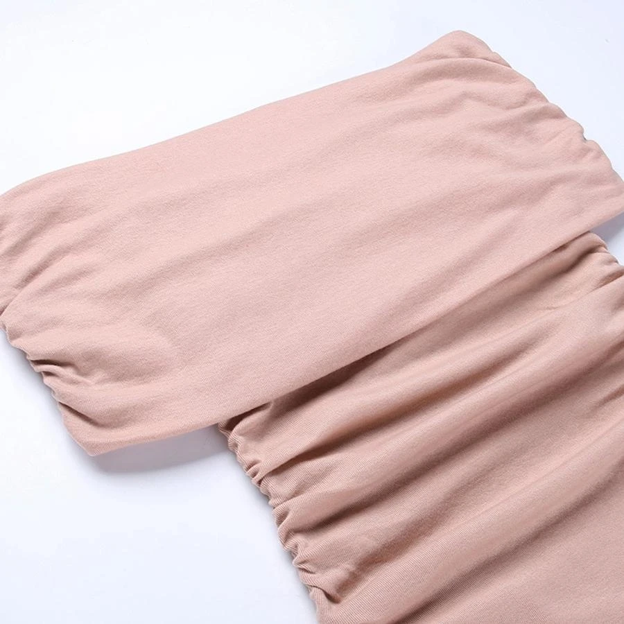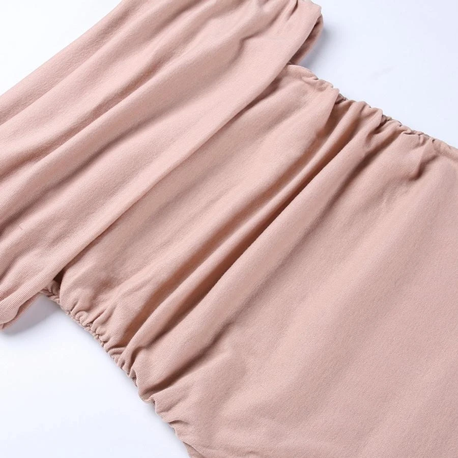 Sexy slight stretch off the shoulder shirring slim midi dress