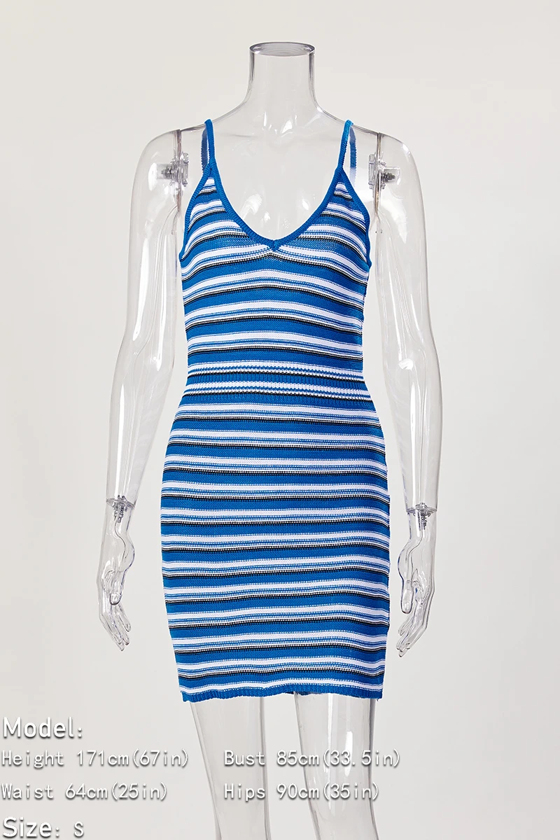 Sexy slight stretch orange stripe knitted low-cut sling bodycon mini dress