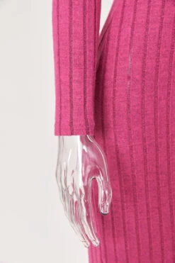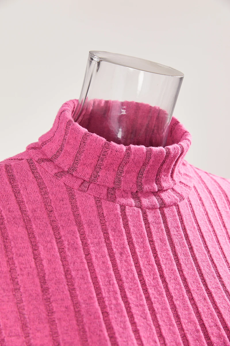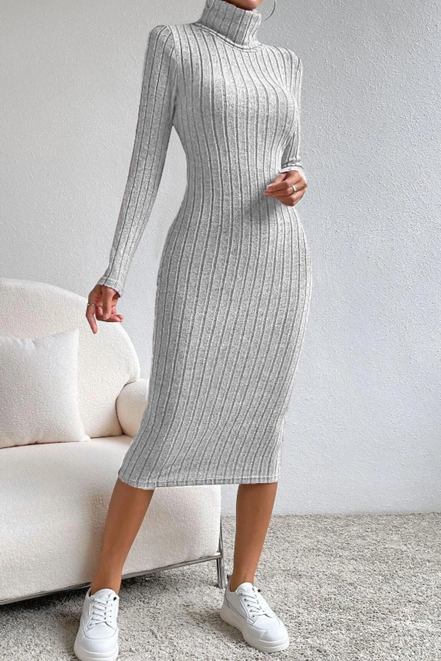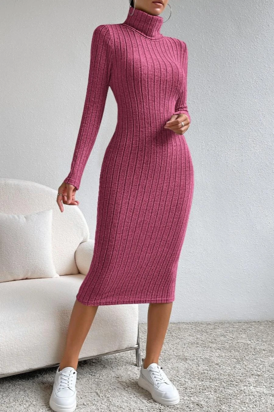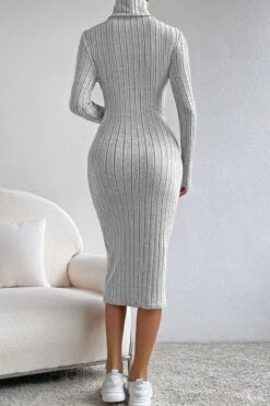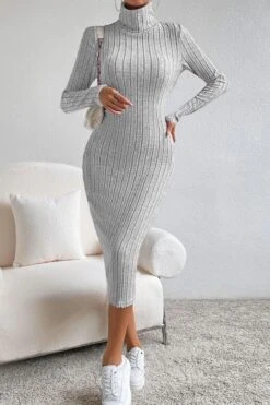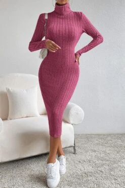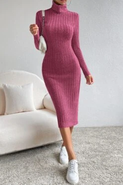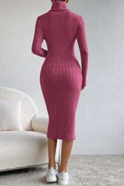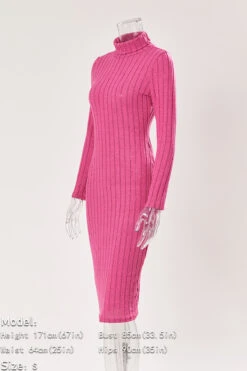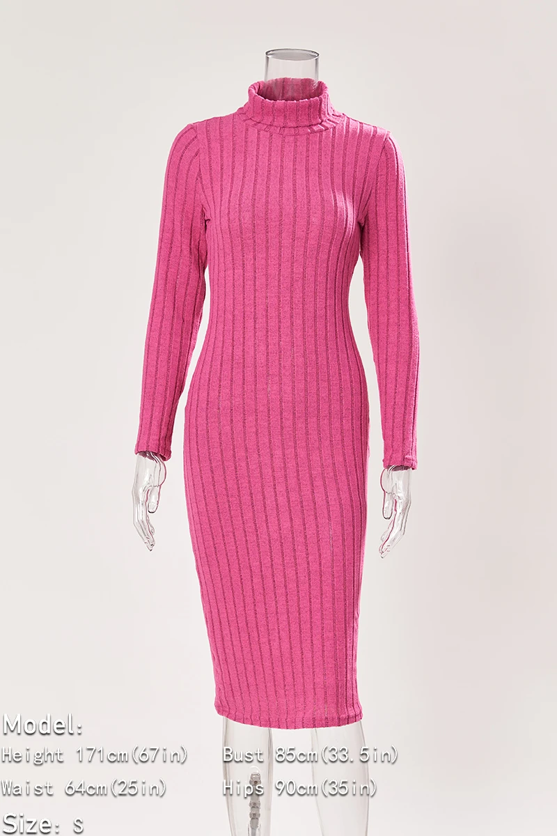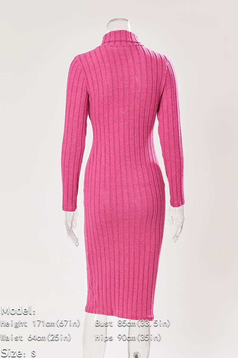 Sexy slight stretch ribbed knit solid color high collar slim midi dress