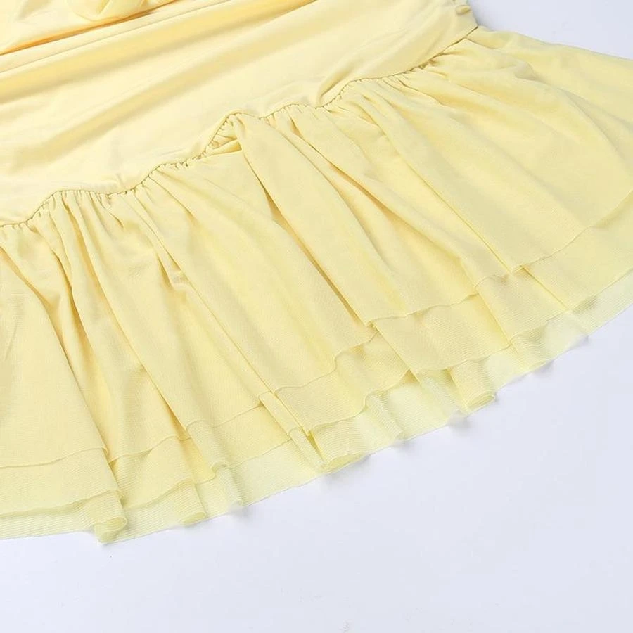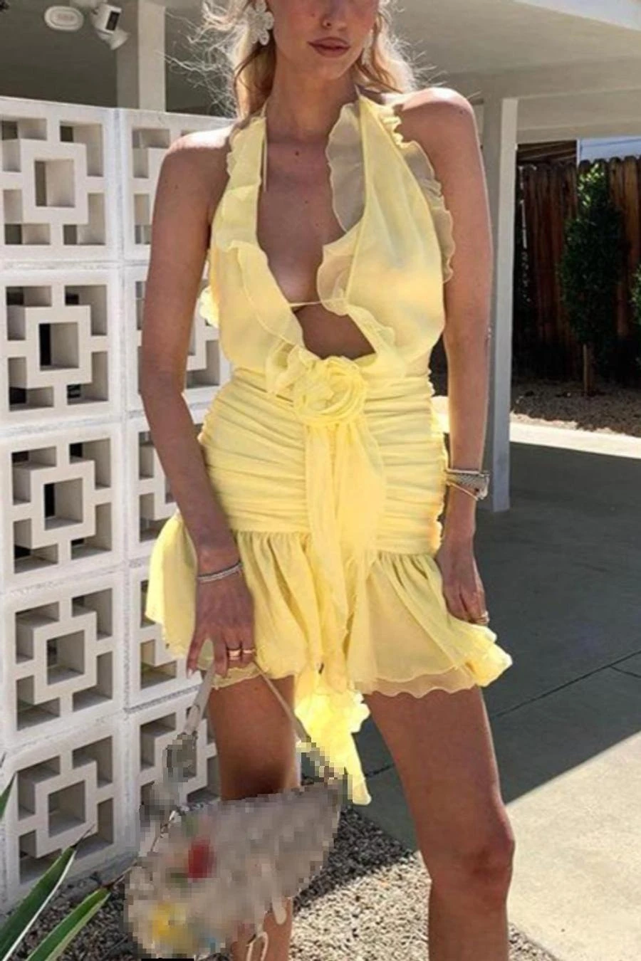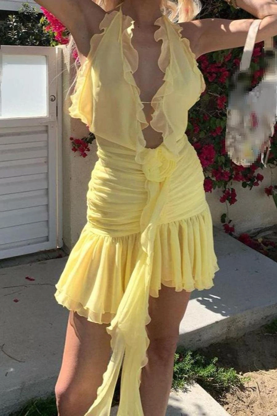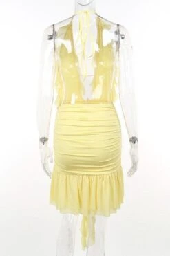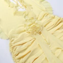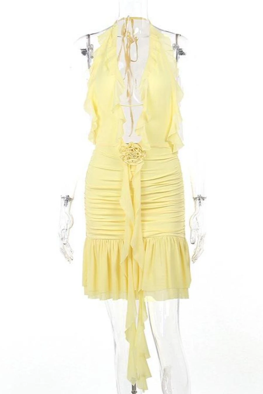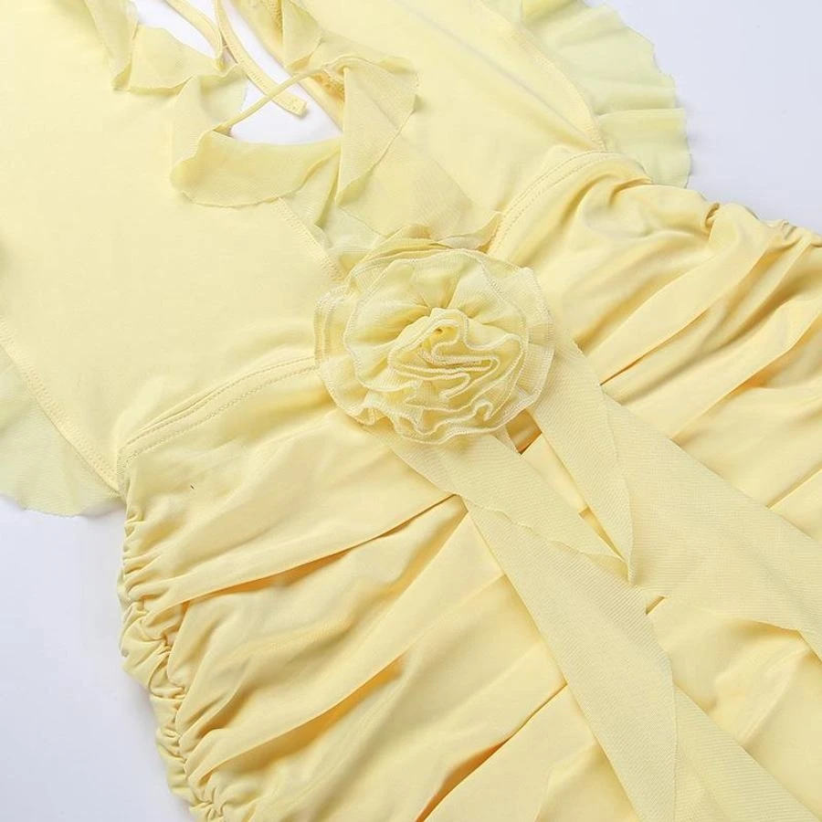 Sexy slight stretch ruffle flower decor halter-neck shirring mini dress